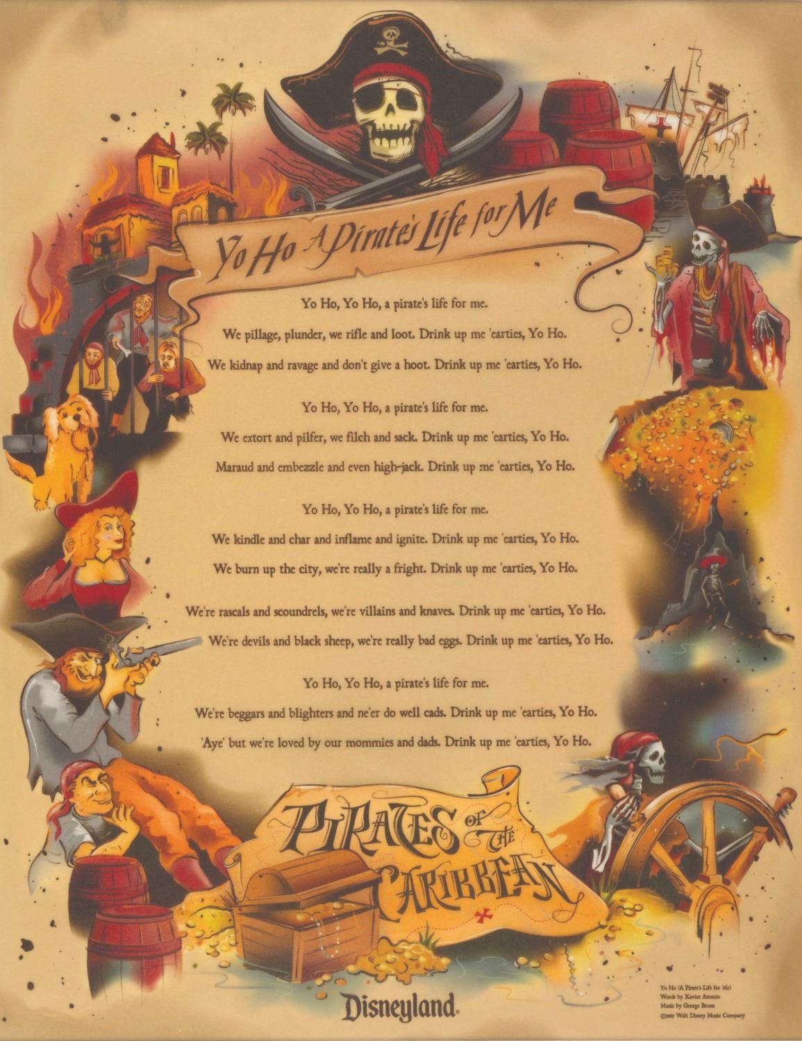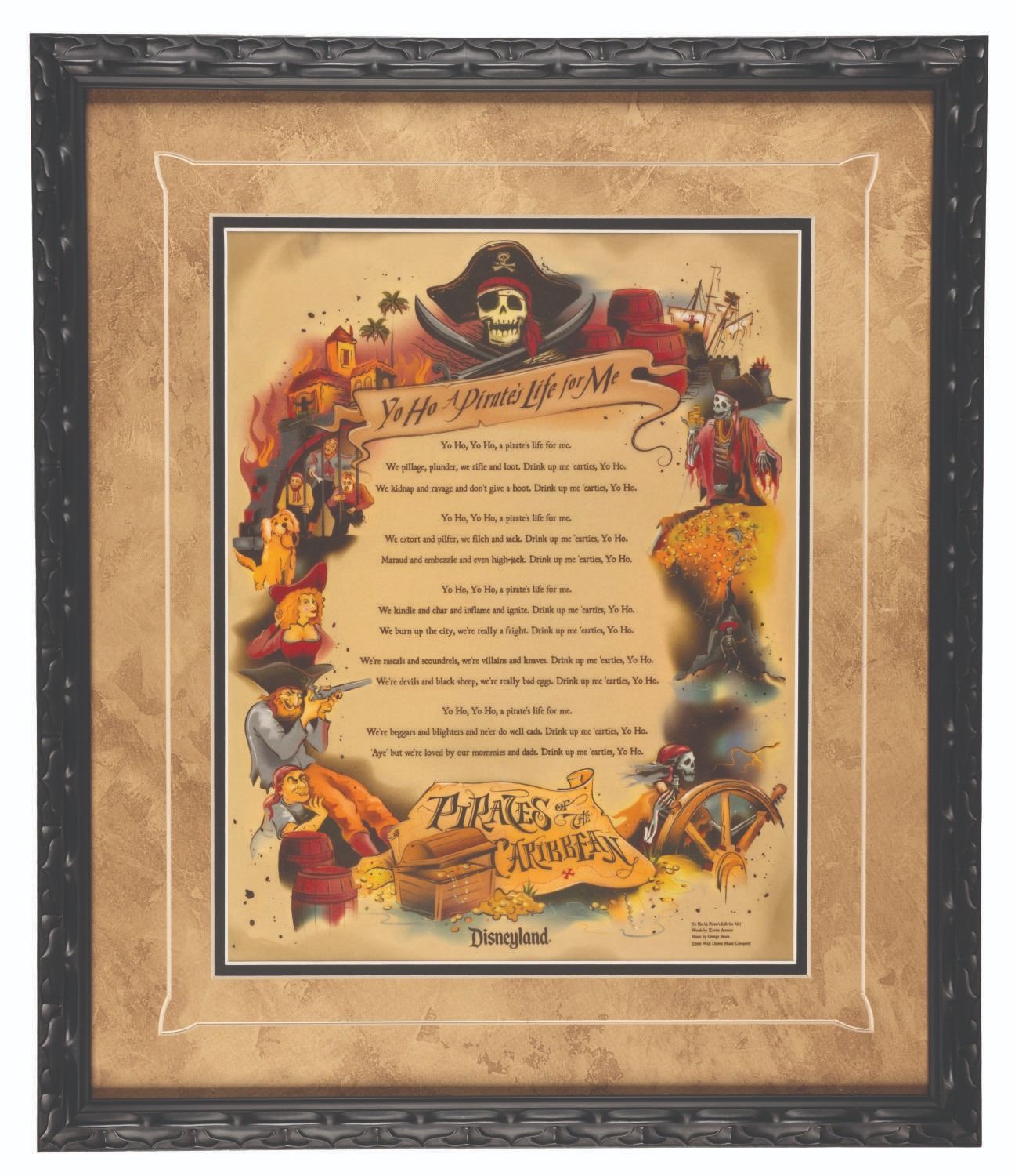(Disney Gallery, 2000s) A framed print of X. Atencio’s full lyrics to “Yo Ho (A Pirates Life For Me)” for the Pirates of the Caribbean. This piece was produced by The Disney Gallery in a total edition size of 300 prints. With an image size of 10.5” x 13.5” within a 13.5” x 20.75” frame, the piece is in fine condition.