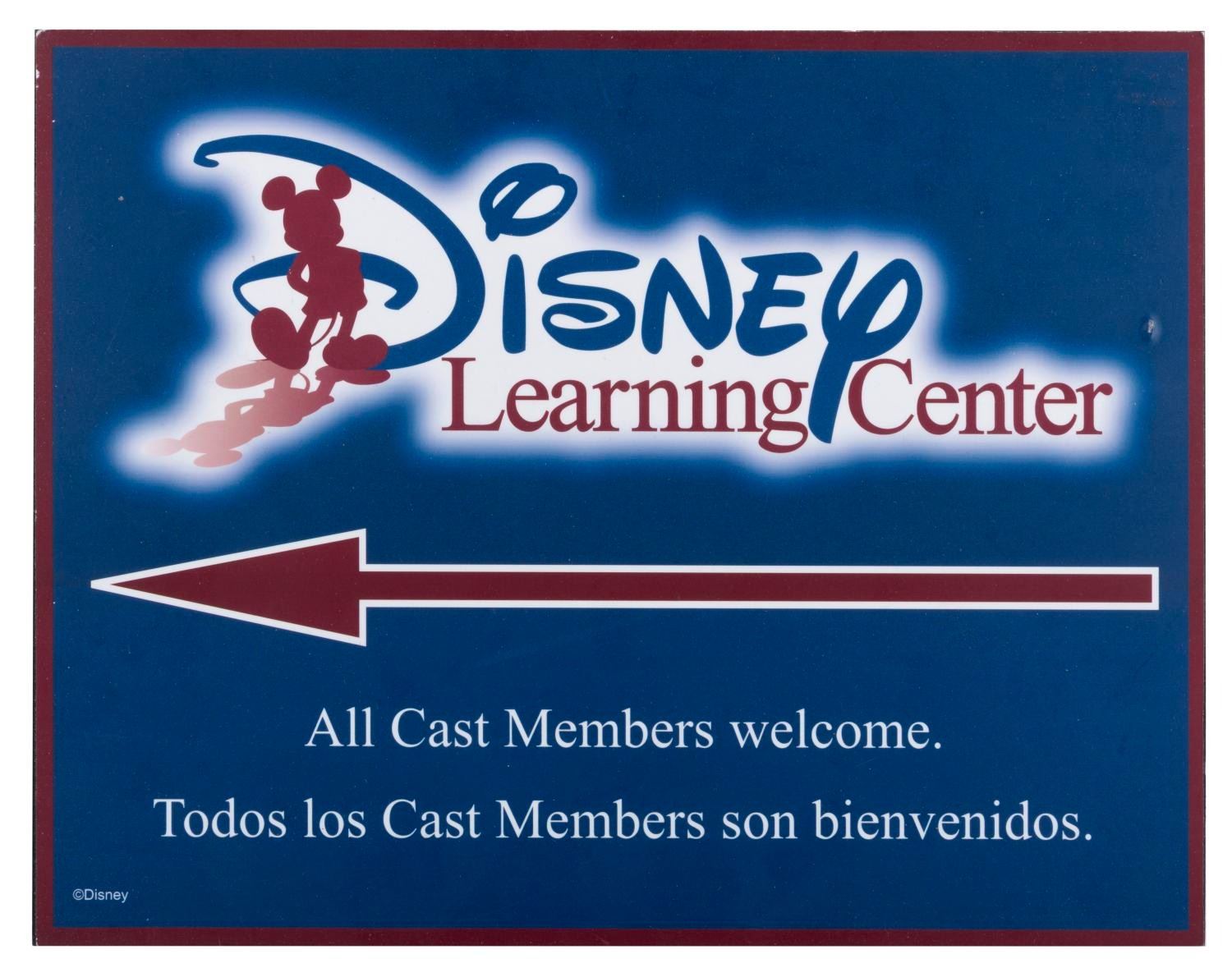 (Walt Disney World, 2000s) A directional sign for the Disney Learning Center, a part of the Disney University training program. Measuring 11" x 14", the sign is in good Park-used condition with scuffing, scratches, dents, edge wear, and light soiling.