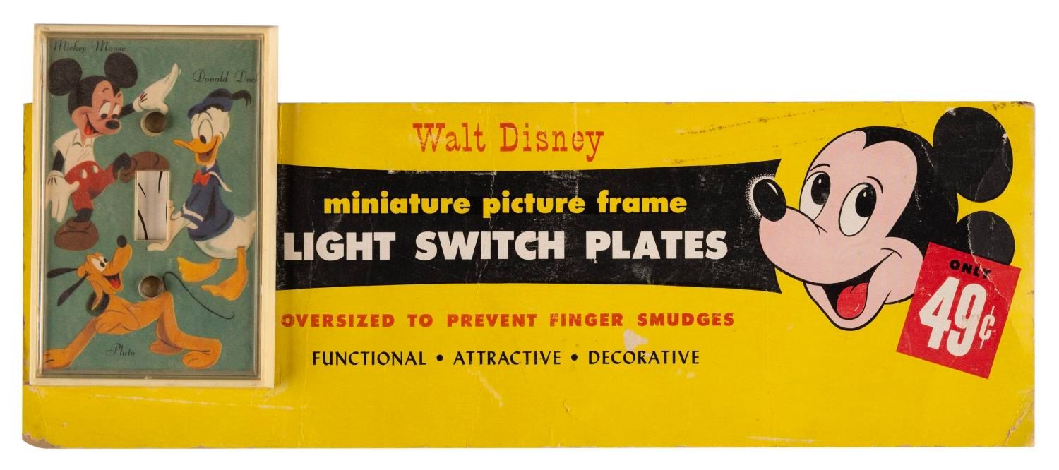 (Disney, 1960s) A paper display sign promoting Disney Light Switch Plates paired with an example light switch plate. The 14.5" x 5" heavy paper sign is in good condition with creases and chipping to the paper. The 3.5" x 5" switch plate is also in good condition with fading and cloudiness from age.