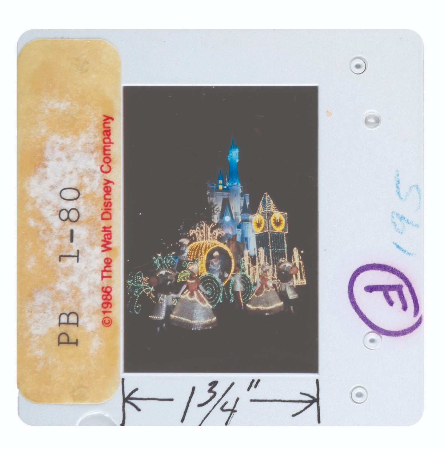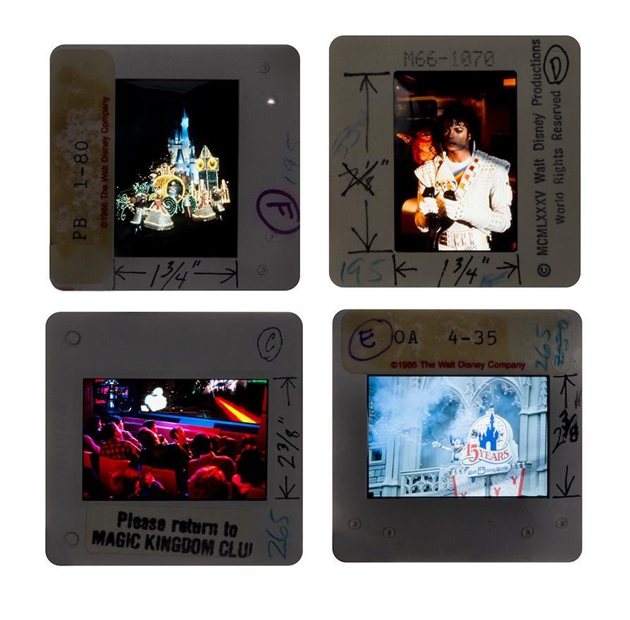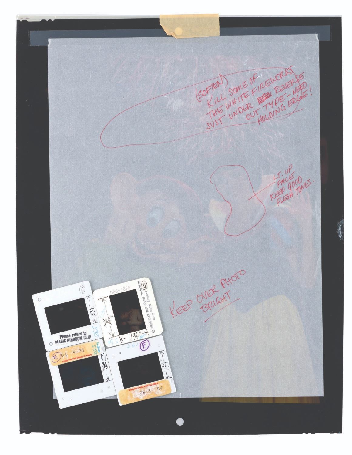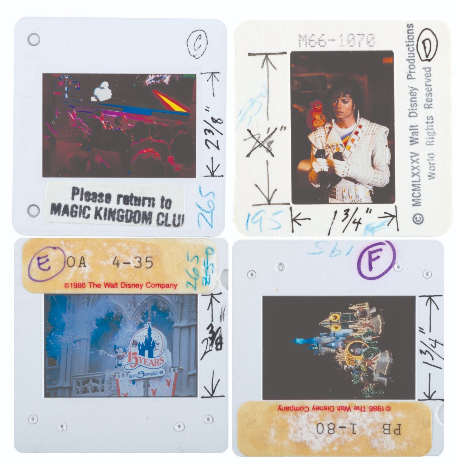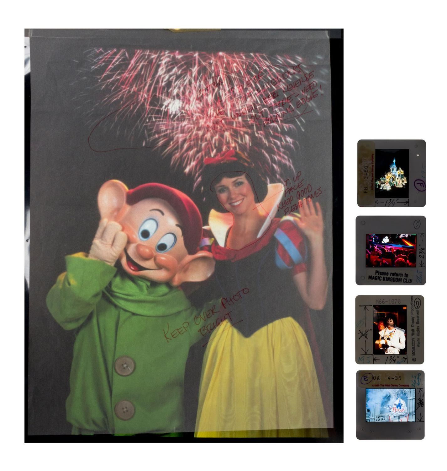 (Disneyland/Walt Disney World, 1980s) A beautiful film transparency with four slides that were used in advertising and promotion of Disneyland and Walt Disney World during the mid-to-late 1980s. The film transparency features a vibrant image of Snow White and Dopey characters in the Park with fireworks overhead. The slides include images of the Main Street Electrical Parade, Mickey in the Park, Star Tours, and Michael Jackson as Captain EO. The transparency measuring 11" x 14" and the slides measuring 2" x 2" are all in very good condition with minor handling from use.