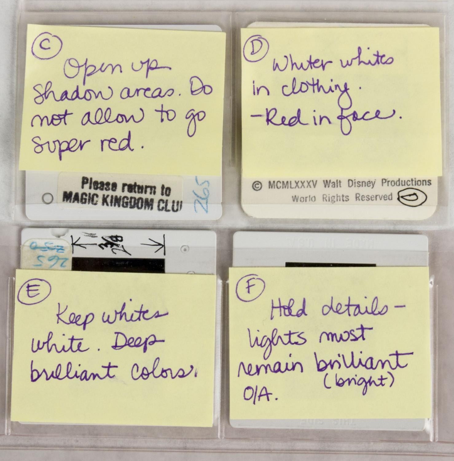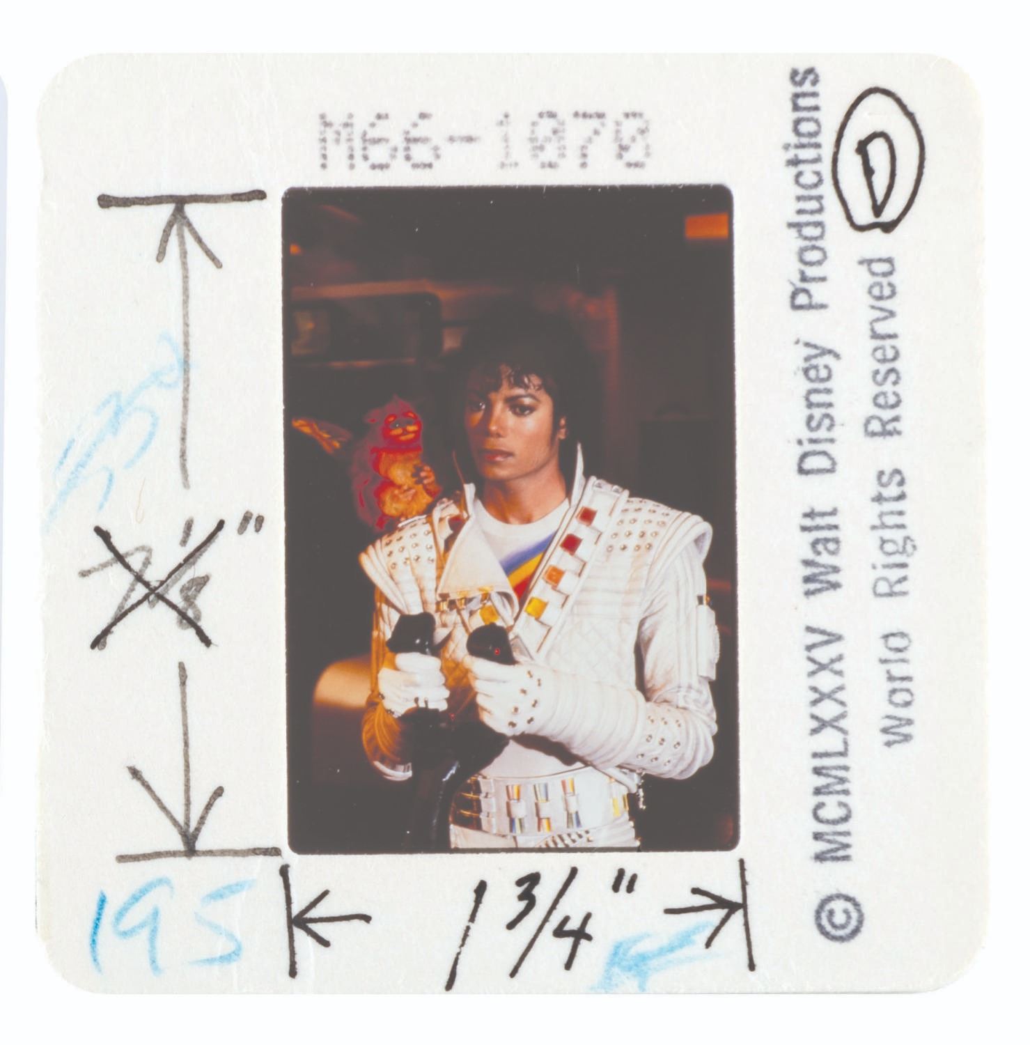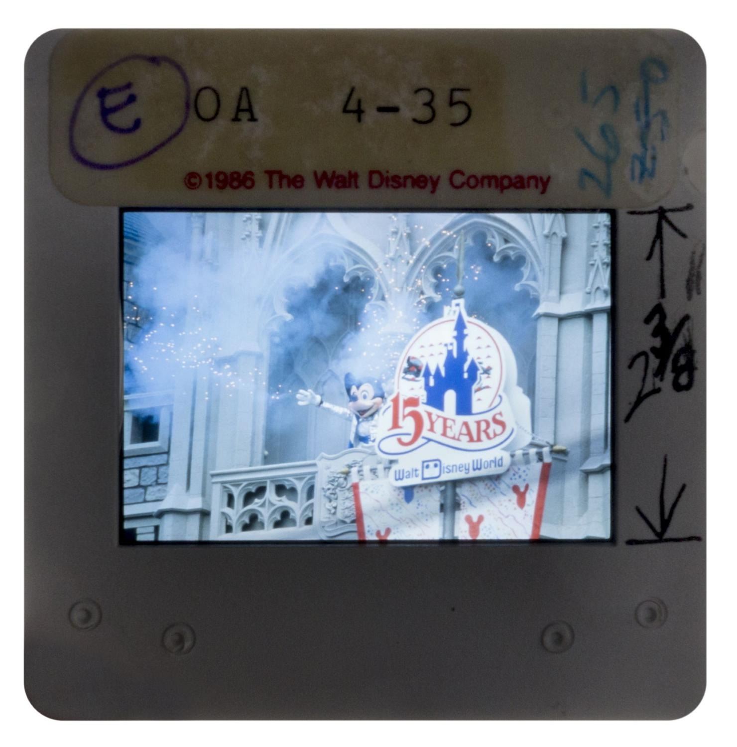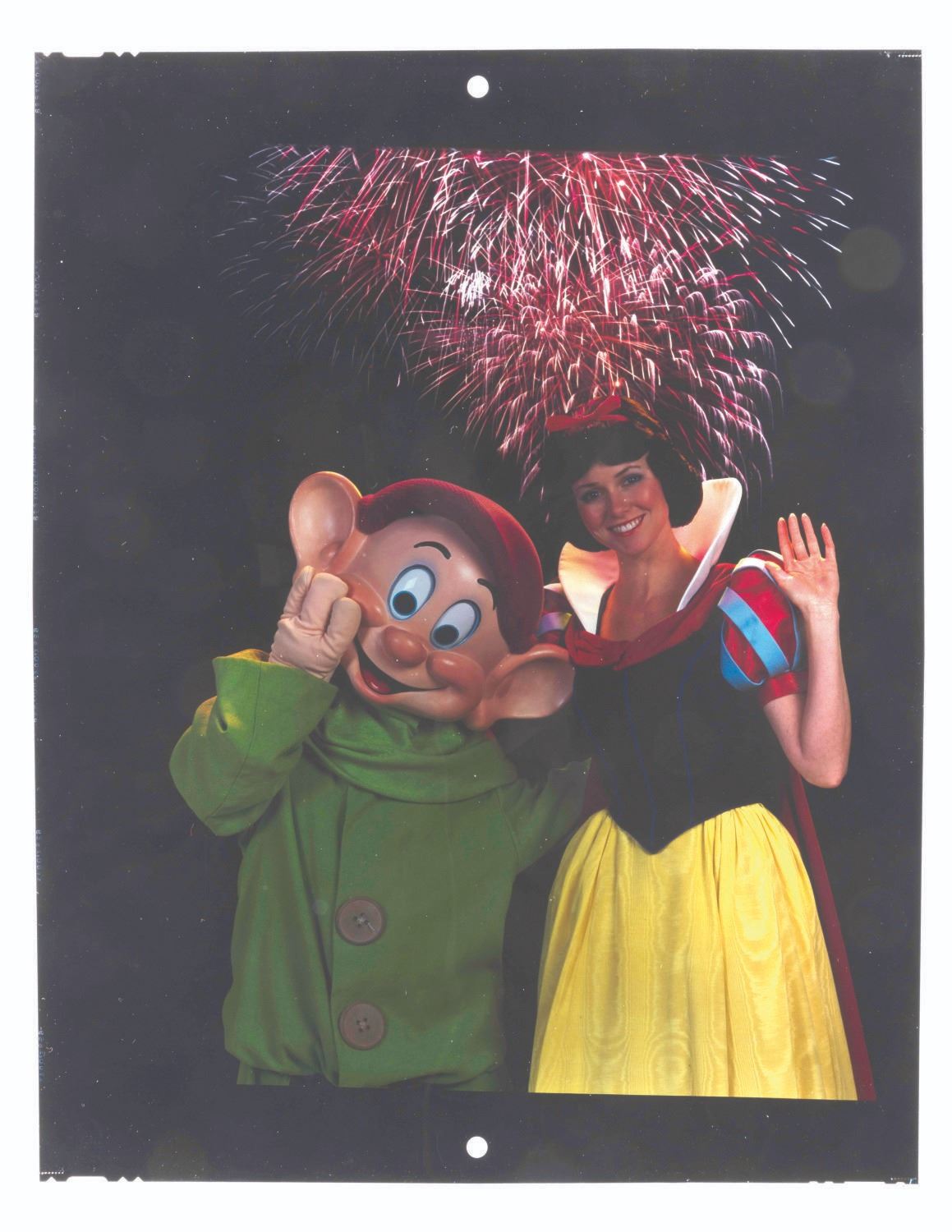 (Disneyland/Walt Disney World, 1980s) A beautiful film transparency with four slides that were used in advertising and promotion of Disneyland and Walt Disney World during the mid-to-late 1980s. The film transparency features a vibrant image of Snow White and Dopey characters in the Park with fireworks overhead. The slides include images of the Main Street Electrical Parade, Mickey in the Park, Star Tours, and Michael Jackson as Captain EO. The transparency measuring 11" x 14" and the slides measuring 2" x 2" are all in very good condition with minor handling from use.