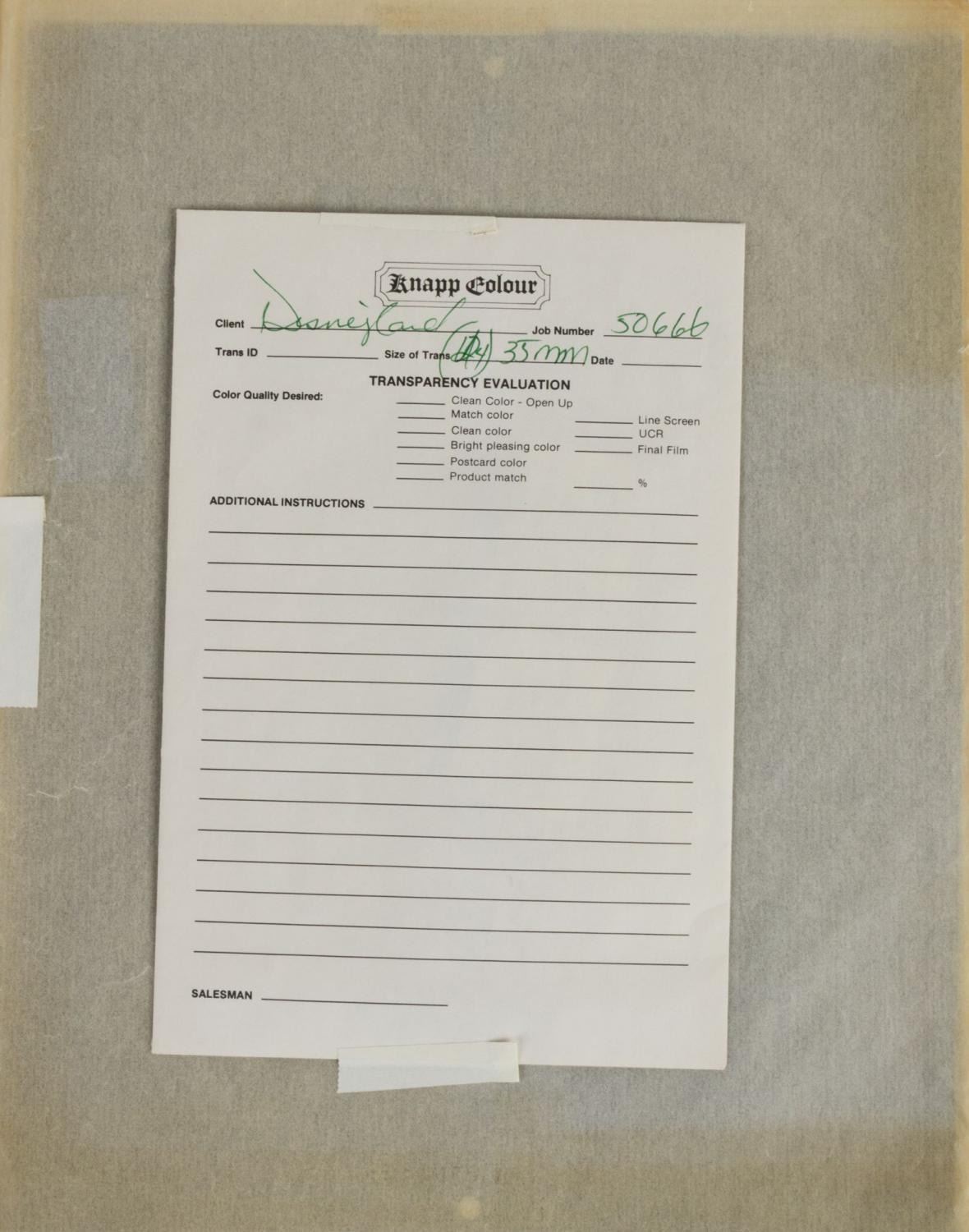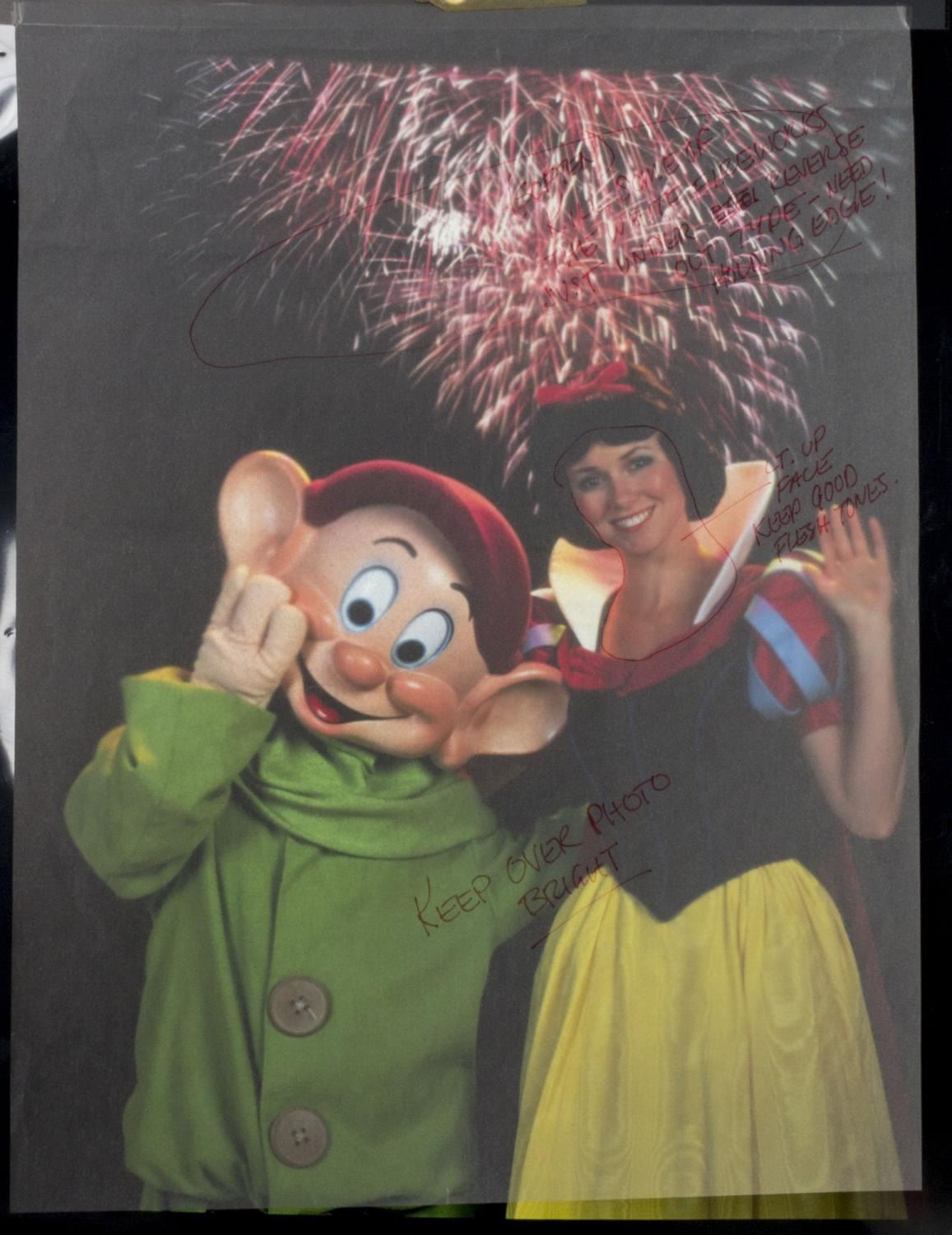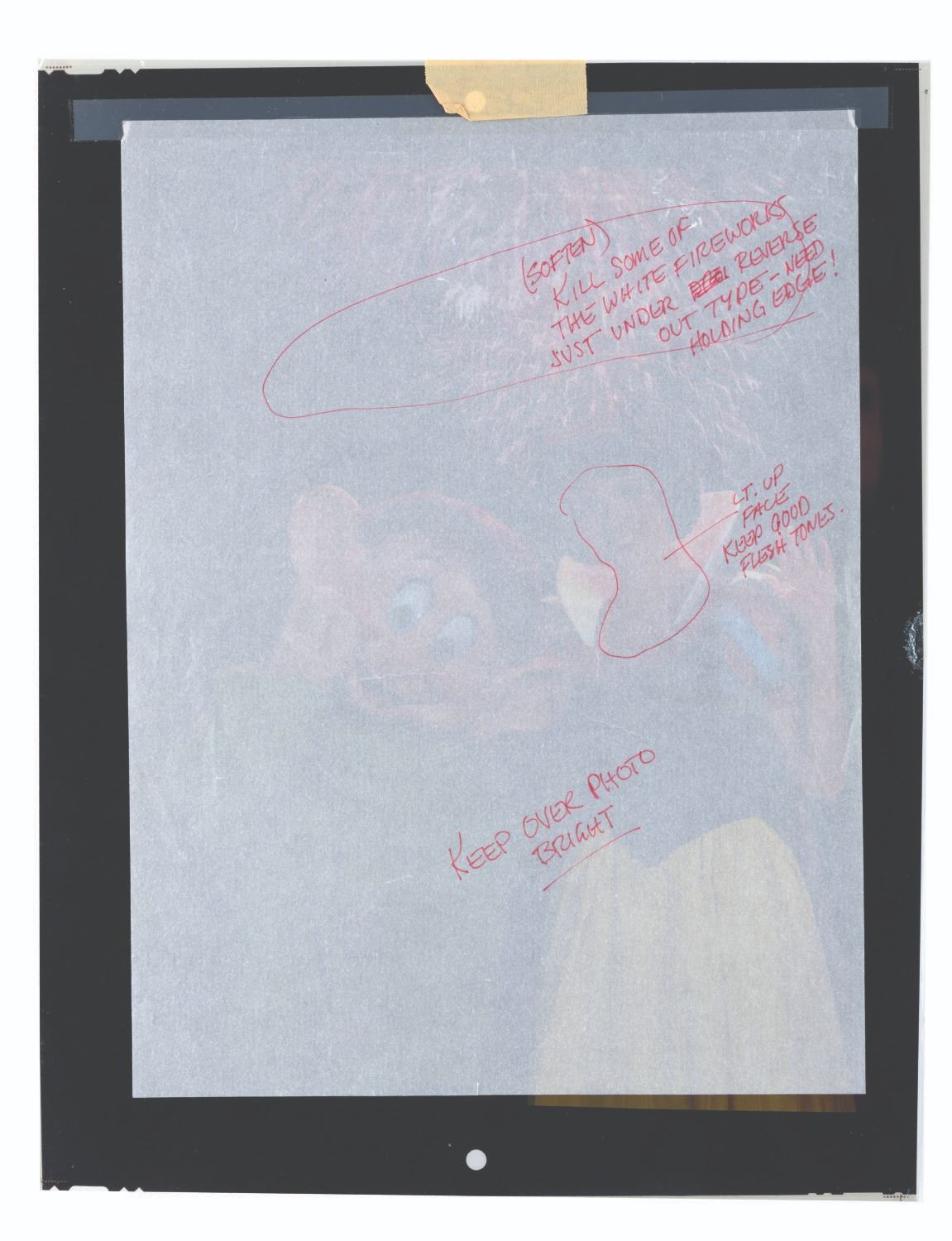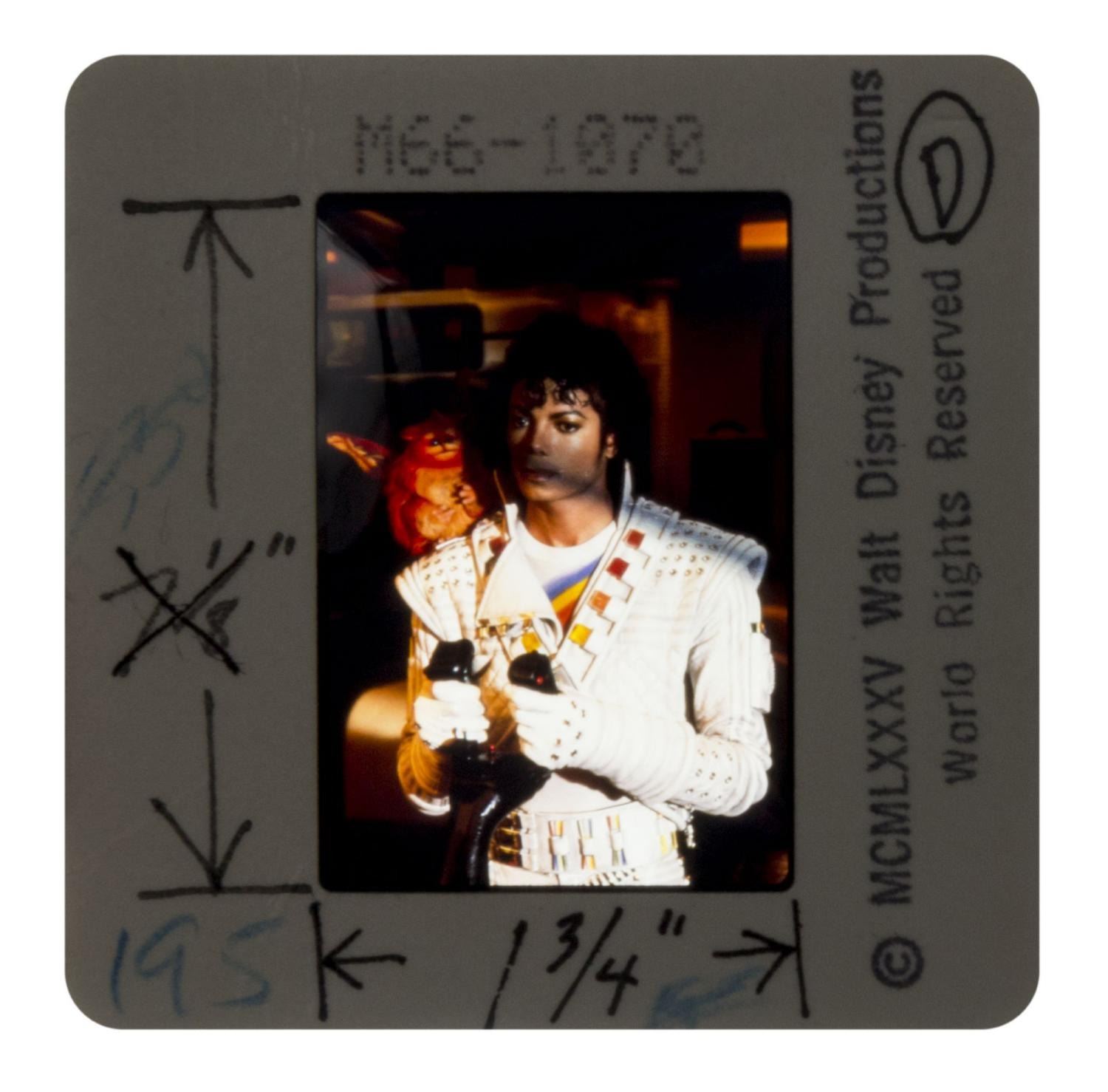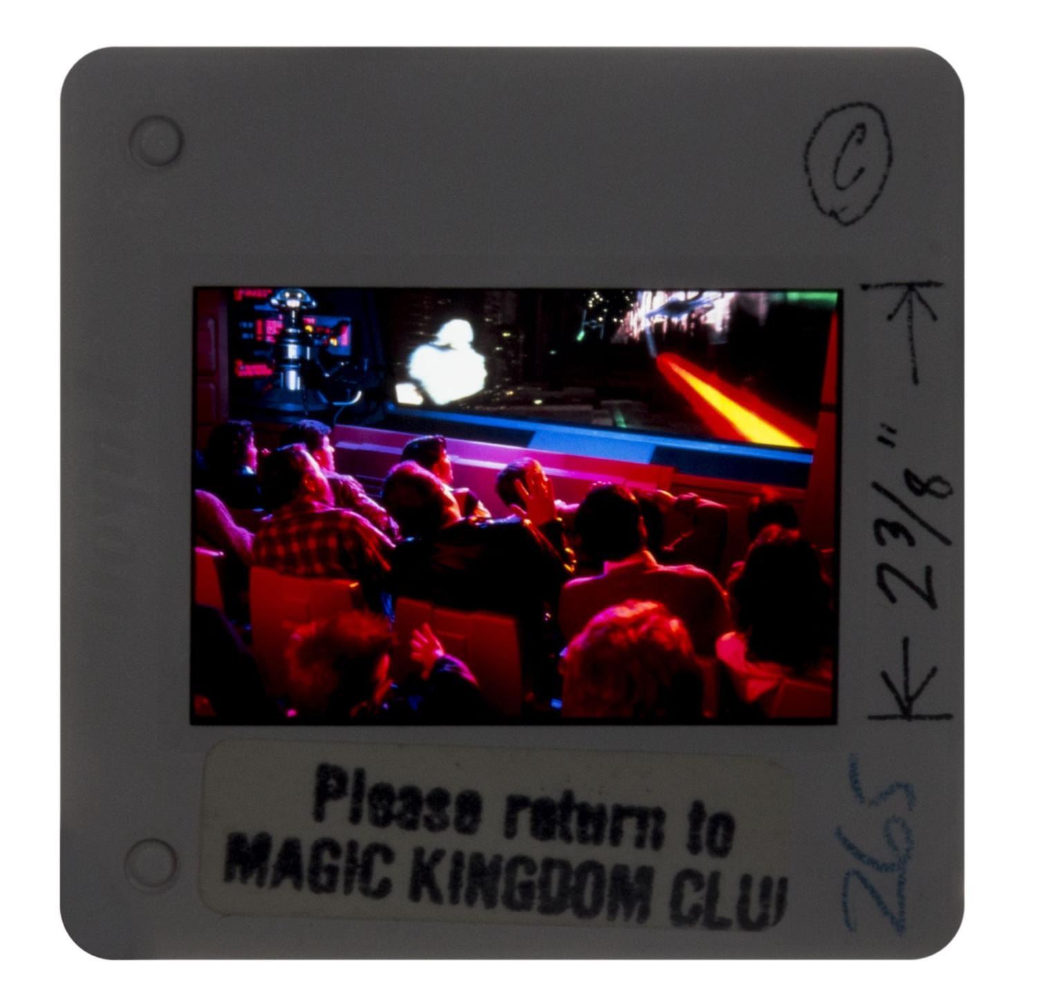 (Disneyland/Walt Disney World, 1980s) A beautiful film transparency with four slides that were used in advertising and promotion of Disneyland and Walt Disney World during the mid-to-late 1980s. The film transparency features a vibrant image of Snow White and Dopey characters in the Park with fireworks overhead. The slides include images of the Main Street Electrical Parade, Mickey in the Park, Star Tours, and Michael Jackson as Captain EO. The transparency measuring 11" x 14" and the slides measuring 2" x 2" are all in very good condition with minor handling from use.