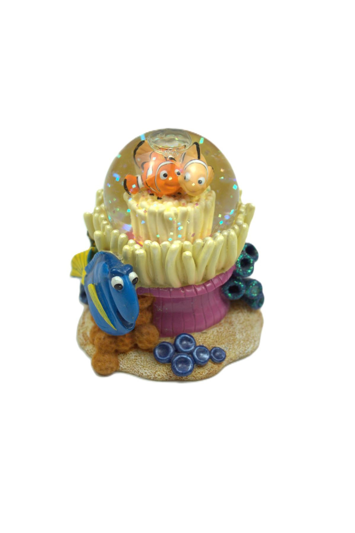 This is a small Disney Parks Finding Nemo snow globe including many of the characters from the hit Disney/Pixar film of the same name. Marlin and Nemo are inside the globe and Dory and Nemo's school friends are on the outside. It is in like new condition and measures ~3" high and 3" wide.