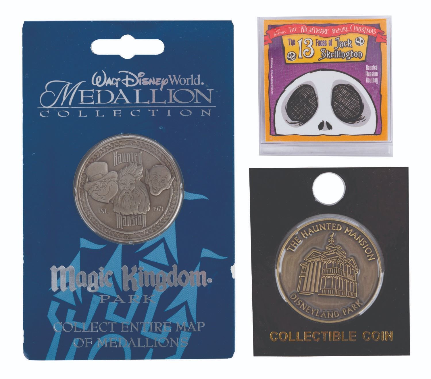 (Disneyland/WDI, 2000s) A Disney Parks Haunted Mansion three-coin collection including coins of Walt Disney Imagineering, "13 Faces of Jack Skellington," and a Walt Disney World Haunted Mansion Medallion. Each piece is in fine condition in its original package.