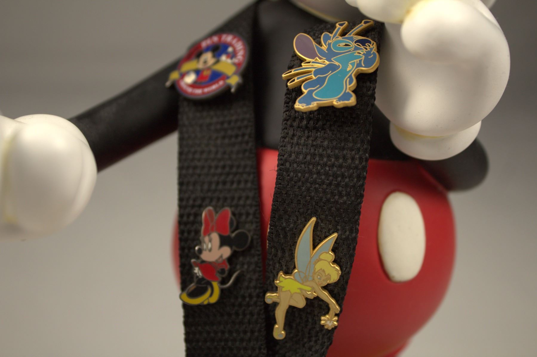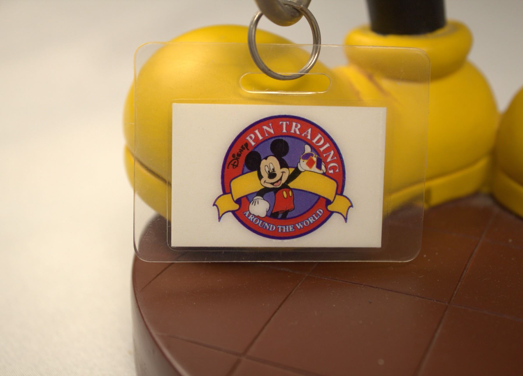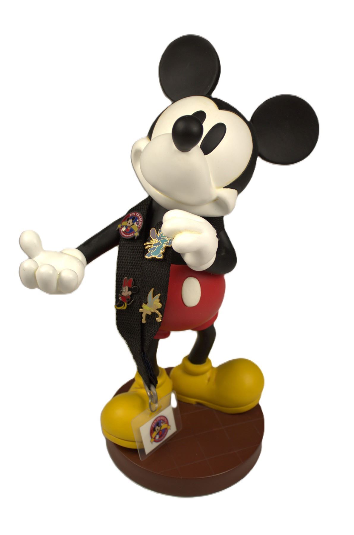(Disney Parks, 2002) This is an extremely rare Mickey Mouse figure. Mickey is holding his pin trading lanyard and showing off his pin collection. The original pins are included and feature characters such as Stitch, Tinker Bell, Minnie Mouse and the official Mickey Mouse Pin Trading around the World pin. This year marks the 25th anniversary of official pin trading at Disney Parks. It stands 13.5" tall.