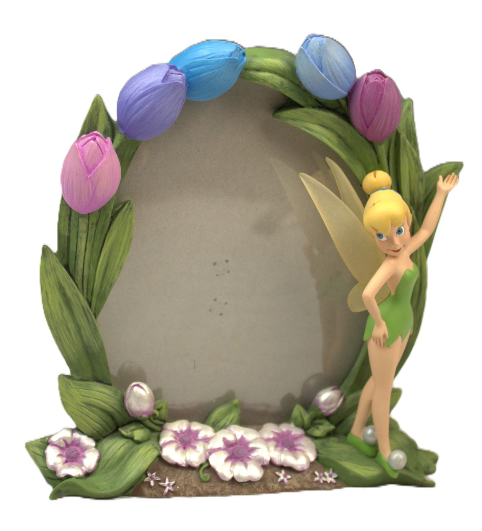 This Disney Tinker Bell resin photo frame is designed to hold a 3" x 5" photograph. It features Tinker Bell with Tulip flower accents.