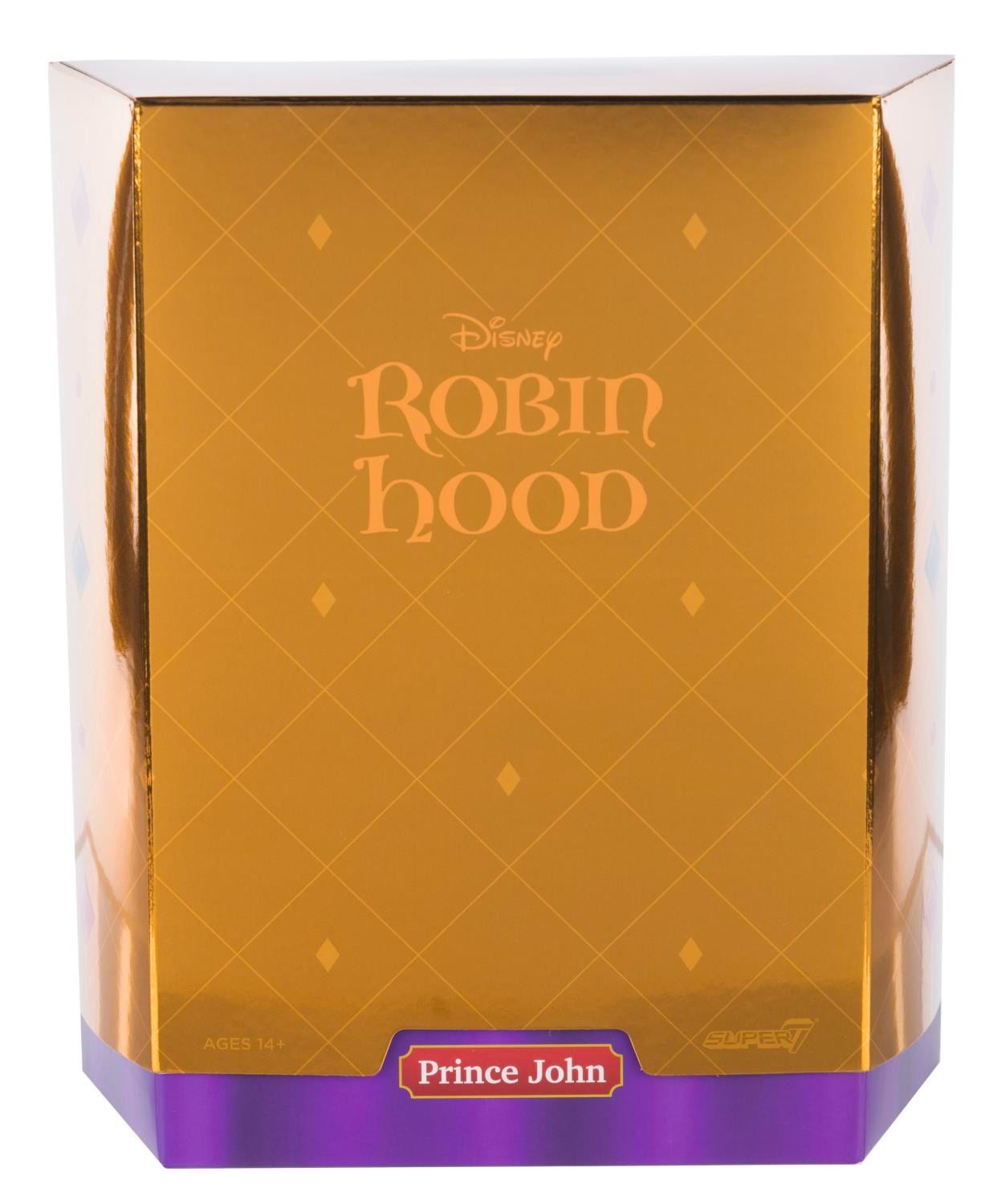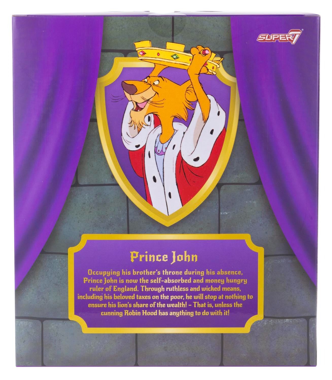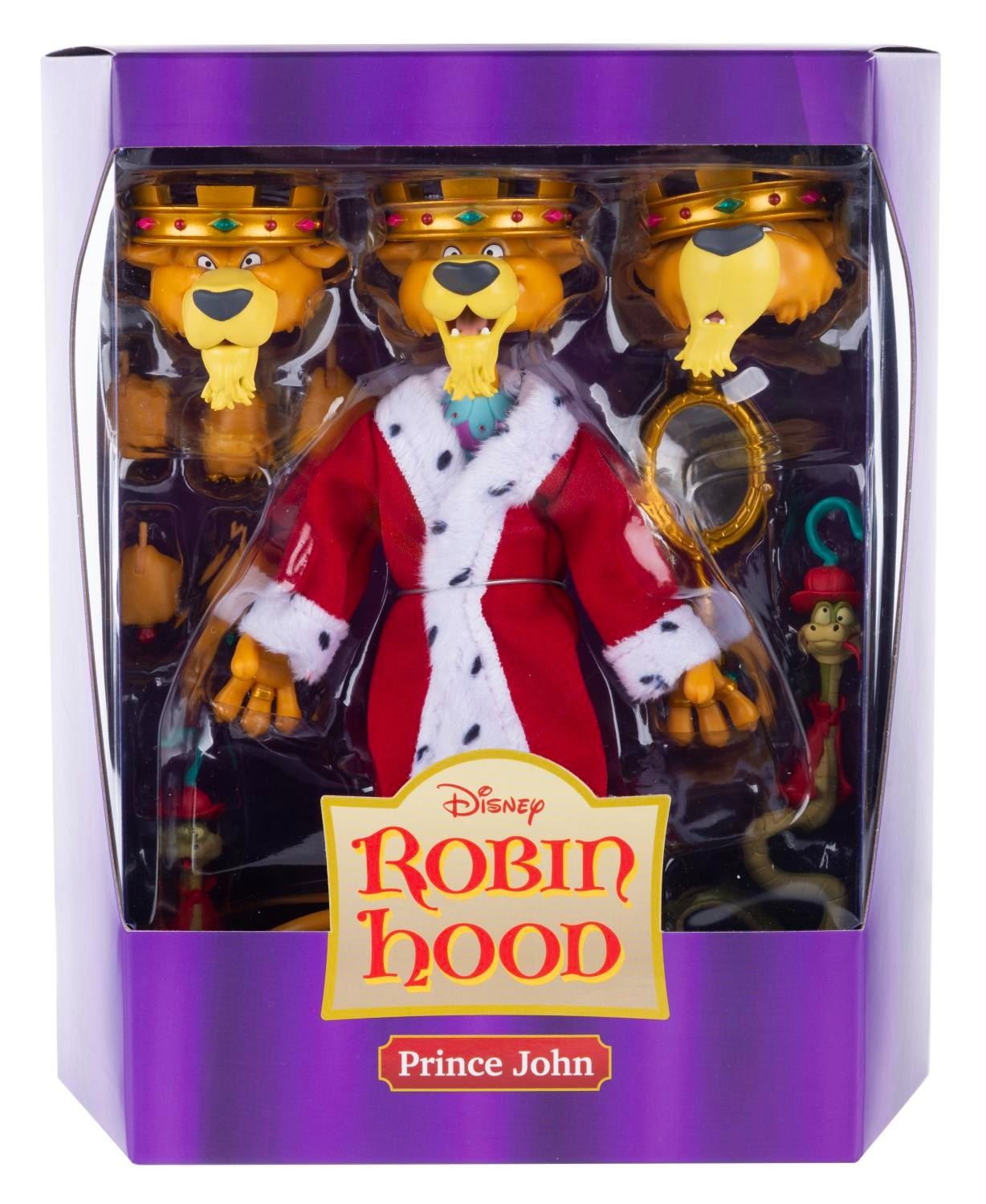 (Super 7, 2020s) A Prince John Ultimates! poseable figure in the original packaging from Disney's "Robin Hood." Included with the figure are three interchangeable heads, four interchangeable hands, with and without his rings, two different versions of Sir Hiss, and a vanity mirror. The figure wears a plush red robe with a faux fur trim. Measuring 8" x 3" and 9.25" tall, the figure is in fine unopened condition.