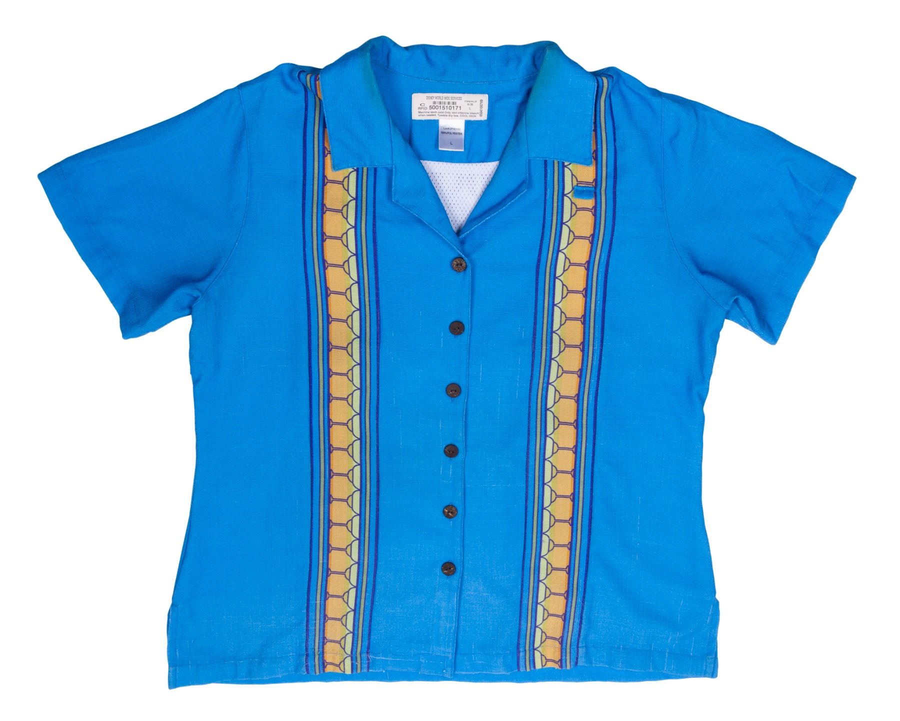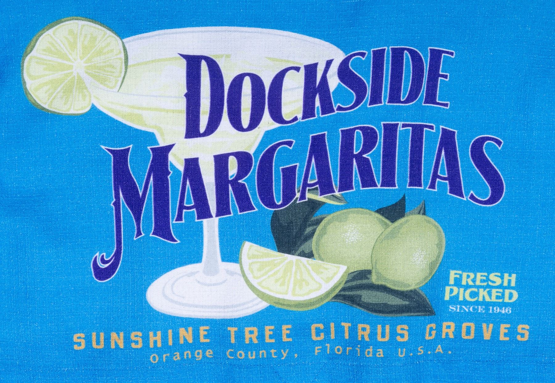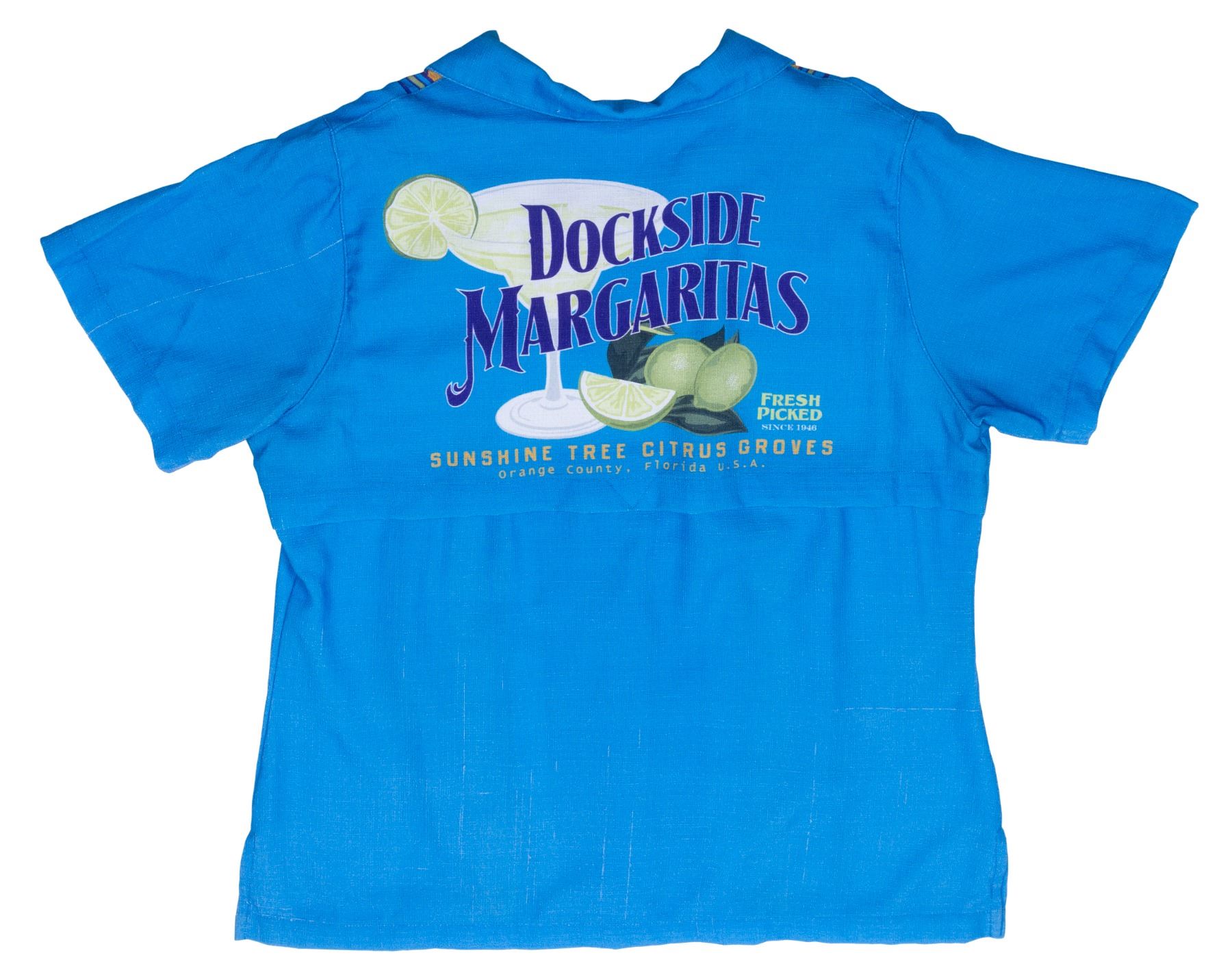 (Disney Springs, 2000s) A blue Cast Member shirt from Dockside Margaritas, featuring a fun margarita glass pattern. Labeled a size female L, the shirt is in good condition with fraying and wear.