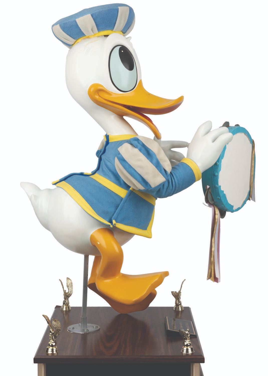 (Disney, 1987-2000s) An original Disney Store Donald Duck display figure. This Donald was part of a scene titled “Mickey’s Magical Music Shoppe” which featured beloved Disney characters in medieval attire playing instruments. Measuring 15” x 29”, 36” tall including the 20” x 7” x 16” deep custom base, the figure is in very good condition with scuffs, wear, visible glue residue under the hat, paint chips on the tambourine, and minor stains, including a small black stain on the nose.