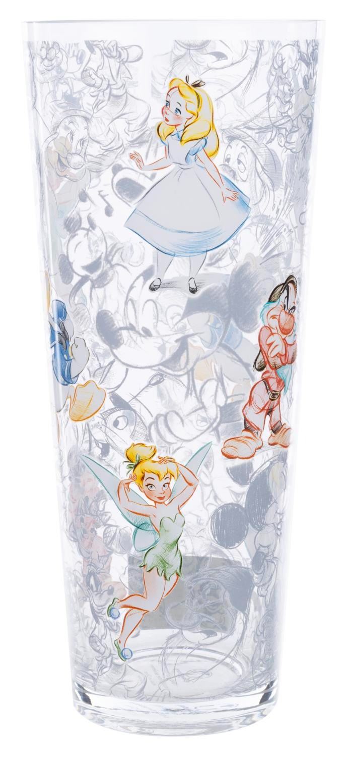 (Disney Store, 2000s) A Disney Studio Collection glass vase featuring Alice, Donald Duck, Grumpy, and Tinker Bell. Measuring 15.25" in height with a 6.5" diameter, the vase is in very good condition with light scratches.