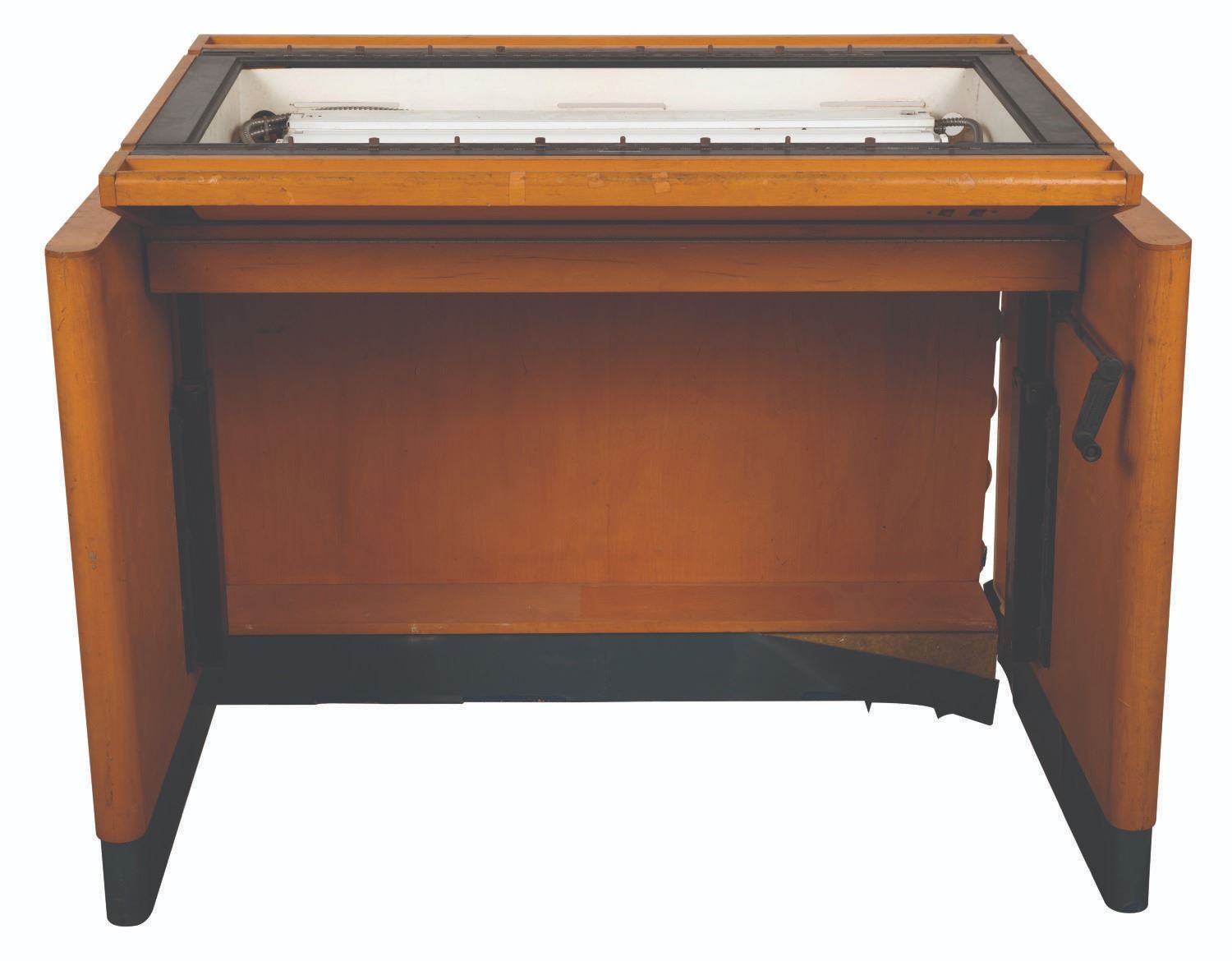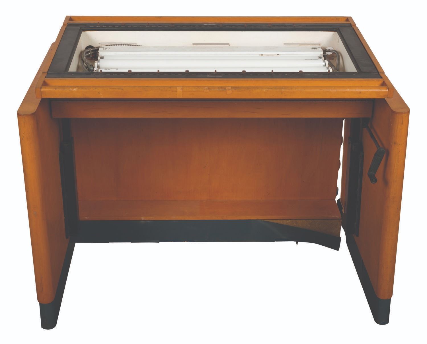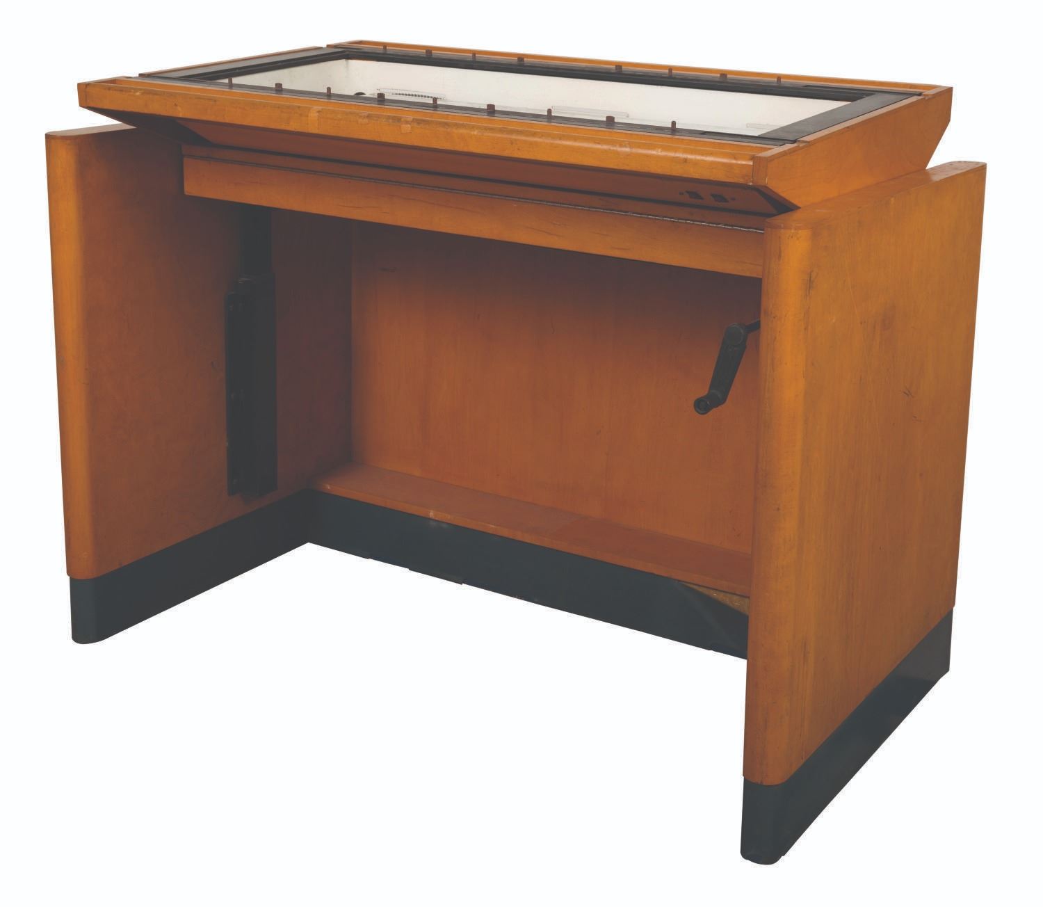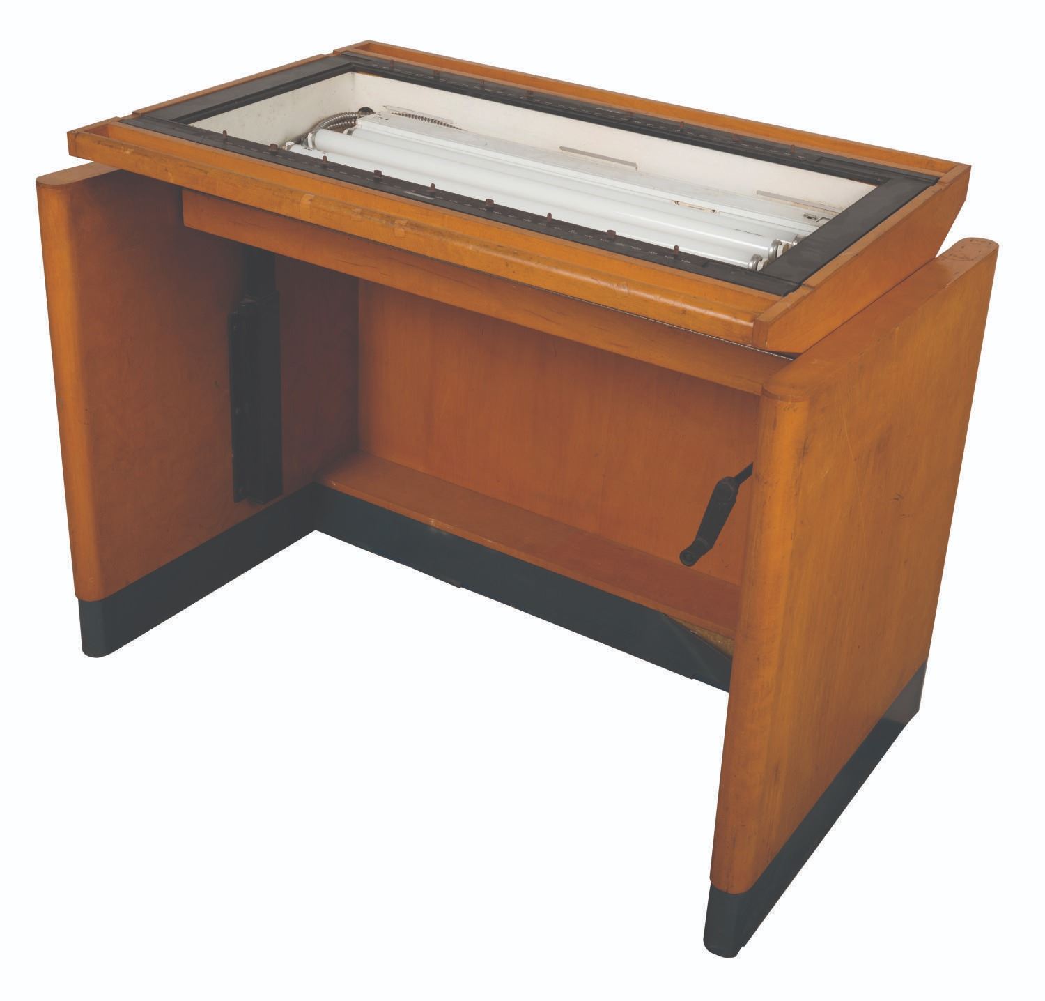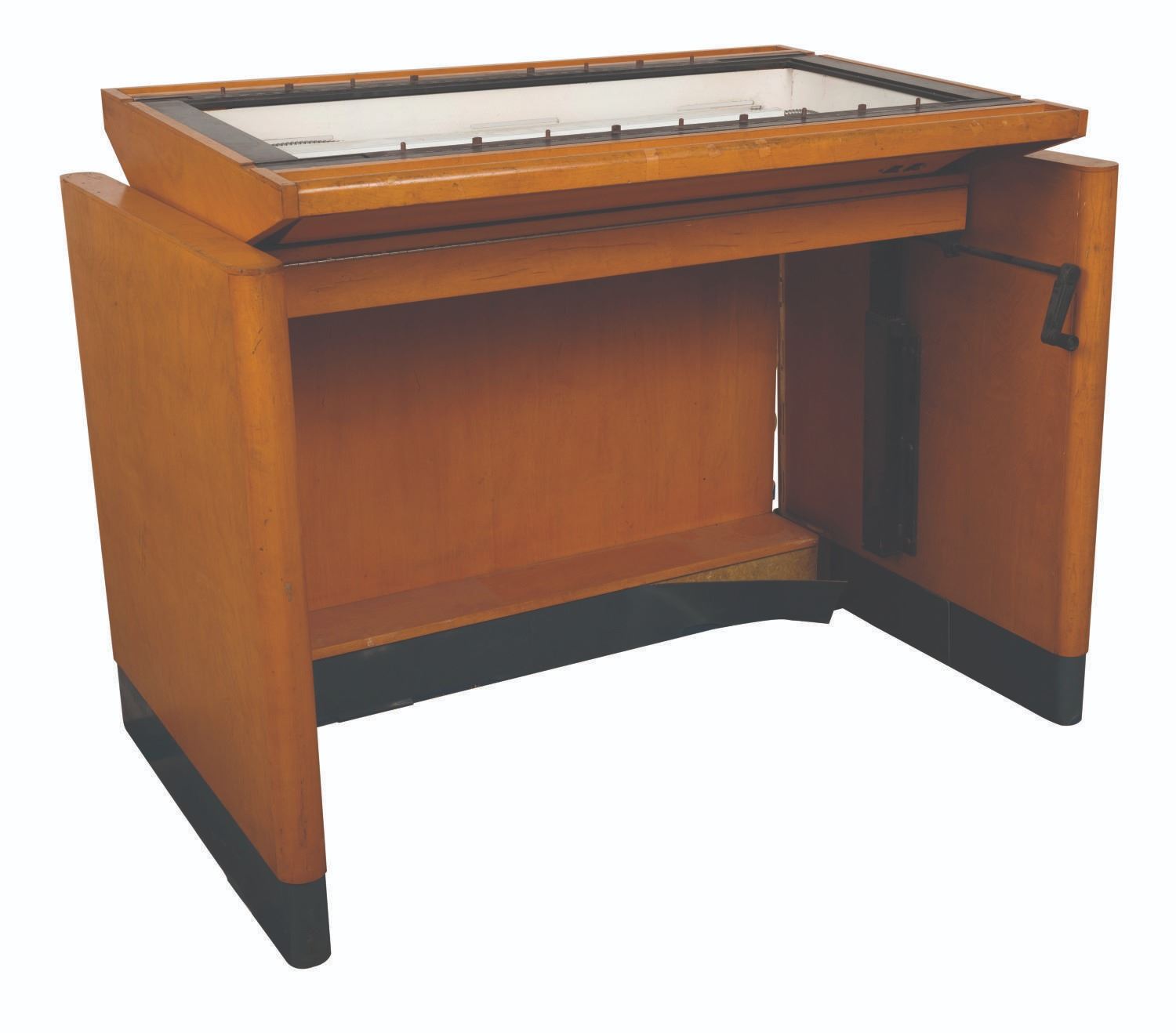 (Disney, 1990s) A rare Walt Disney Studio-used "Kem Weber-like" drafting table from the Disney Feature Animation Studio in Orlando. The light surface viewable area measures 19"x42" and is adjustable by height and tilt. The table measures 53.5"x32.5"x36" and is in good condition showing wear from use and damage to supporting legs that will need repair. Due to size and weight, special shipping arrangements are required. Please inquire before bidding.