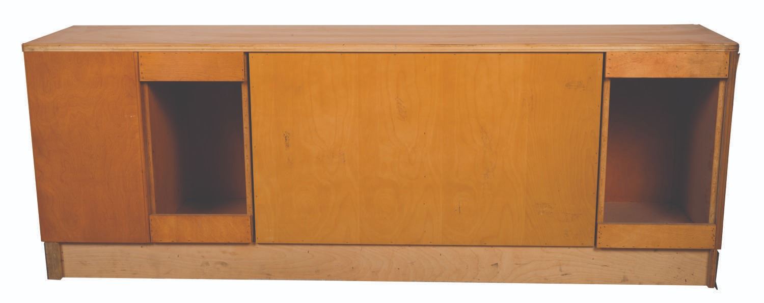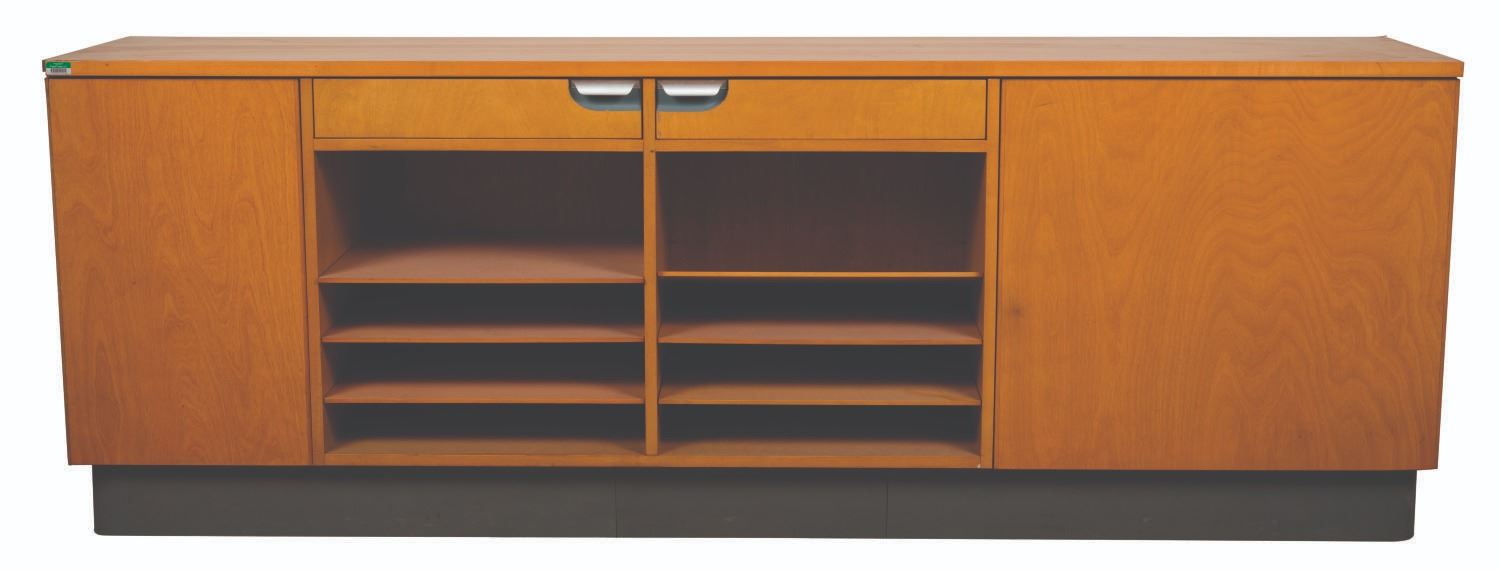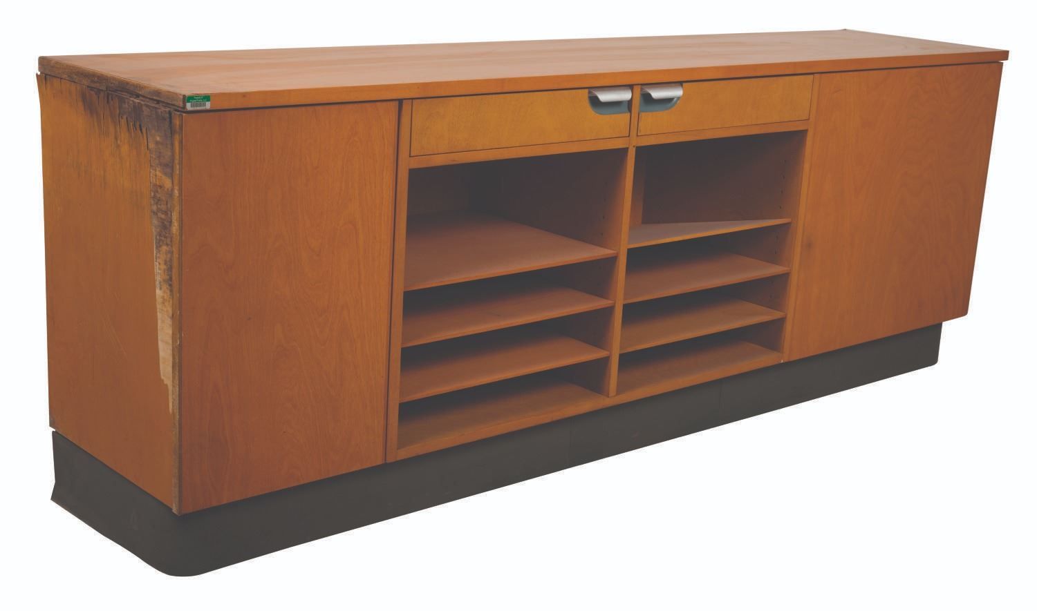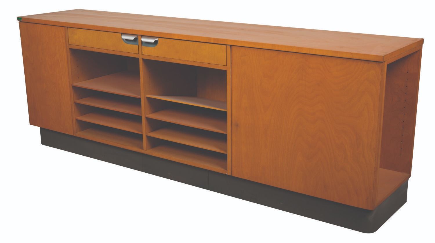 (Disney, 1990s) A rare Walt Disney Studio-used "Kem Weber-like" office cabinet from the Disney Feature Animation Studio in Orlando. Two of these cabinets were at each desk used by the artists in the Animation Tour walk thru at the Disney-MGM Studios, with one to the side and one behind the artist, forming a three-sided cubicle. Modeled after the classic furniture designed by Weber for the Burbank Disney Studio in 1940, it has two shallow drawers with slots for art below. Measuring 84" x 18" x 25", the cabinet is in very good condition with light wear from use.
