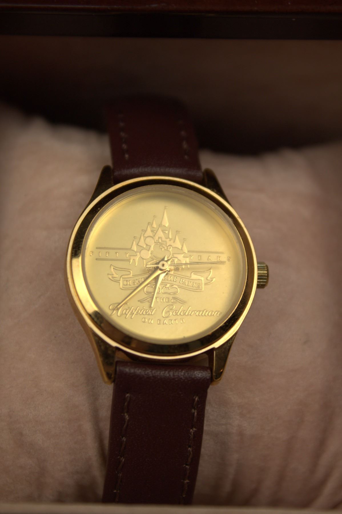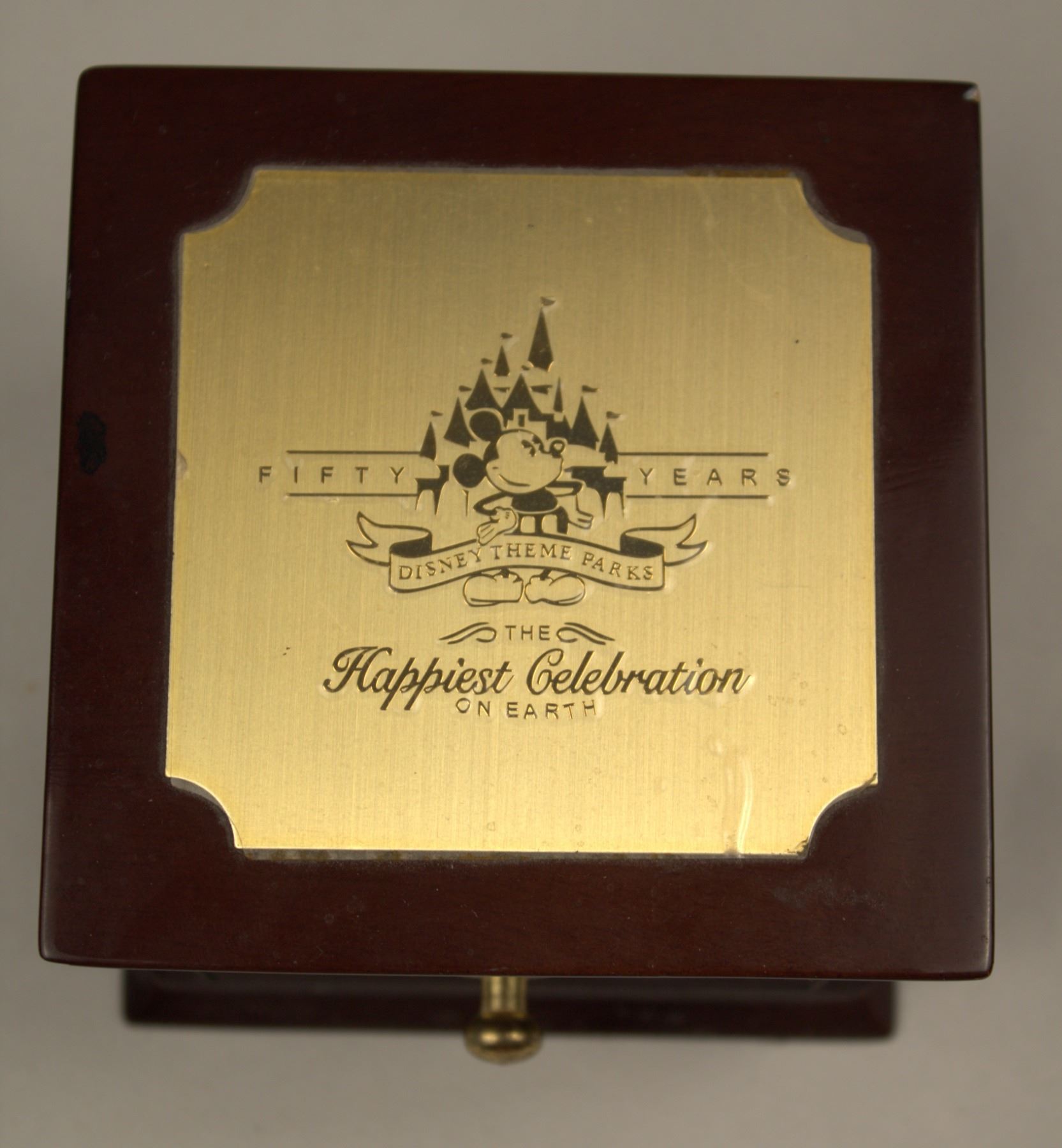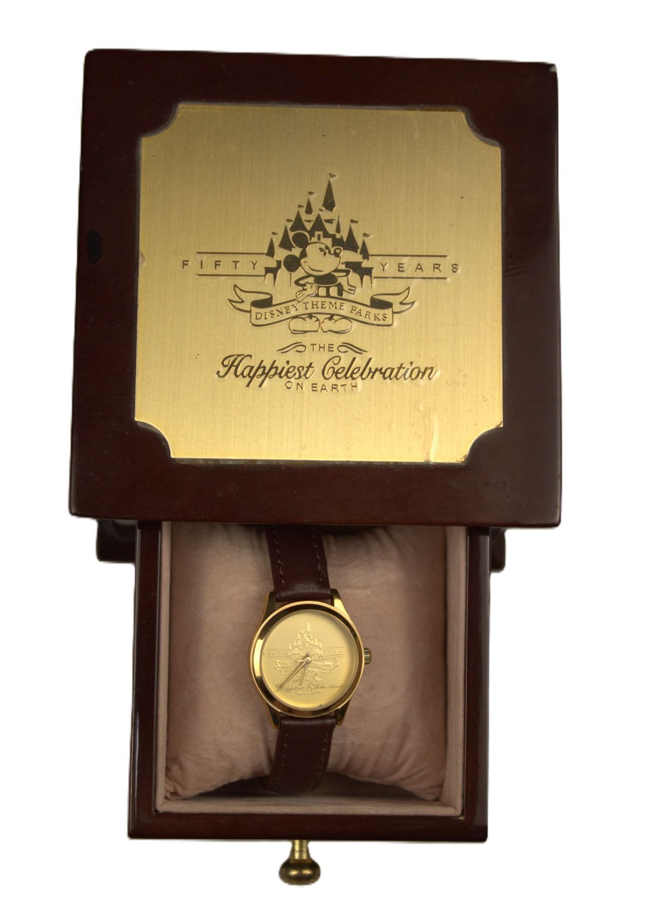 This Disney Time Works watch celebrates 50 years of Disney theme parks with The Happiest Celebration on Earth. the watch face and the box share the same Emblems and writing. It is in like new condition and comes in an ornamental wooden box. The watch and band are in excellent condition.