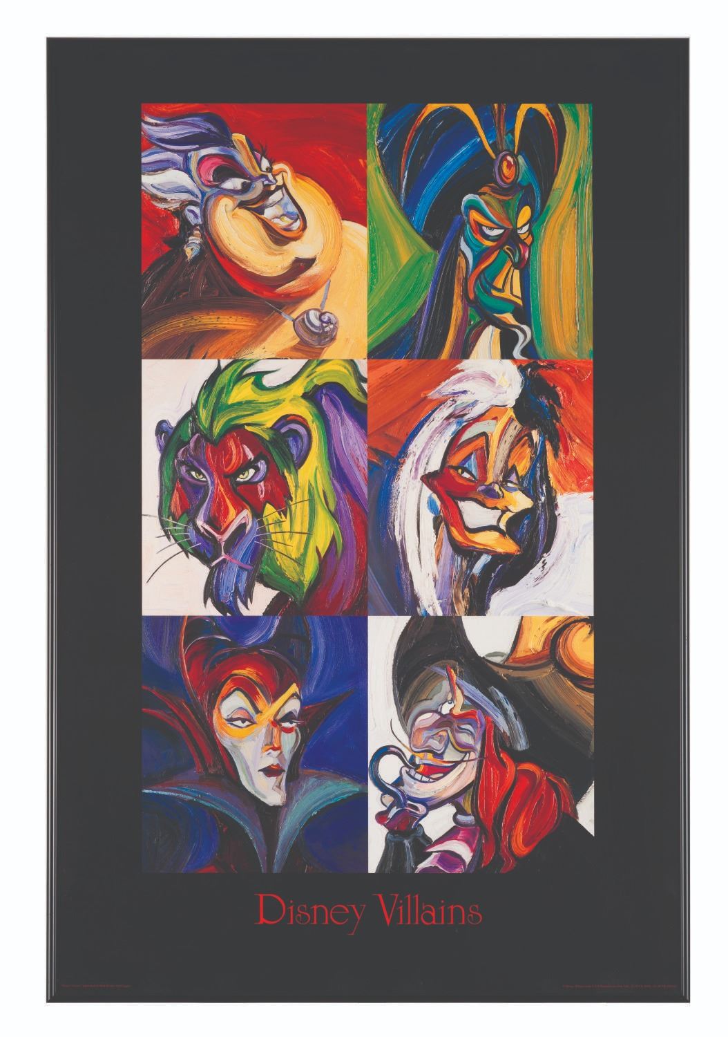 (Disney, 1990s) A Disney Villains poster depicting Ursula, Jafar, Scar, Cruella, Maleficent, and Captain Hook in broad, colorful, textural strokes. The piece measures 24" x 36" and is in very good condition..
