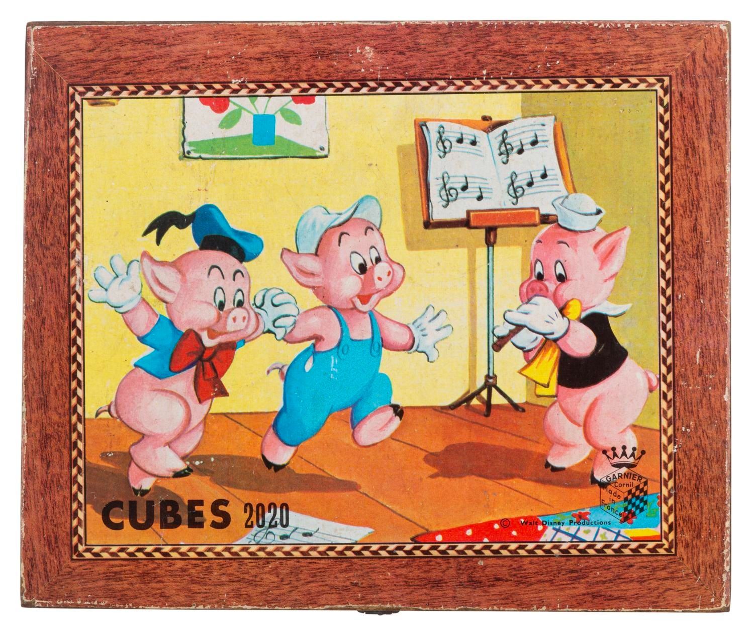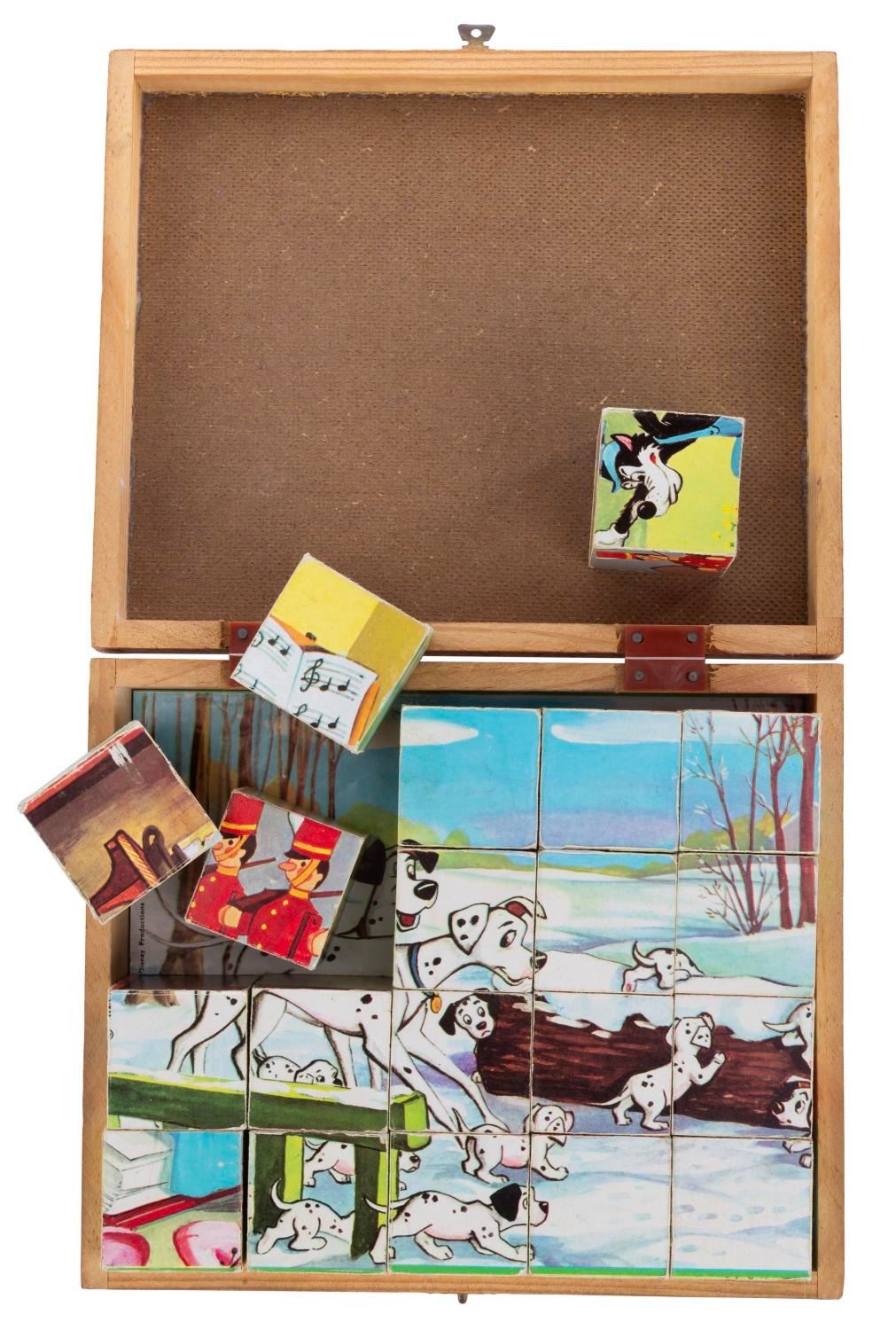 (Garnier Cornil, 1960s) A block puzzle set in a wooden case by Garnier Cornil of France. 40 wooden blocks form 6 different images of characters from Disney films including “One Hundred and One Dalmatians,” “Pinocchio,” “The Three Little Pigs,” and “Alice in Wonderland.” Measuring 7.5" x 9" x 2" deep, the set is in good condition with edge wear and typical wear from use.
