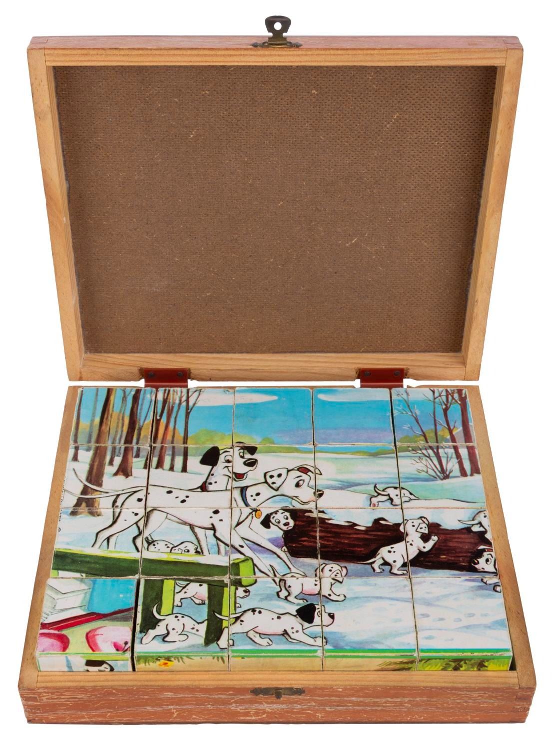 (Garnier Cornil, 1960s) A block puzzle set in a wooden case by Garnier Cornil of France. 40 wooden blocks form 6 different images of characters from Disney films including “One Hundred and One Dalmatians,” “Pinocchio,” “The Three Little Pigs,” and “Alice in Wonderland.” Measuring 7.5" x 9" x 2" deep, the set is in good condition with edge wear and typical wear from use.