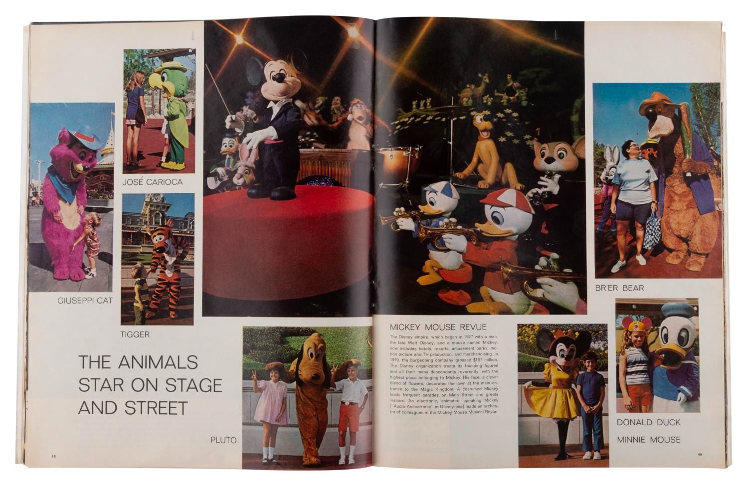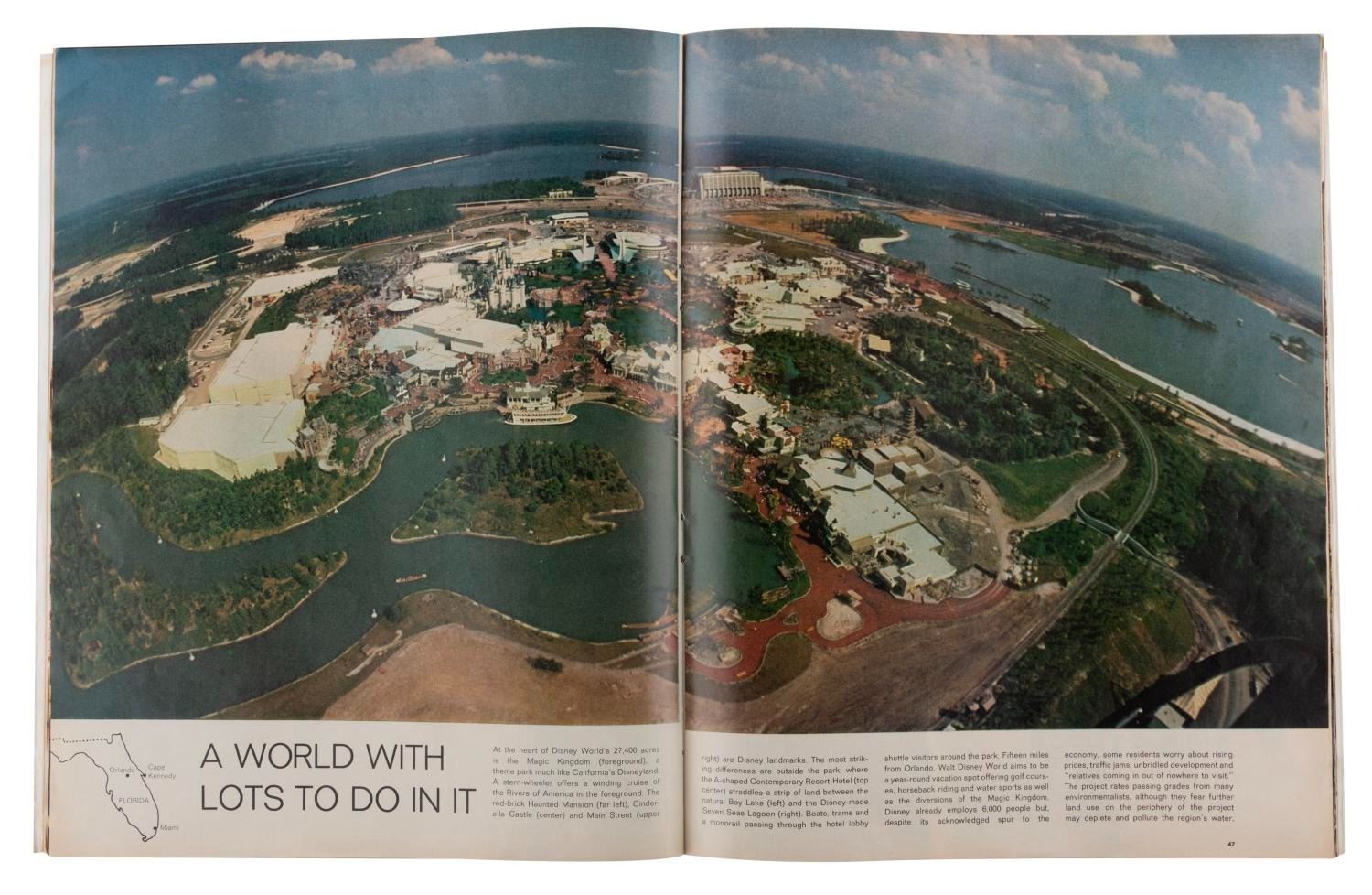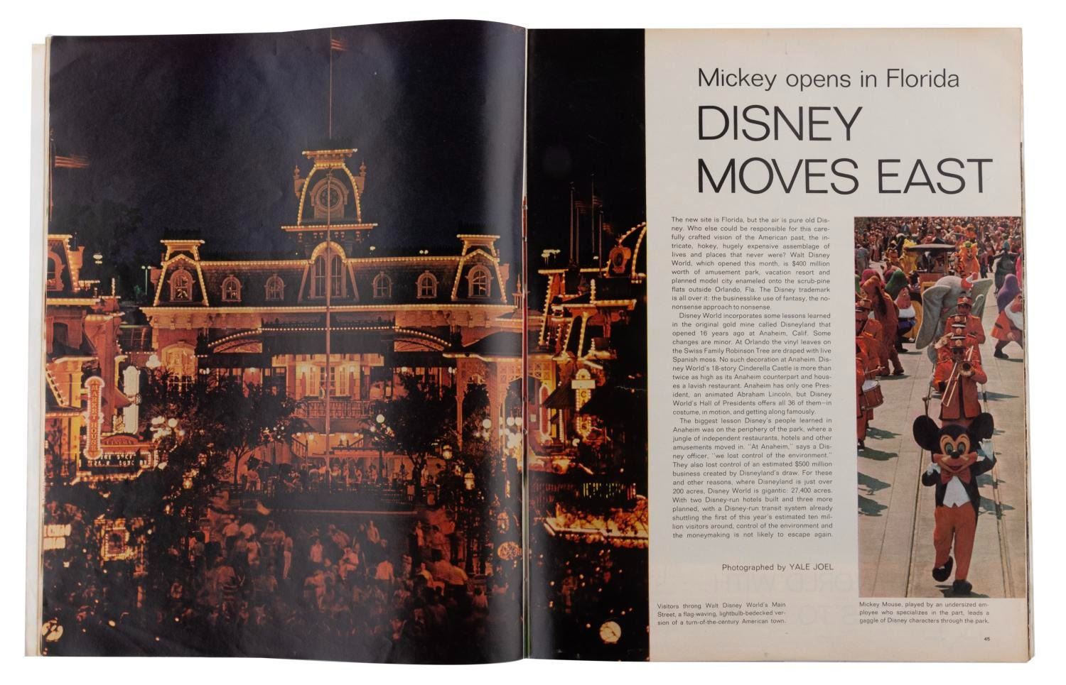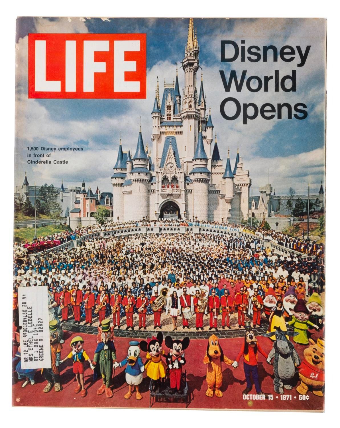 (LIFE, 1971) An October 15, 1971 issue of LIFE magazine featuring a multi-page cover story on the opening of Walt Disney World. Measuring 10.5" x 13", the magazine is in good condition with staining, soiling, discoloration, creasing, edge wear and paper loss.
