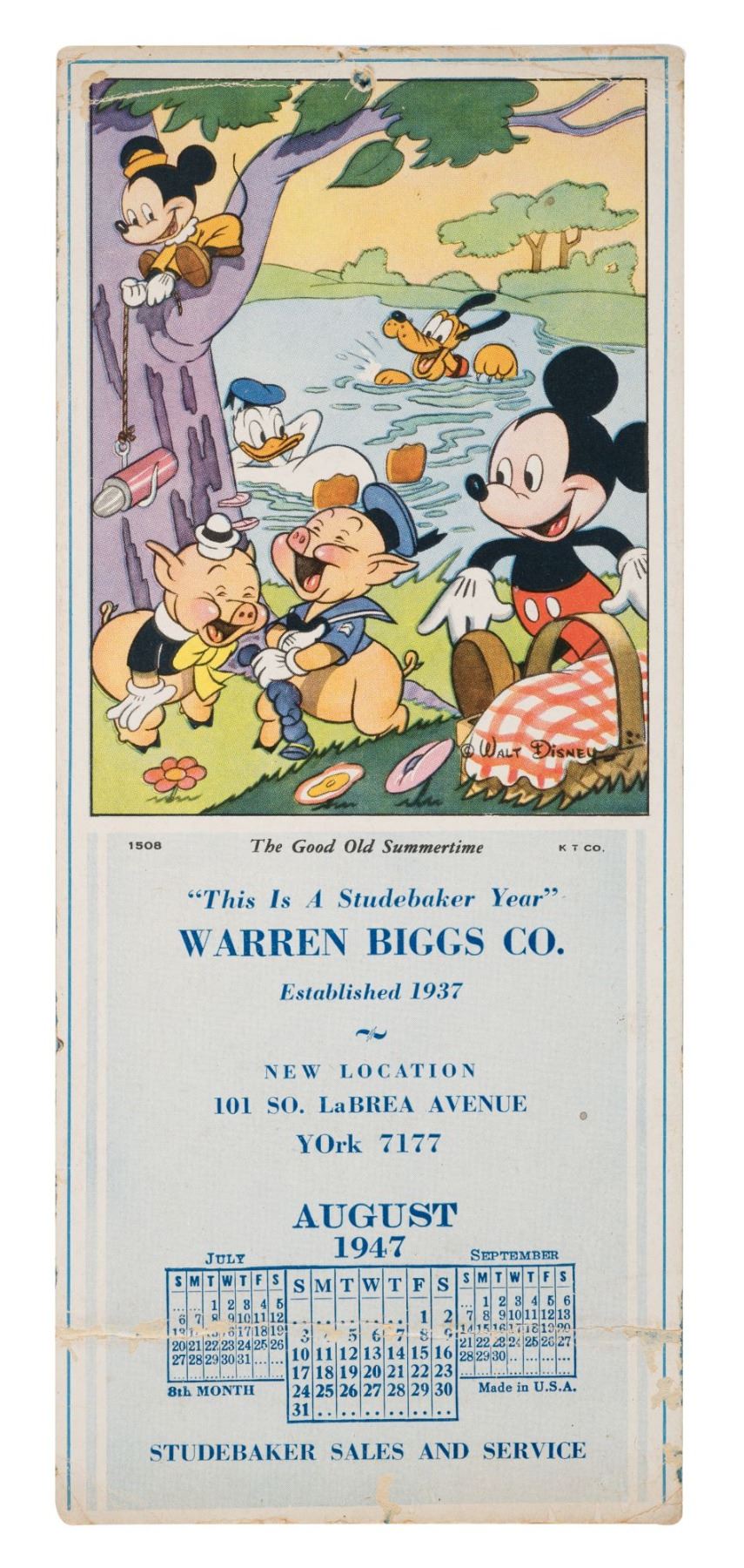 (Disney/Studebaker, 1947) A promotional calendar for Studebaker, with an image of Disney characters at play in summertime. The desk calendar contains the months of July through September of 1947. Measuring 3.75" x 9" the piece is in good condition with edge wear, a pinhole at the top from hanging, and a crease to the bottom 1" of the card.