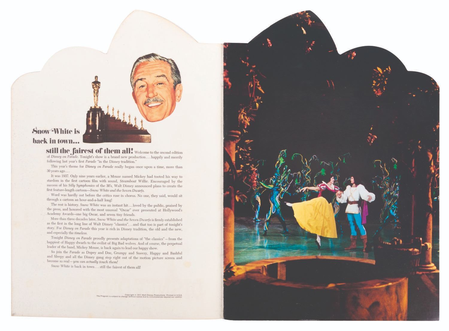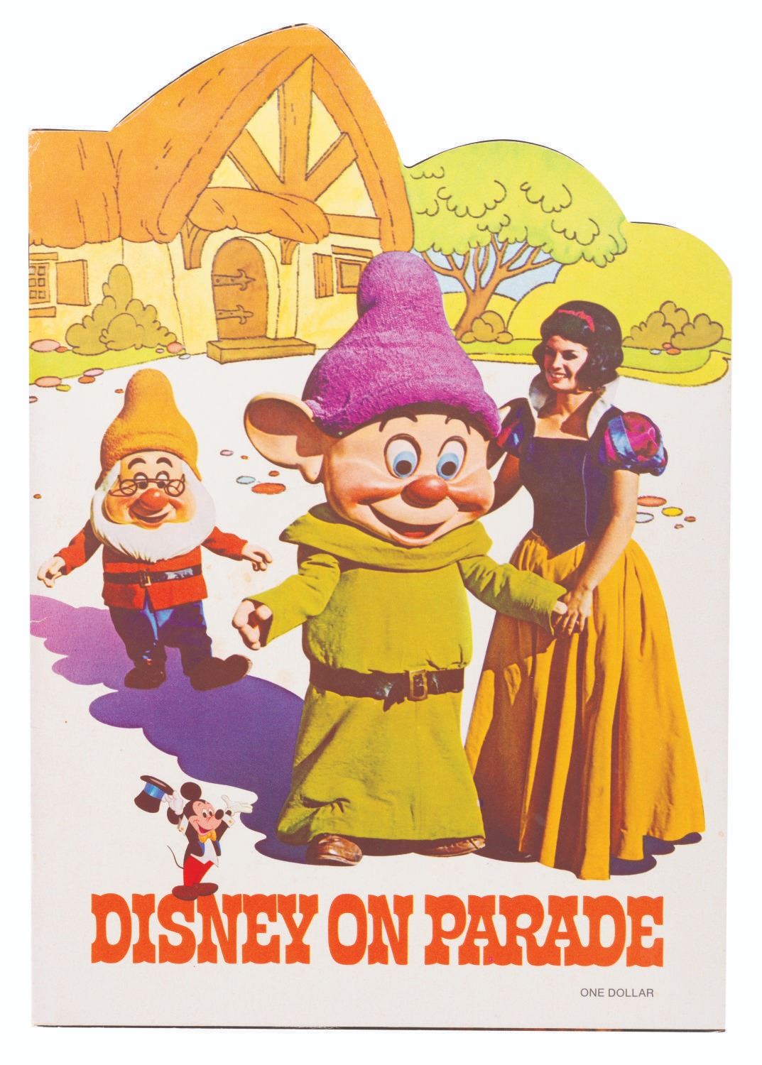 (Disney, 1971) A program from the 1971 tour of "Disney On Parade," a traveling show starring Disney characters. The program contains color photographs and behind-the-scenes information. Measuring 8.5” x 12”, the program is in very good condition with light wear from handling and age, including spotting inside the back cover.