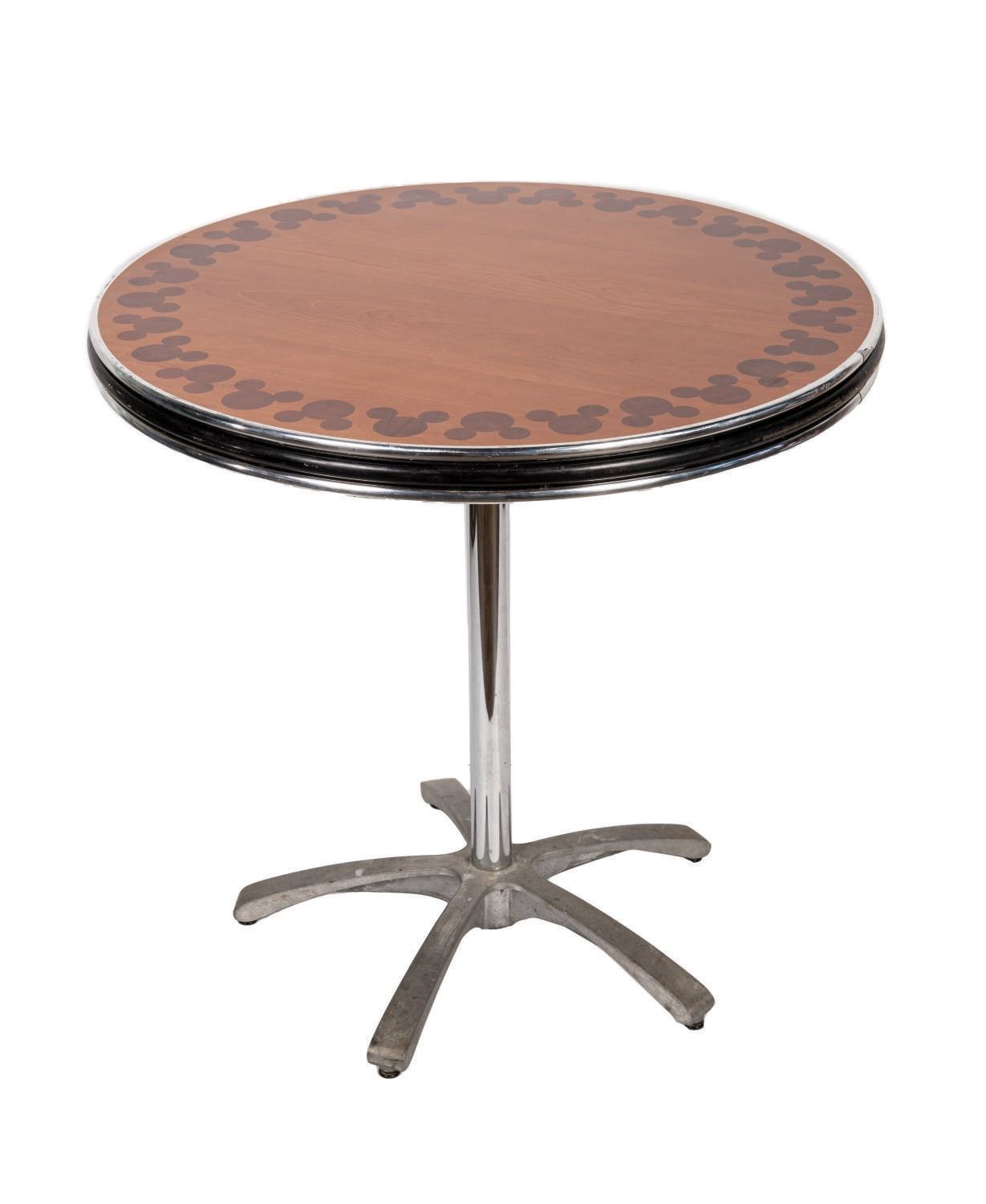 (Disney's All-Star Music Resort, 2020s) A table from a suite of Disney's All-Star Music Resort at Walt Disney World. Measuring 39.25" in diameter and 29.75" tall, the faux-wood grained table with the Mickey Mouse motif is in good overall condition with minor scuffs from original resort use.