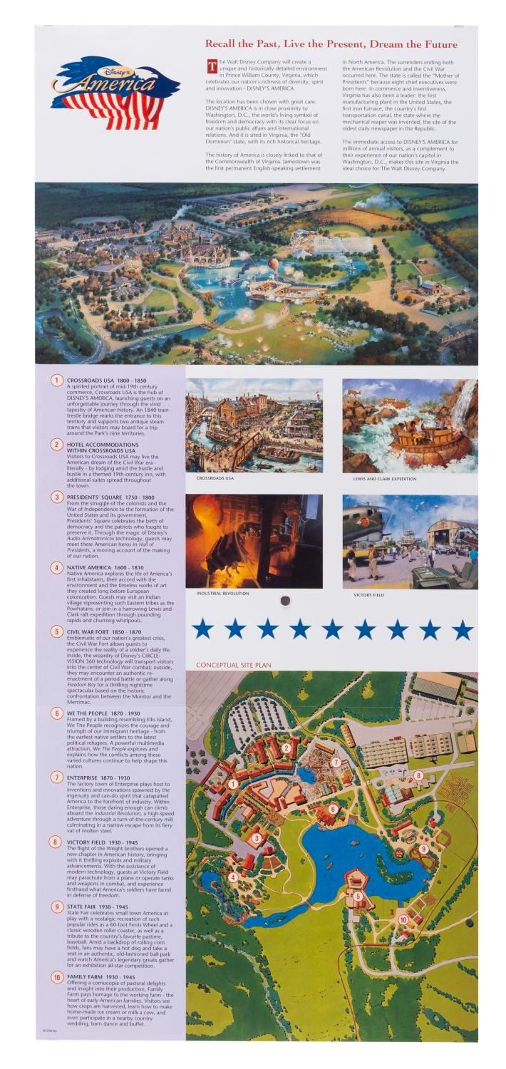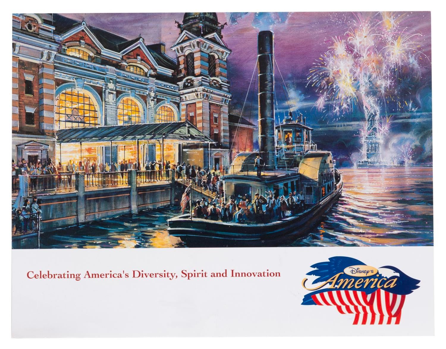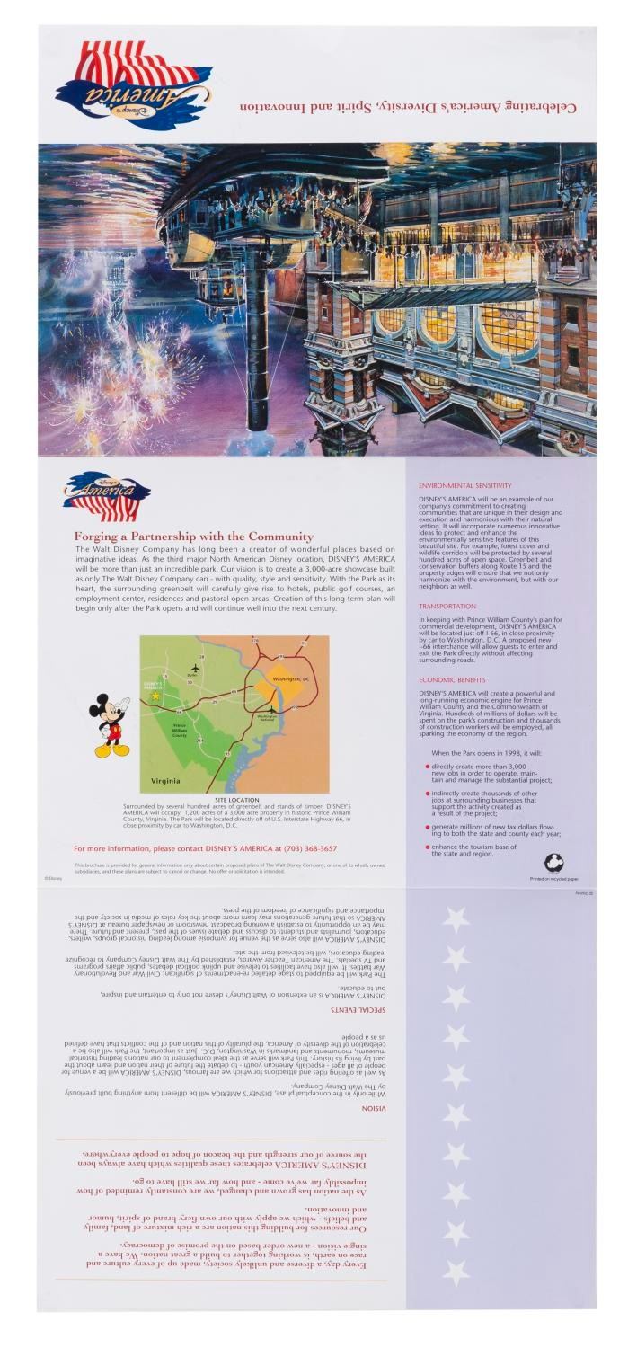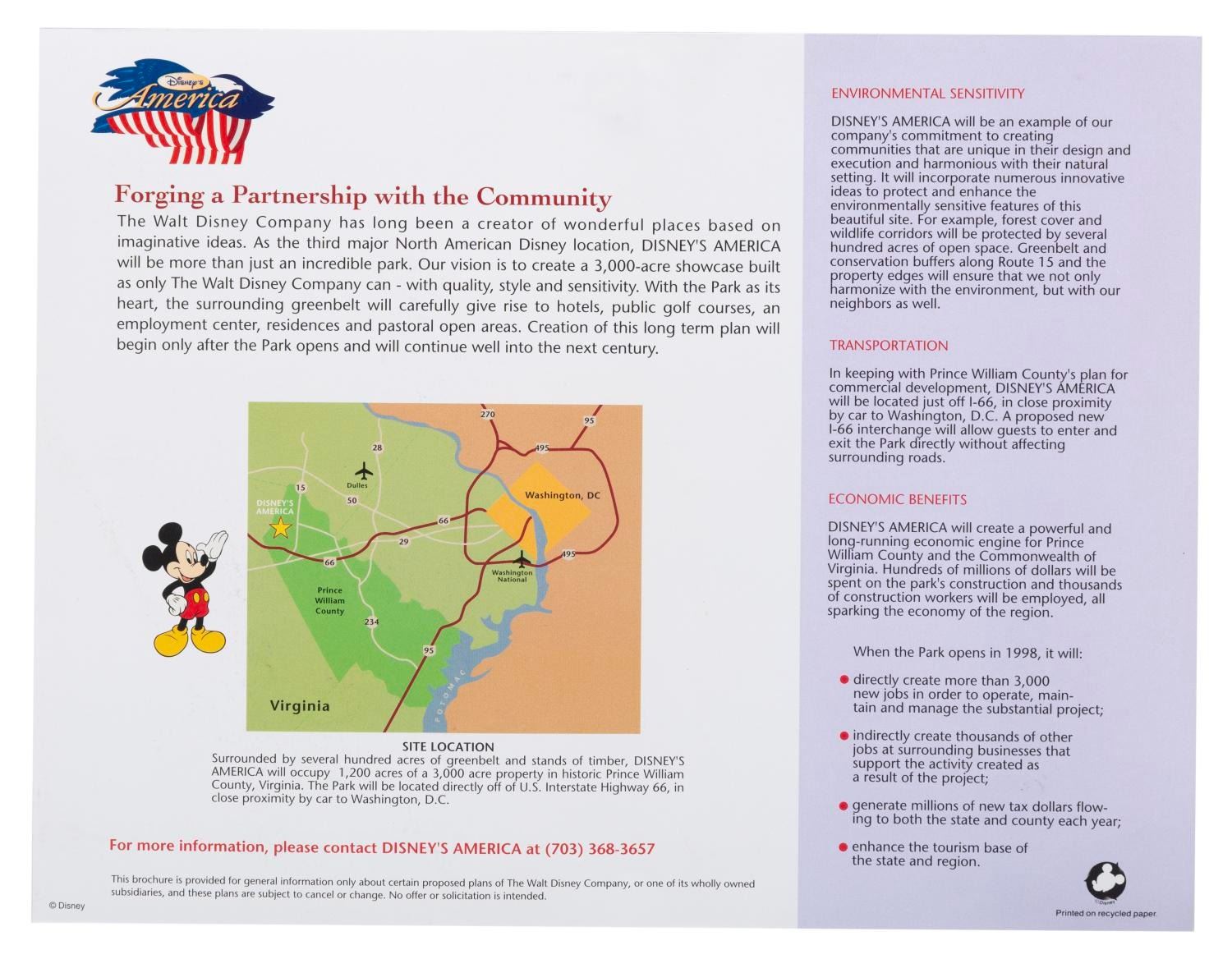 (Disney, 1993) A tri-fold prospectus for the never-realized Disney’s America Theme Park. In 1993, the patriotic theme park was announced for the Haymarket, Virginia area, but the project was cancelled within a year. The brochure measures 8.5" x 11" closed and is in very good condition with light creasing and smudging.