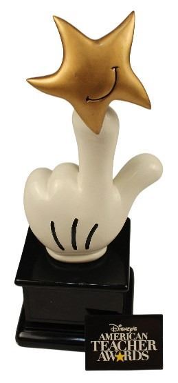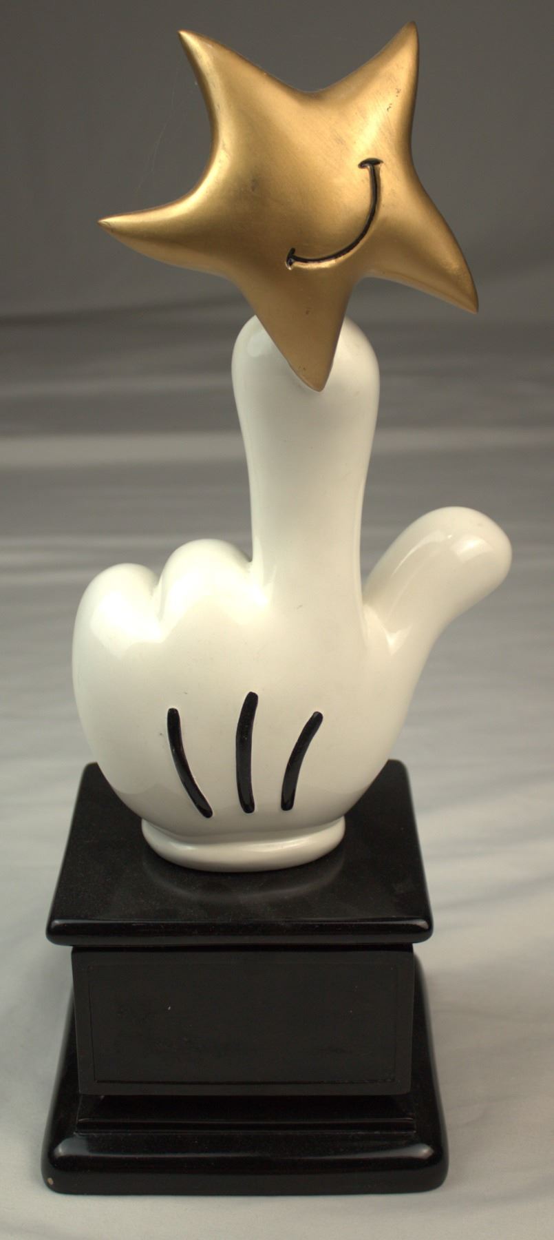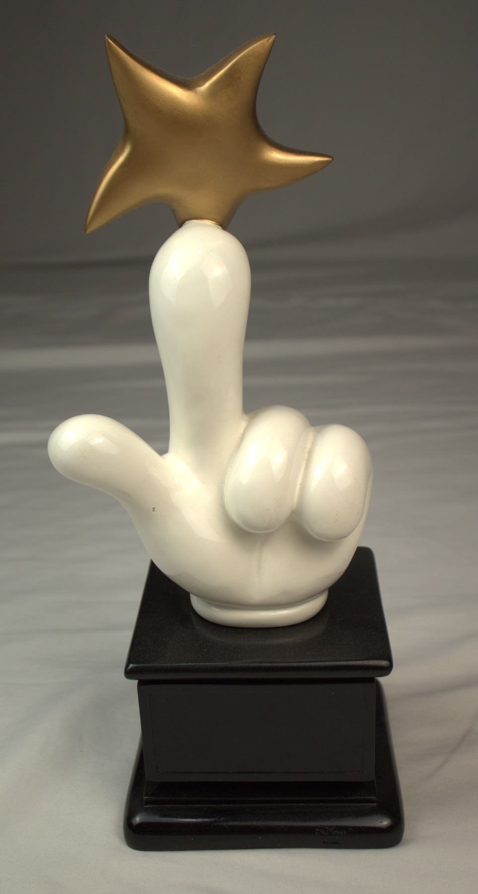 1990s era trophy awarded to teachers recognized by Disney as the top in their field. The award is made of resin and wood and features a smiling gold star on the tip of Mickey Mouse's white glove. Measures 16 " x 5.5" x 5.5".