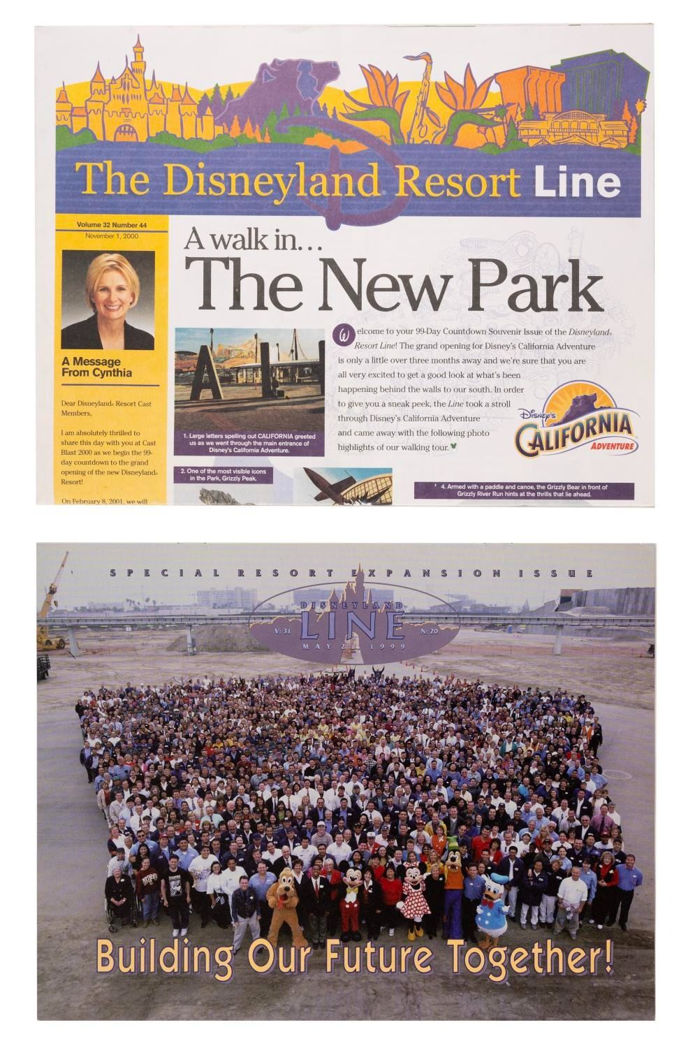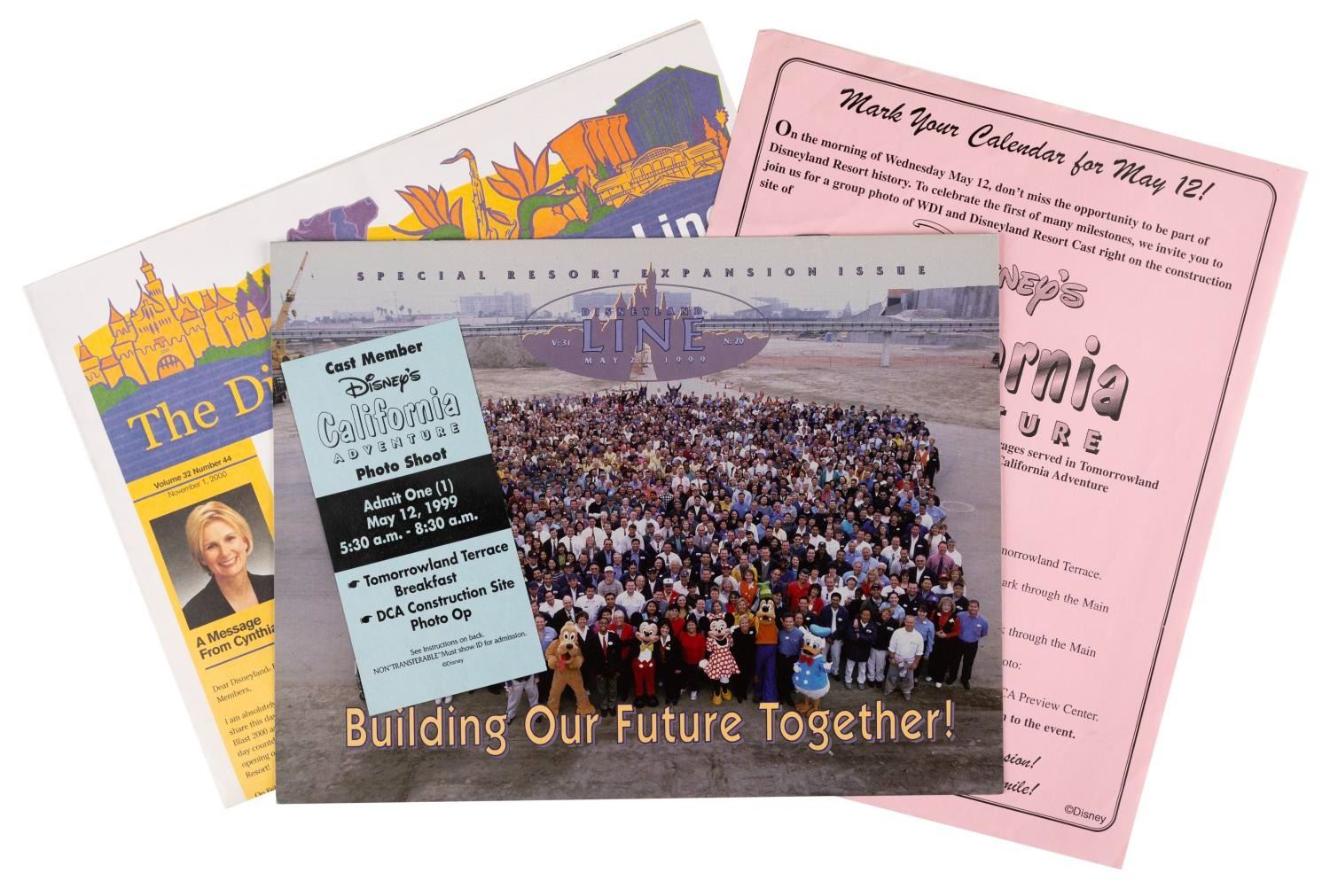 (Disney's California Adventure, 1999-2000) A collection of memorabilia celebrating the groundbreaking and construction of Disney's California Adventure completion. Included are one event ticket, an invitation flyer, the full group photograph in the old Disneyland parking lot, a May 1999 "Disneyland Line" magazine, and a November 2000 issue under the new title "Disneyland Resort Line." Measuring from 2.75" x 5.5" to 11" x 17", the items are in very good to fine condition with light wear to the flyer and newspaper.