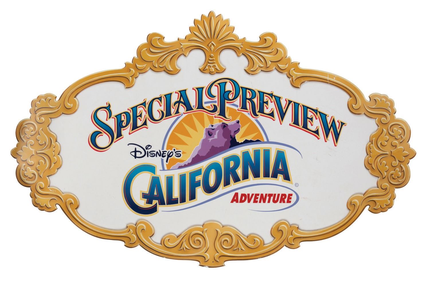 (Disney's California Adventure, 2000) A sign for the "Special Preview of Disney's California Adventure" exhibit at Disneyland Park. This is one of the signs which hung over the Preview Center housed within the Main Street Opera House, where Guests were given a glimpse of the newest Park to join the Disneyland Resort. Measuring 38"x60", the acrylic sign with painted imagery and characters is in very good condition overall, while exhibiting scratches, scuffs, and wear from park use.