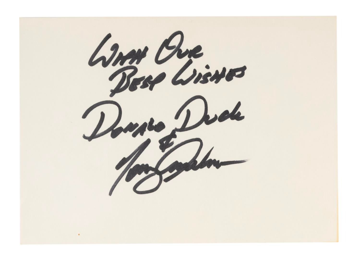 (Disney, 1995) A card signed by Tony Anselmo, the voice of Donald Duck, at the 1995 Disneyana Convention. Handpicked by the original voice artist of Donald Duck, Clarence Nash, Tony remains the official voice of Donald today. Measuring 5" x 7", the card is in very good condition with light soiling.