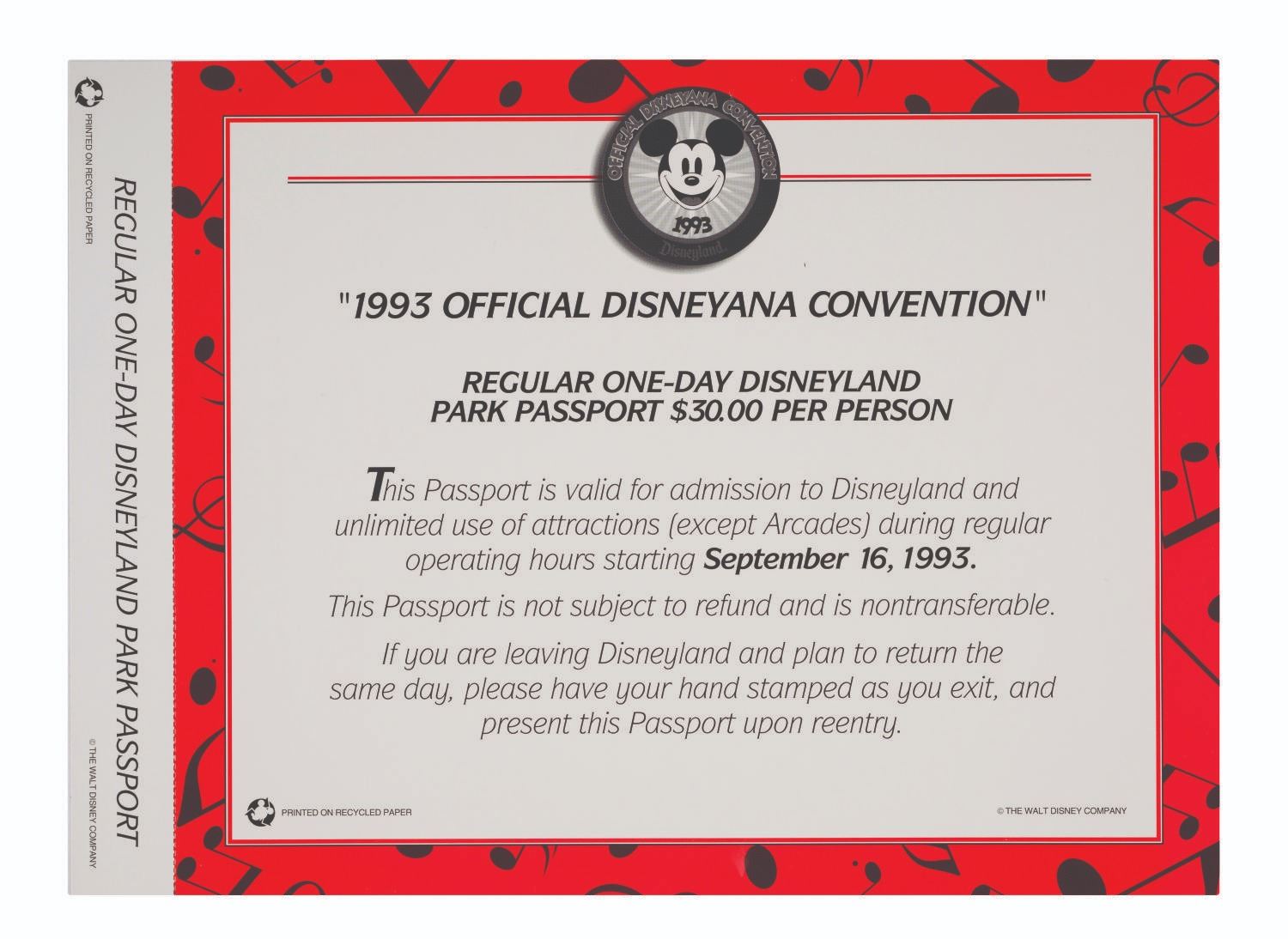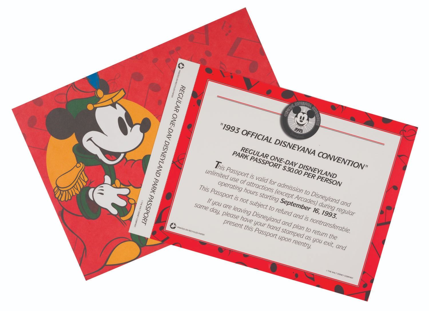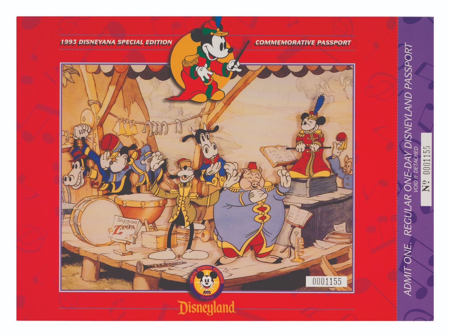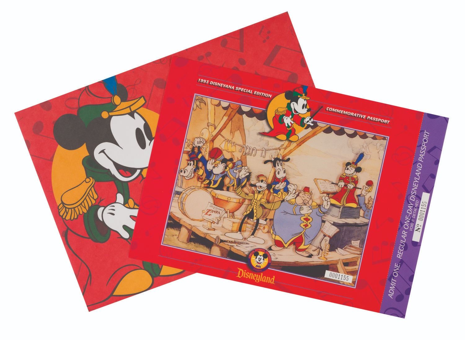 (Disneyland, 1993) A Disneyana Special Edition commemorative passport. This oversized commemorative Disneyland passport ticket featuring Mickey Mouse in “The Band Concert” is numbered “0001155,” and retains its original stub. Measuring 8” x 11”, the ticket is in very fine condition and comes within its original envelope.