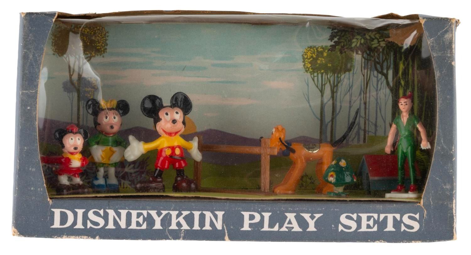 (Marx, 1961) A first series Disneykins play set featuring Mickey Mouse, Minnie, Monty, Pluto, and Peter Pan. Measuring 6.25" x 1.75" x 3.25" tall, the set is in very good condition with light paint loss and wear, while the packaging is in fair condition with tears, creases, and wear.
