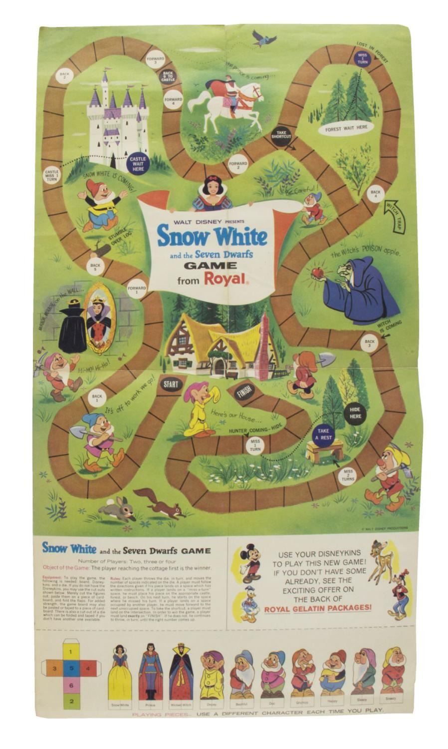 (Royal Gelatin, 1967) A promotional giveaway paper game from Royal Gelatin featuring characters from “Snow White and the Seven Dwarfs” that coincided with the film's re-release. While it was designed for play with Disneykins figures, it also includes cut-out paper token pieces for playing. Measuring 14.25” x 26,” the game is in good condition with wear from handling, edge wear, and minor spots of discoloration.