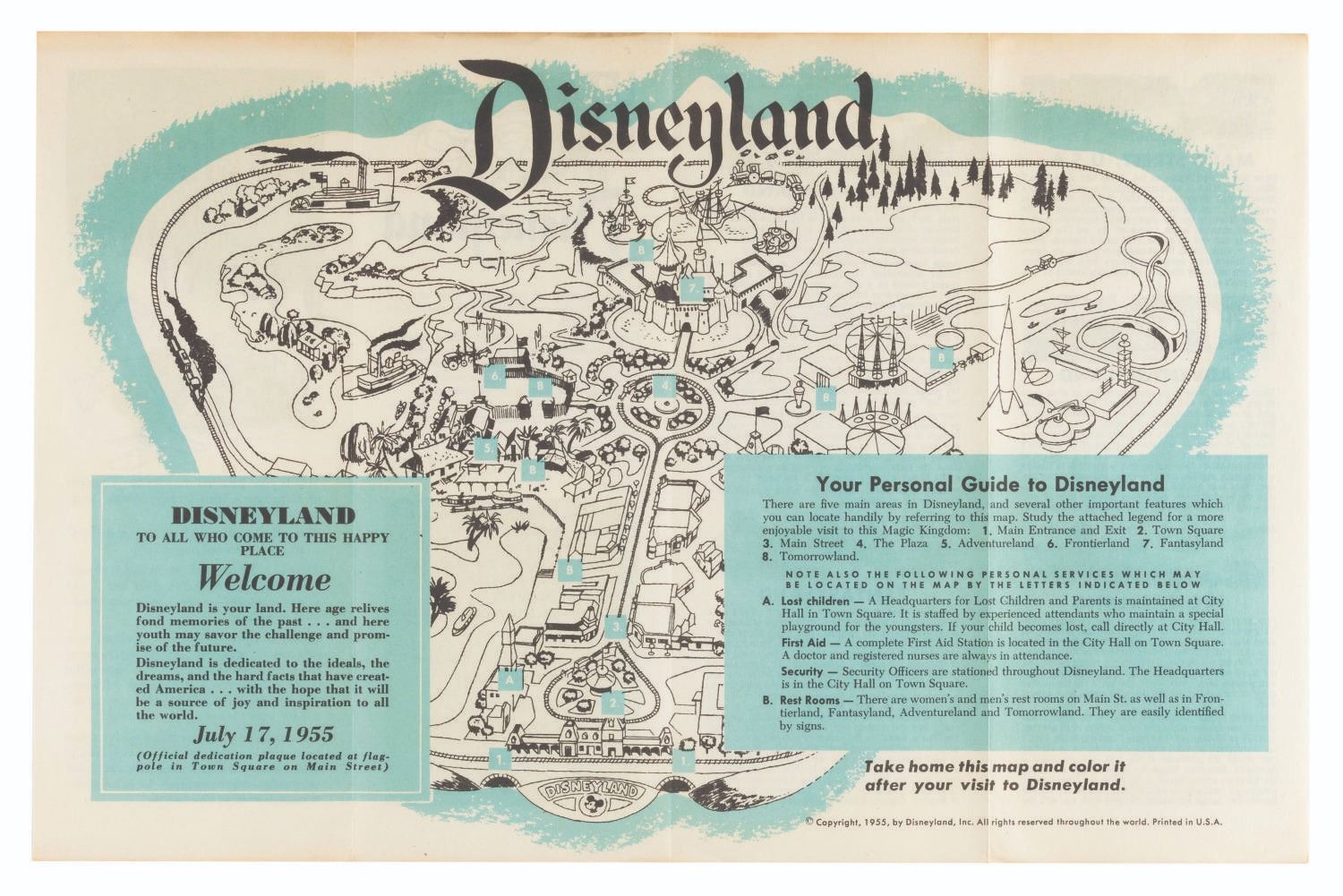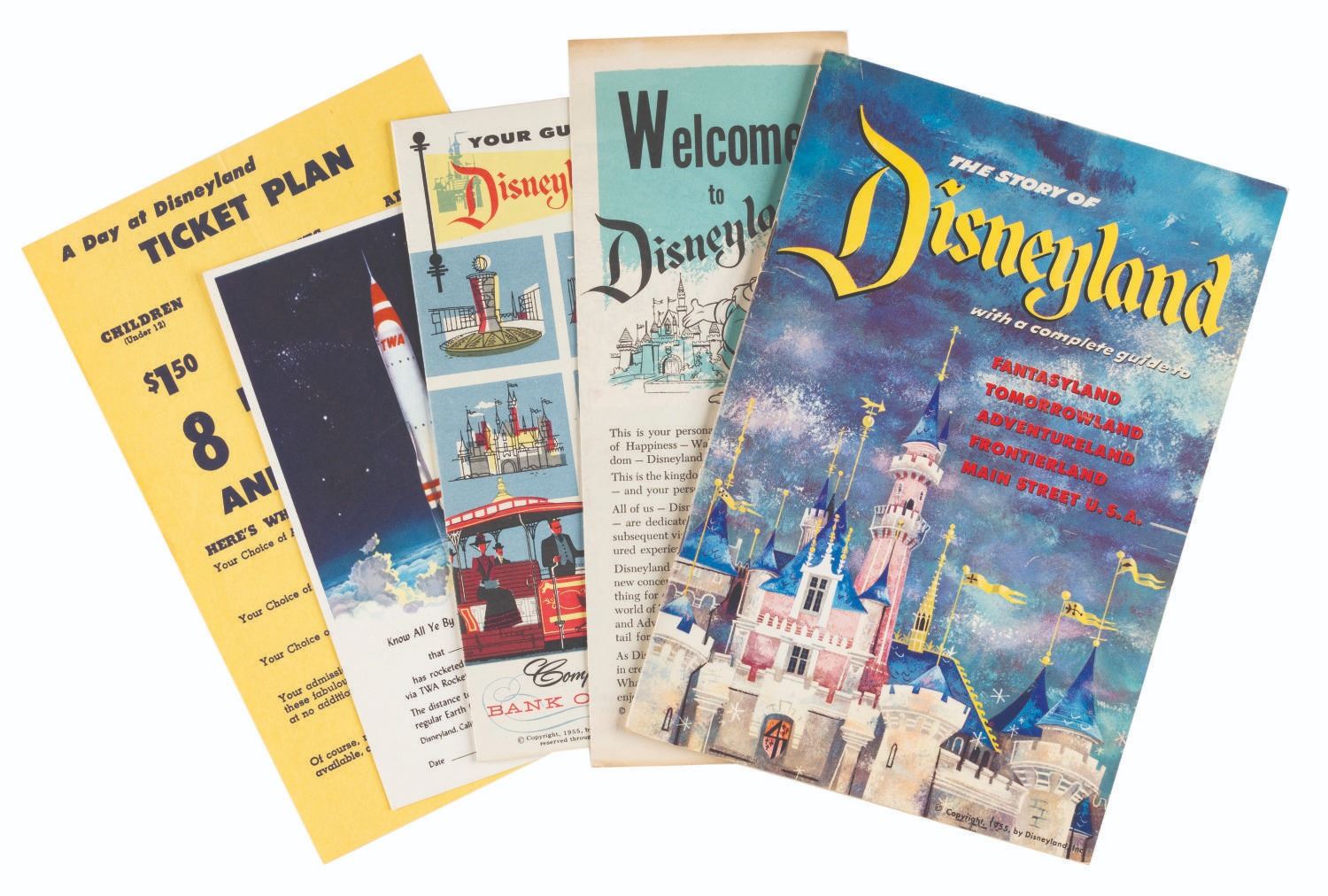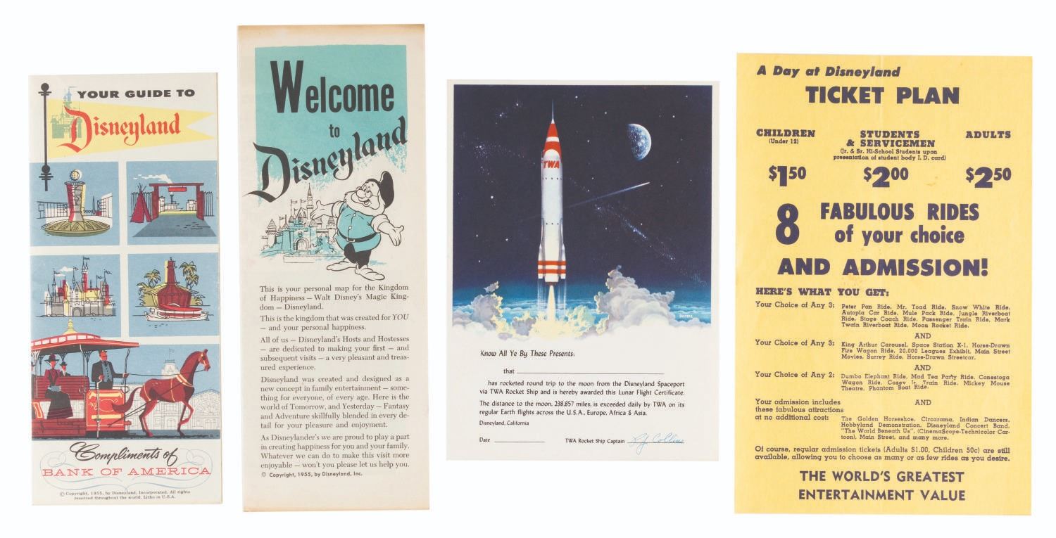 (Disneyland, 1955) An amazing collection of papers from Disneyland’s opening year, 1955. Included are the very first Story of Disneyland guidebook, a Bank of America Park Map Pamphlet, a Welcome to Disneyland Main Gate pamphlet, an unused TWA Rocket Lunar Flight Certificate, and a seldom seen Day at Disneyland Ticket Plan flyer. The paper souvenirs are all in very good condition with very light handling wear and some slight discoloration from age, and the TWA certificate has a slight tape mark on the back.