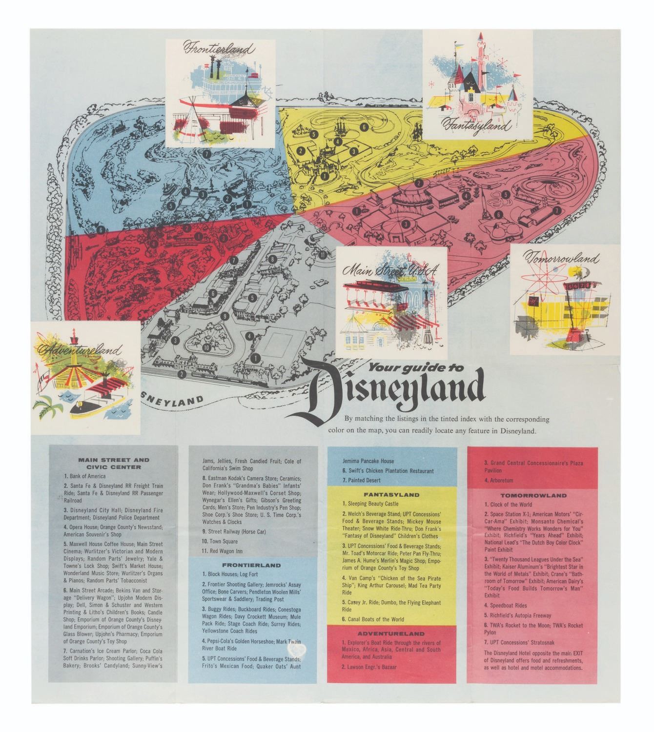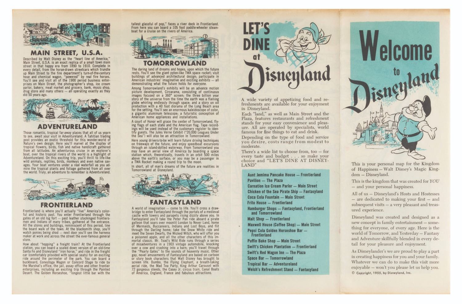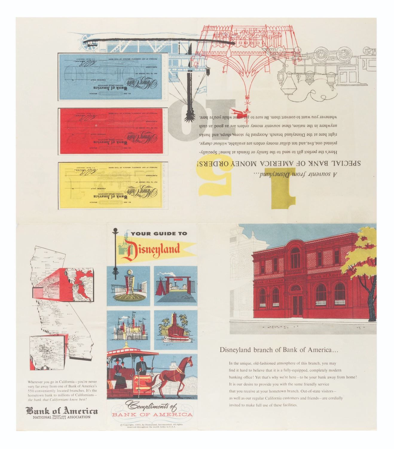 (Disneyland, 1955) An amazing collection of papers from Disneyland’s opening year, 1955. Included are the very first Story of Disneyland guidebook, a Bank of America Park Map Pamphlet, a Welcome to Disneyland Main Gate pamphlet, an unused TWA Rocket Lunar Flight Certificate, and a seldom seen Day at Disneyland Ticket Plan flyer. The paper souvenirs are all in very good condition with very light handling wear and some slight discoloration from age, and the TWA certificate has a slight tape mark on the back.