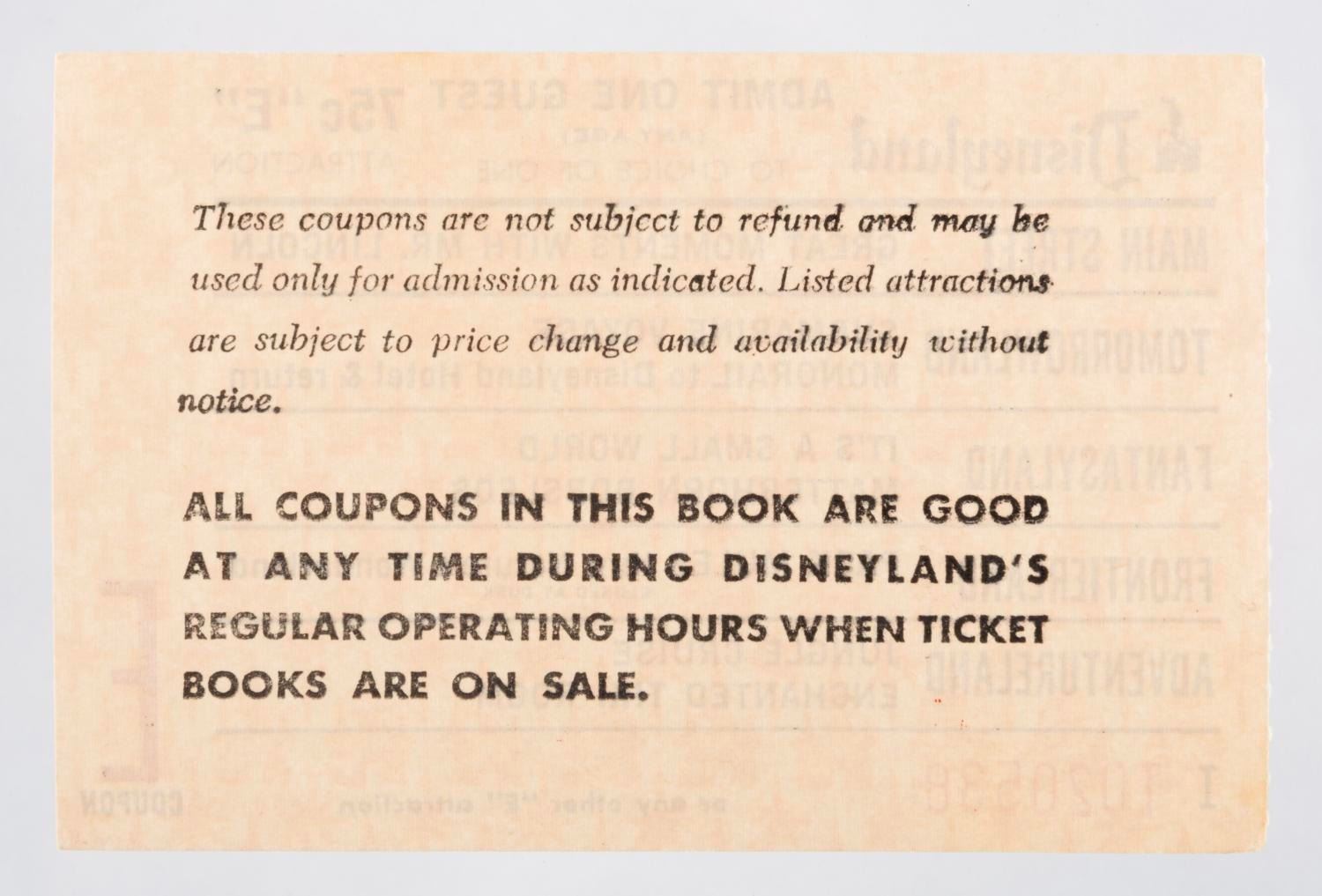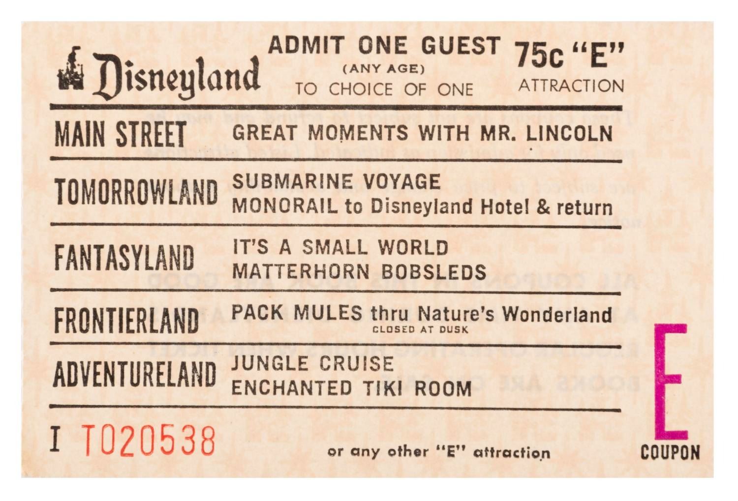 (Disneyland, 1966-67) An “Any Age” admission "E" ticket from after It’s a Small World opened in May of 1966, and before Pirates of the Caribbean opened in February of 1967. Measuring 2.5” x 3.75”, the ticket is in fine condition.