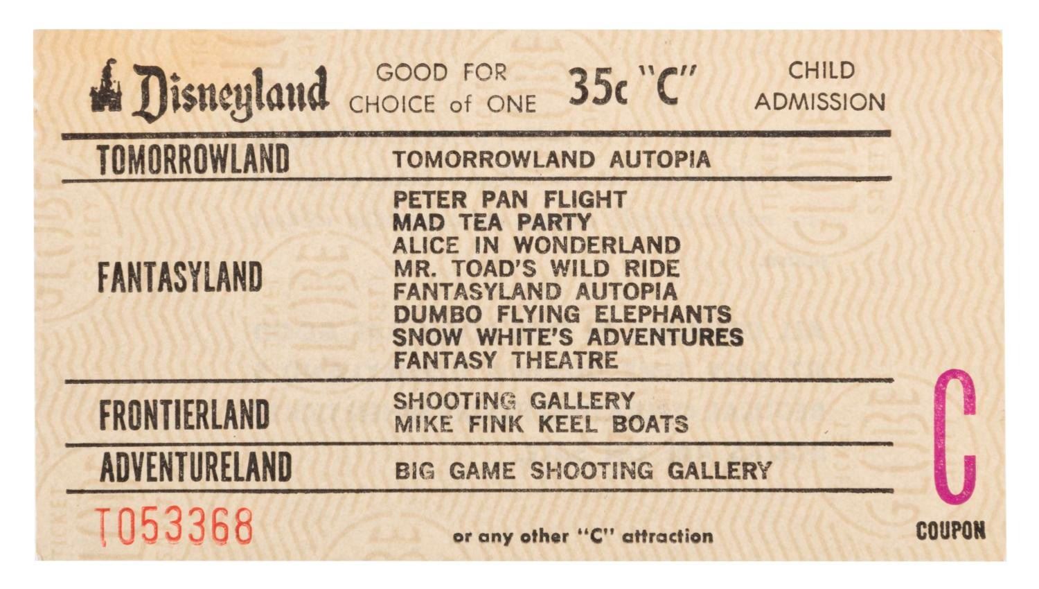 (Disneyland, 1968-70) A Child admission “C” ticket from the time Great Moments With Mr. Lincoln had a separate ticket, and before Alice in Wonderland became a “B” ticket. Measuring 2.5” x 3.75”, the ticket is in very good condition with a spot of browning to one corner of the back.
