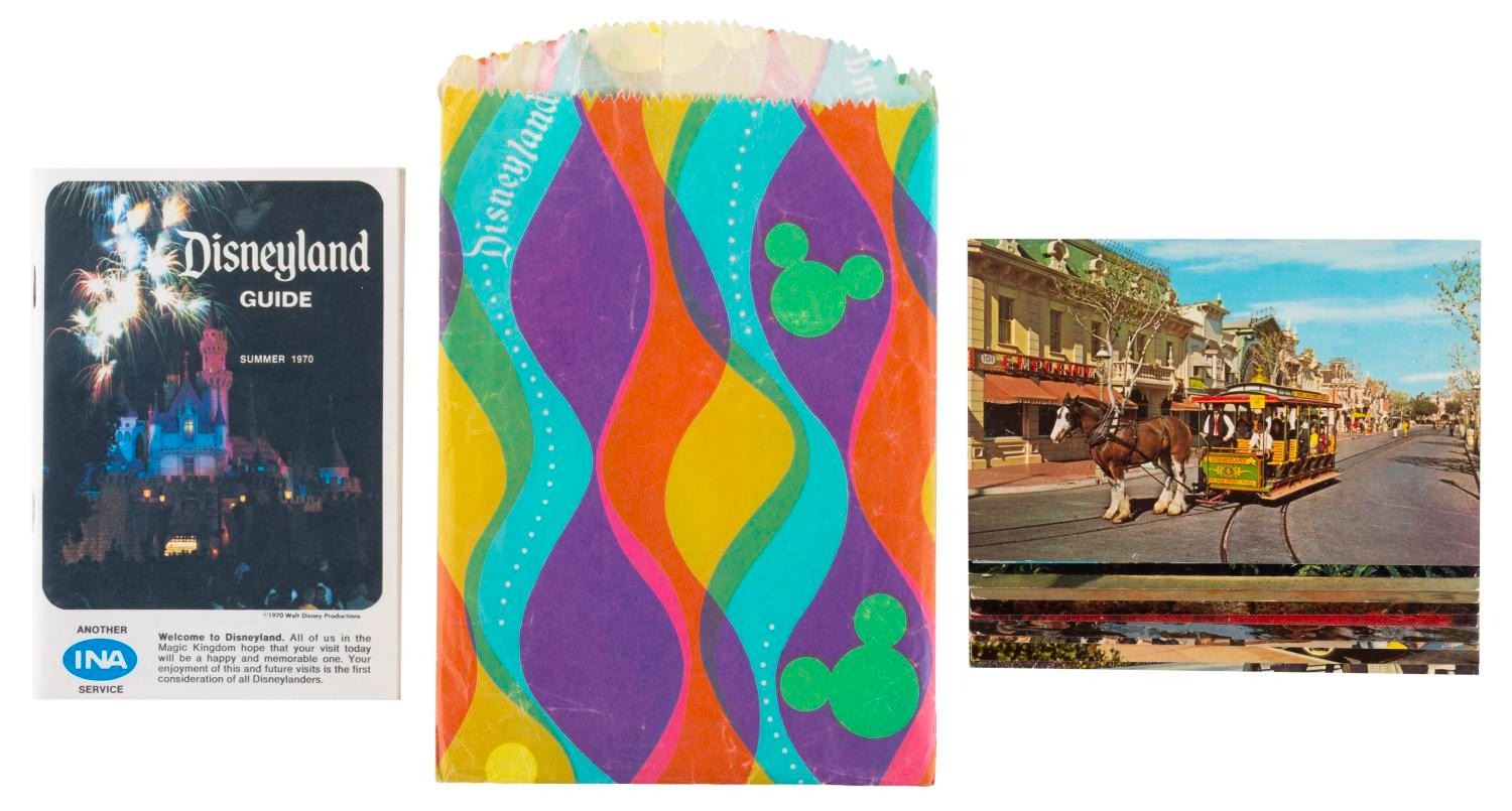 (Disneyland, 1970s) A collection of Disneyland ephemera from the 1970s including a Summer 1970 INA Guidebook, a parking stub, a gift bag, and 11 postcards featuring scenes throughout the Park including the Indian Village and the Primeval World diorama. Measuring from the 2” x 4” parking stub to the 5.5” x 8.25” paper bag, the items are in very good condition, with light handling wear to the postcards, and the bag in good condition with small creases from use.