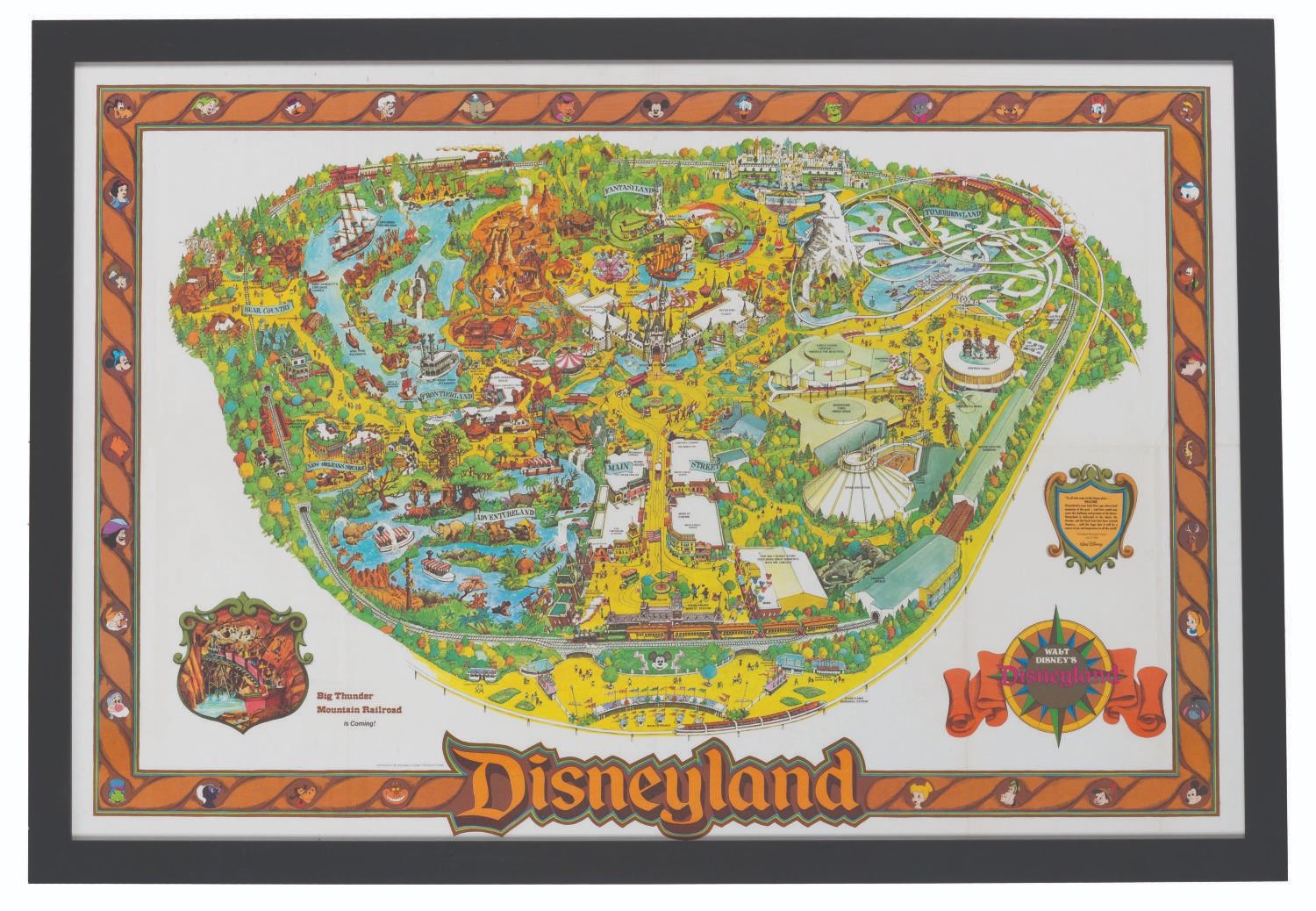 (Disneyland, 1978) A framed original Disneyland souvenir map from 1978 announcing that "Big Thunder Mountain Railroad is coming!" Measuring 30" x 45" in a 32.75" x 47.75" frame, the map displays in very good condition with wear along the folds, light discoloration from age, and creases, while the frame is in good condition with light scuffs, wear, and scratches throughout.