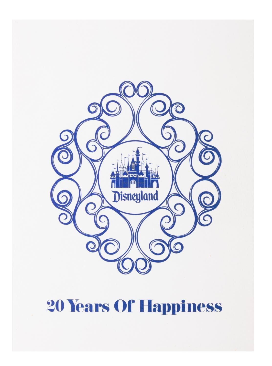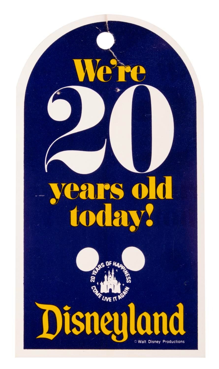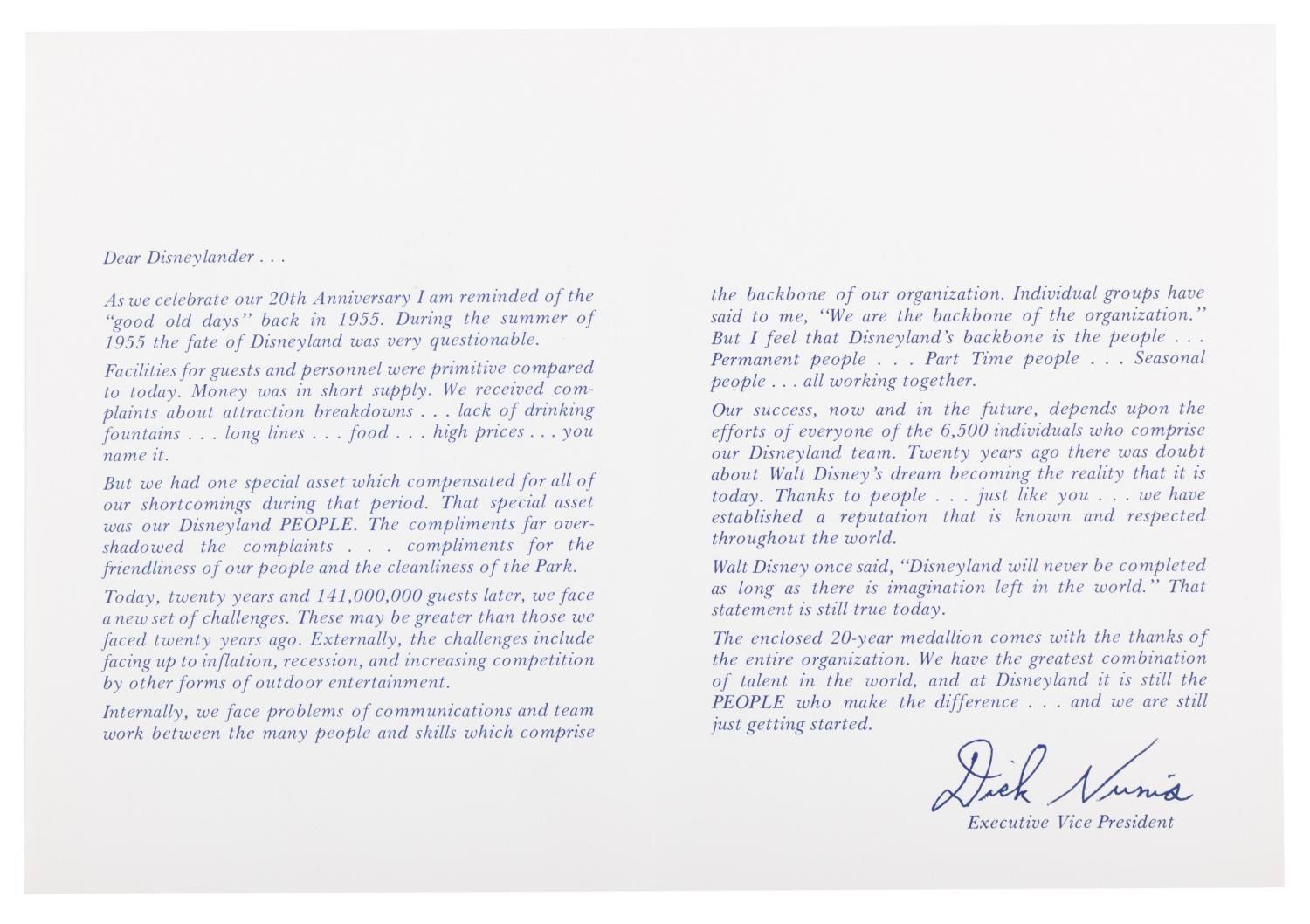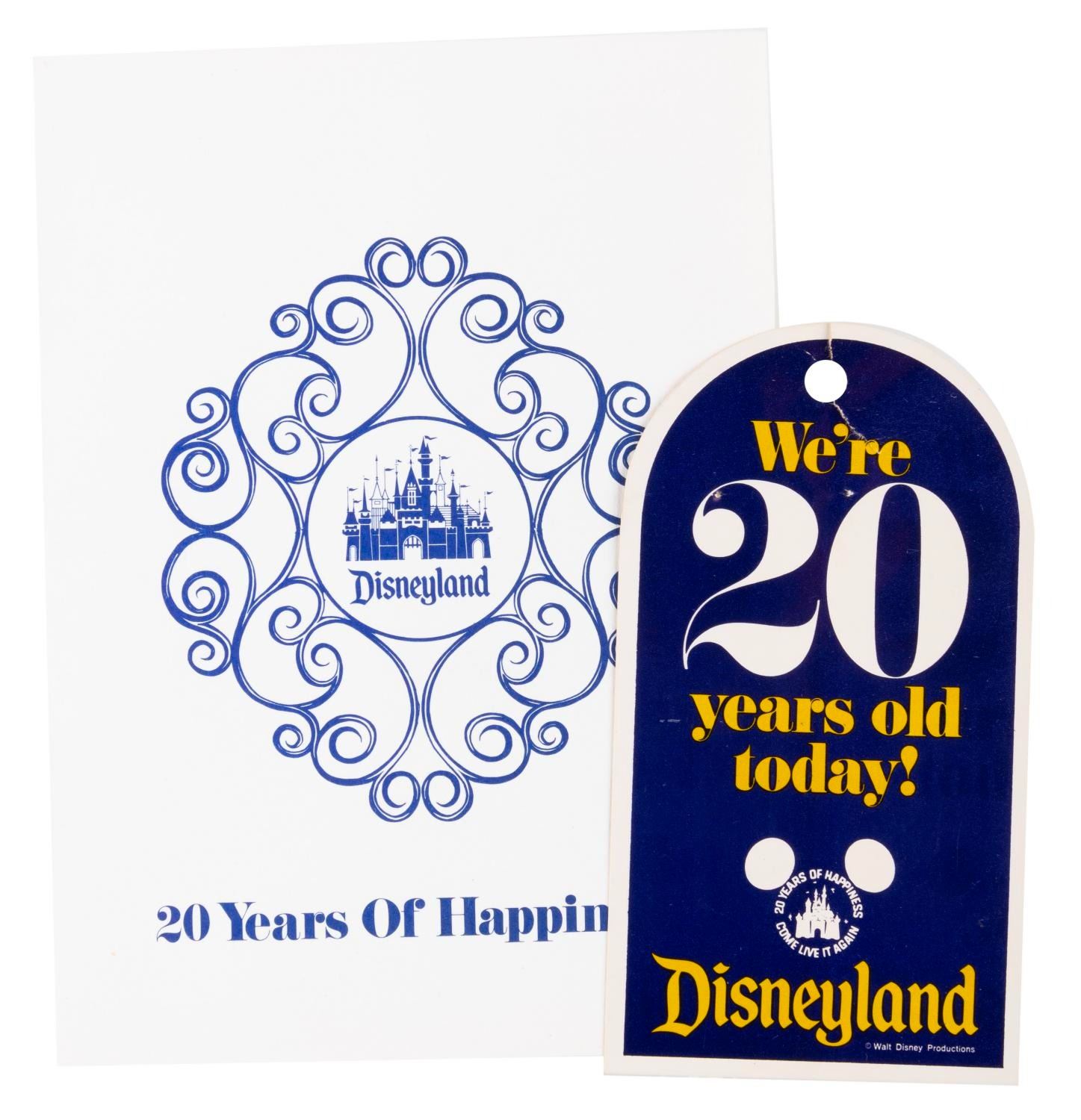 (Disneyland, 1975) A Disneyland 20 Years of Happiness hanging tag and card featuring a printed message from Disney Legend Dick Nunis. The hanging tag measures 2.75" x 5" and the card measures 5" x 6.75", in good to very good condition with handling wear, staple holes, and a 1" tear in the hanging tag.