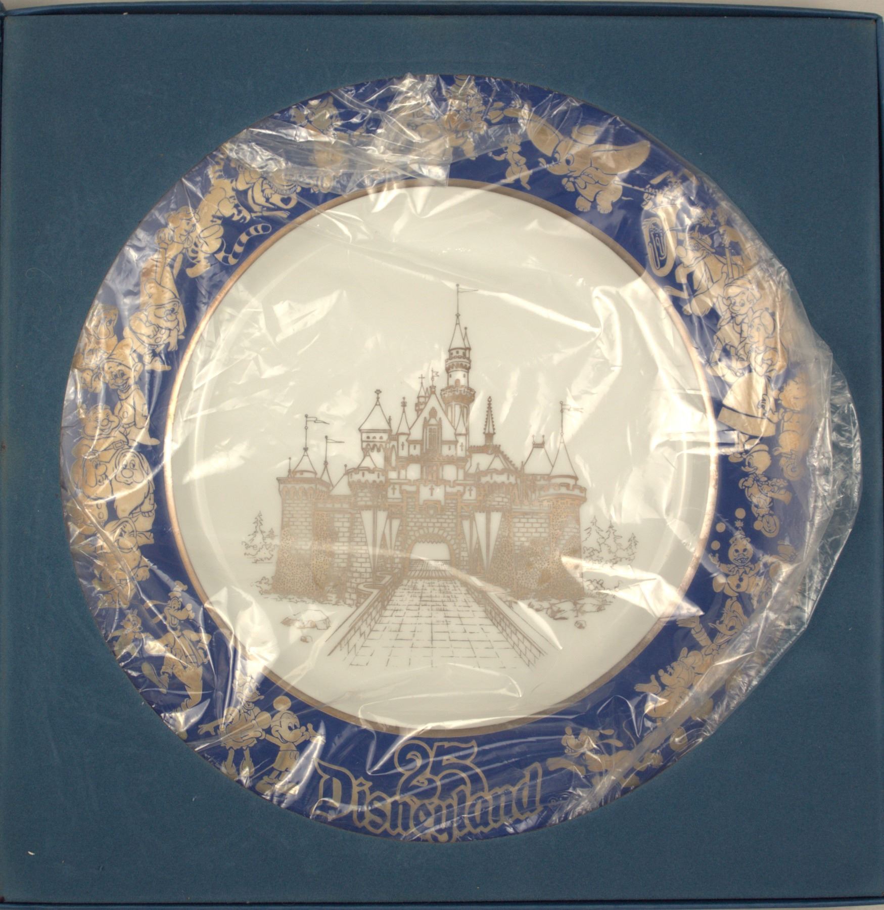 (Disneyland, 1980) A commemorative plate produced during the 25th anniversary of Disneyland. Measuring 10.75" in diameter, the plate numbered "3095" is in good condition exhibiting fading from exposure and age of materials. Includes original packaging.