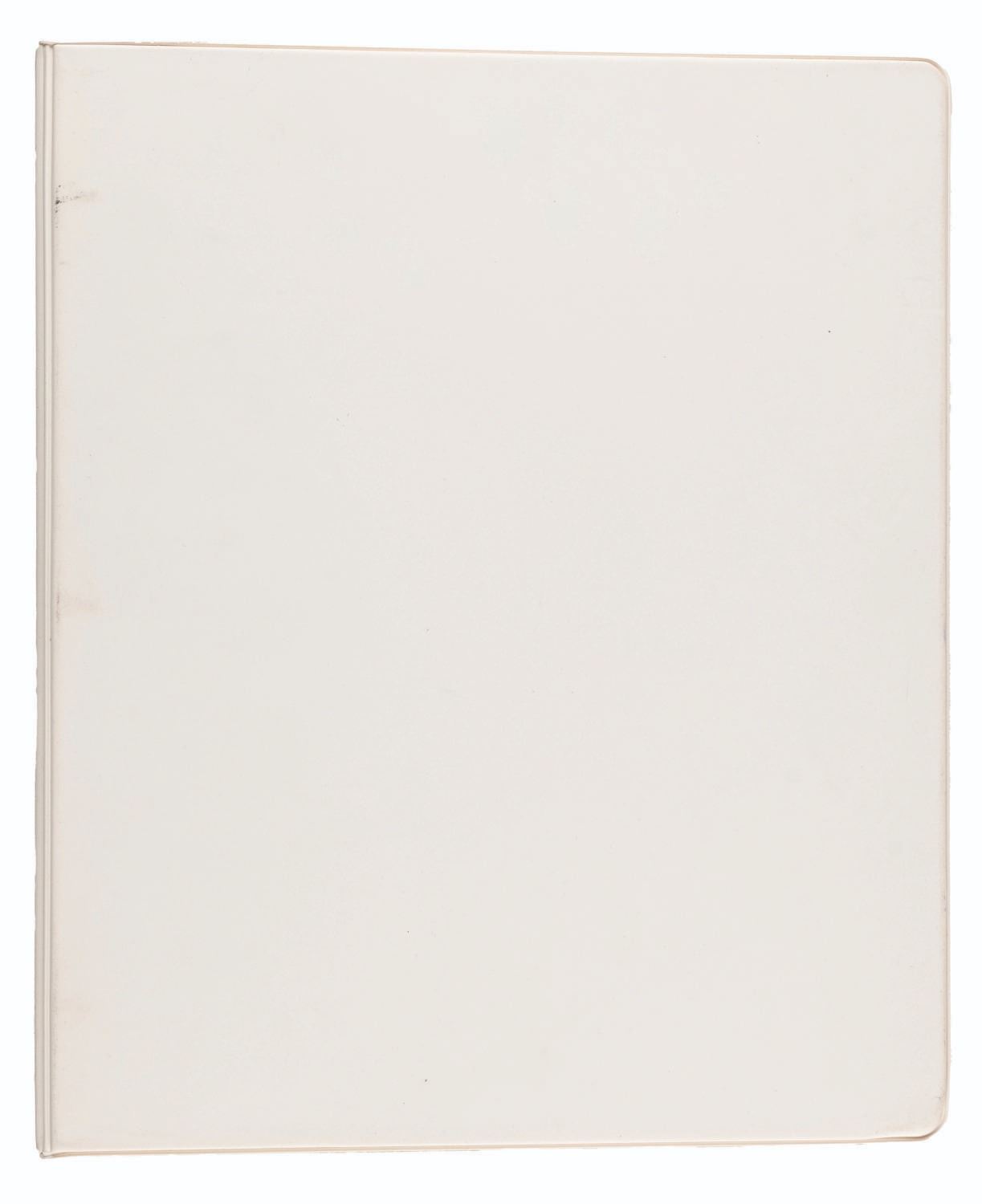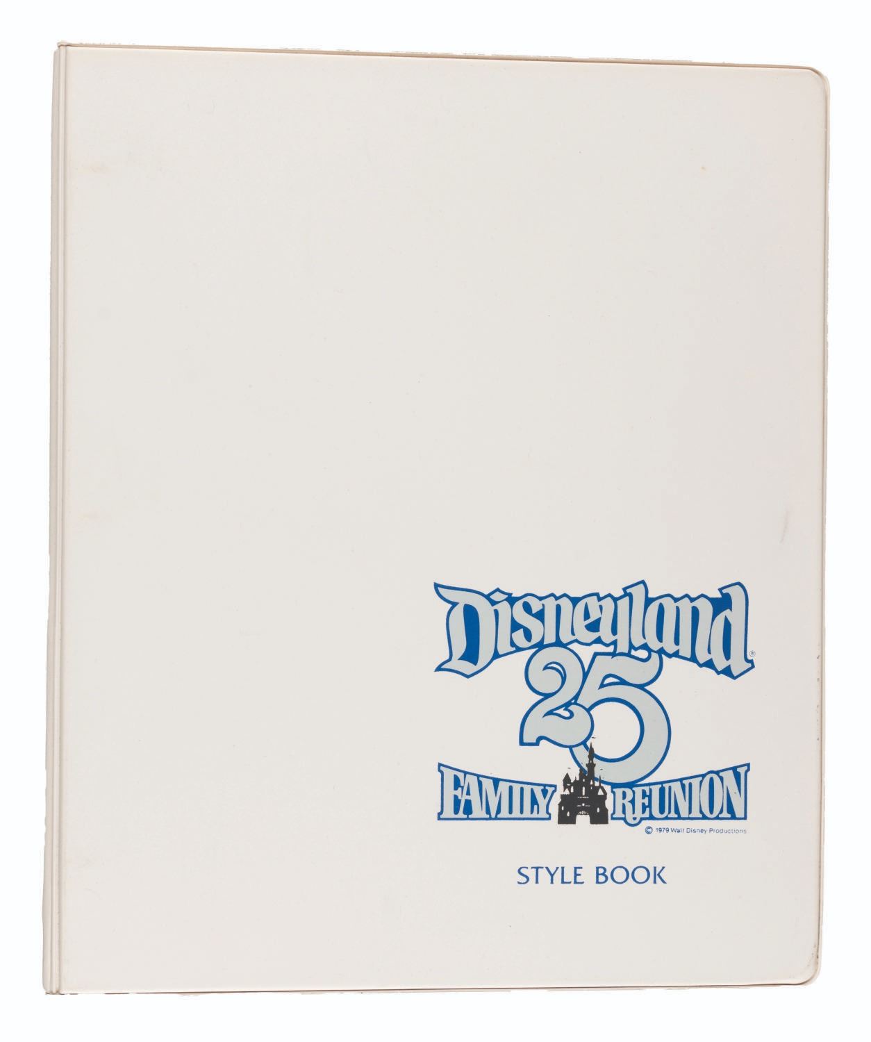 (Disneyland, 1980) An empty three-ring binder created to hold the Disneyland 25th Family Style Book, a guide to logos and branding for the Park’s anniversary celebration. Measuring 11.75" x 9.75" x 1" thick, the empty vinyl binder is in very good condition with very light wear from handling.