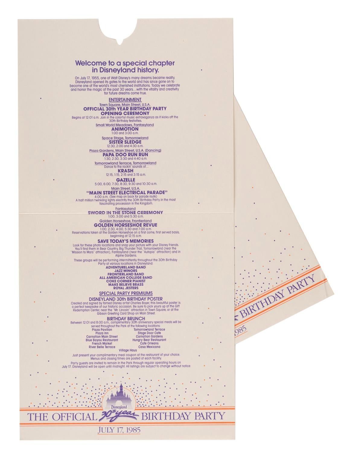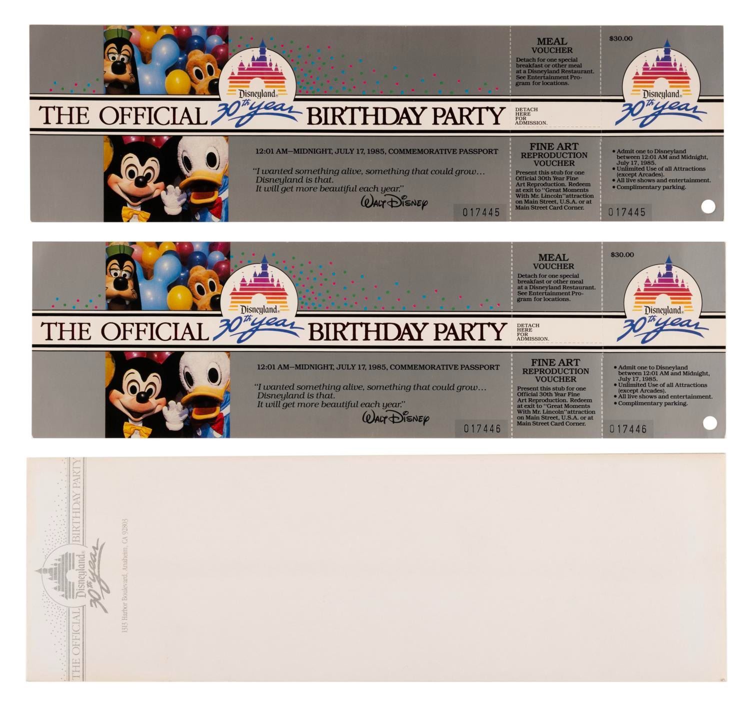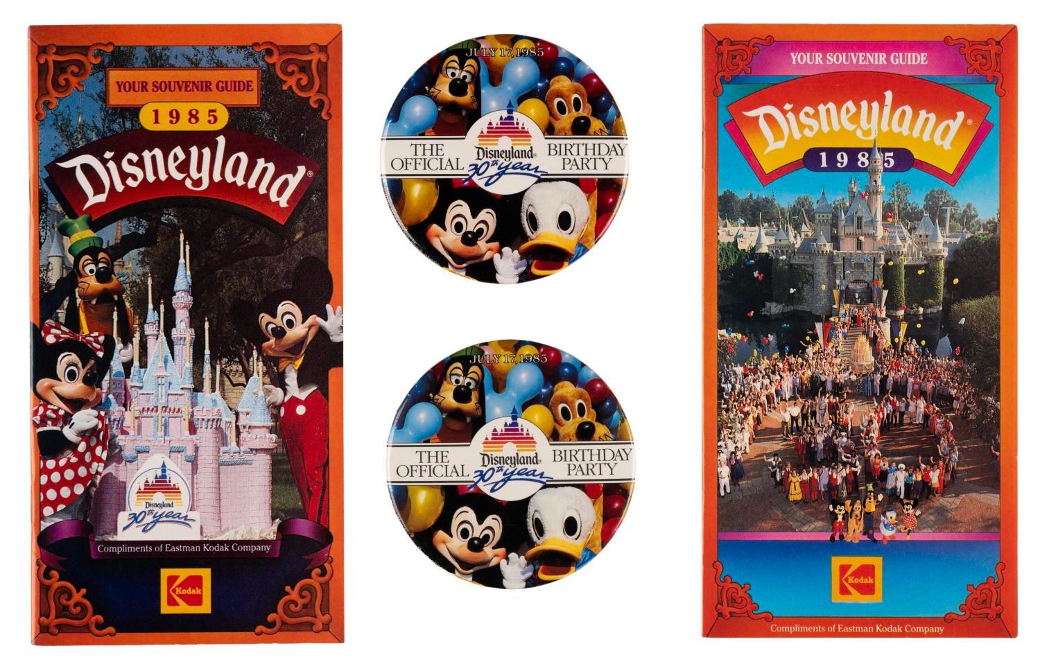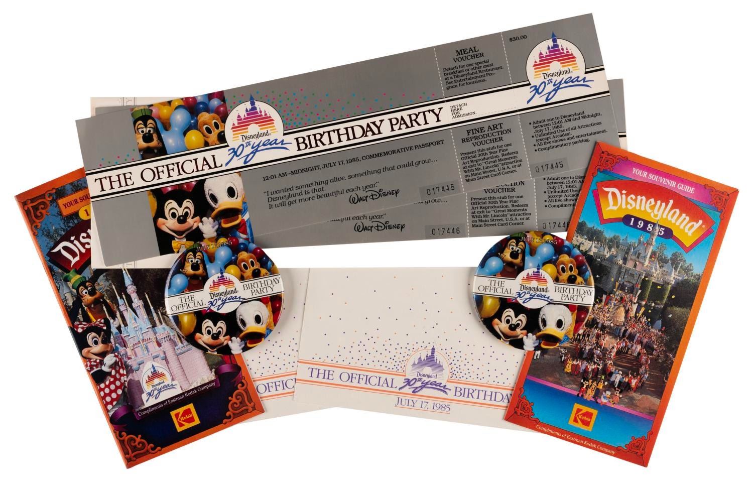 (Disneyland, 1985) A collection of memorabilia for the "30 Hour Party" held starting on Disneyland's 30th anniversary, July 17, 1985. Included are the envelope with two complete commemorative passports including an admission stub, a meal and art voucher; two programs; two souvenir guide booklets; and two buttons. Measuring from 3" in diameter up to 3.75" x 13", the souvenirs are in very good condition, with the passports hole-punched in the corner from use.