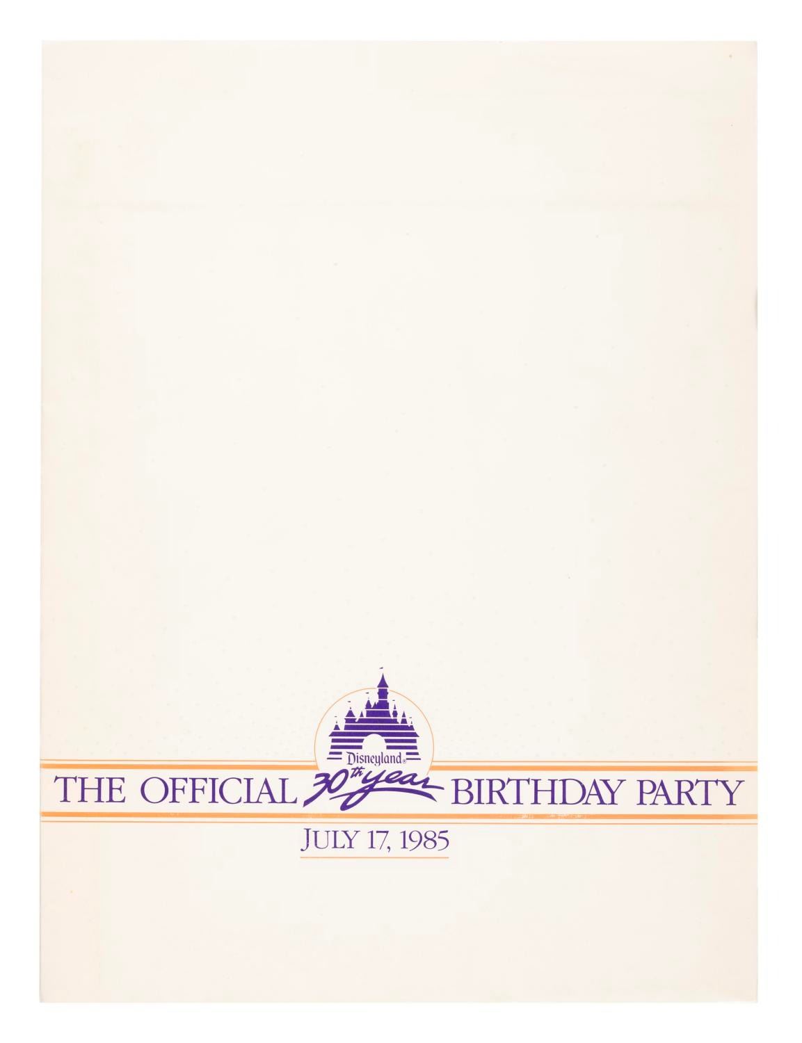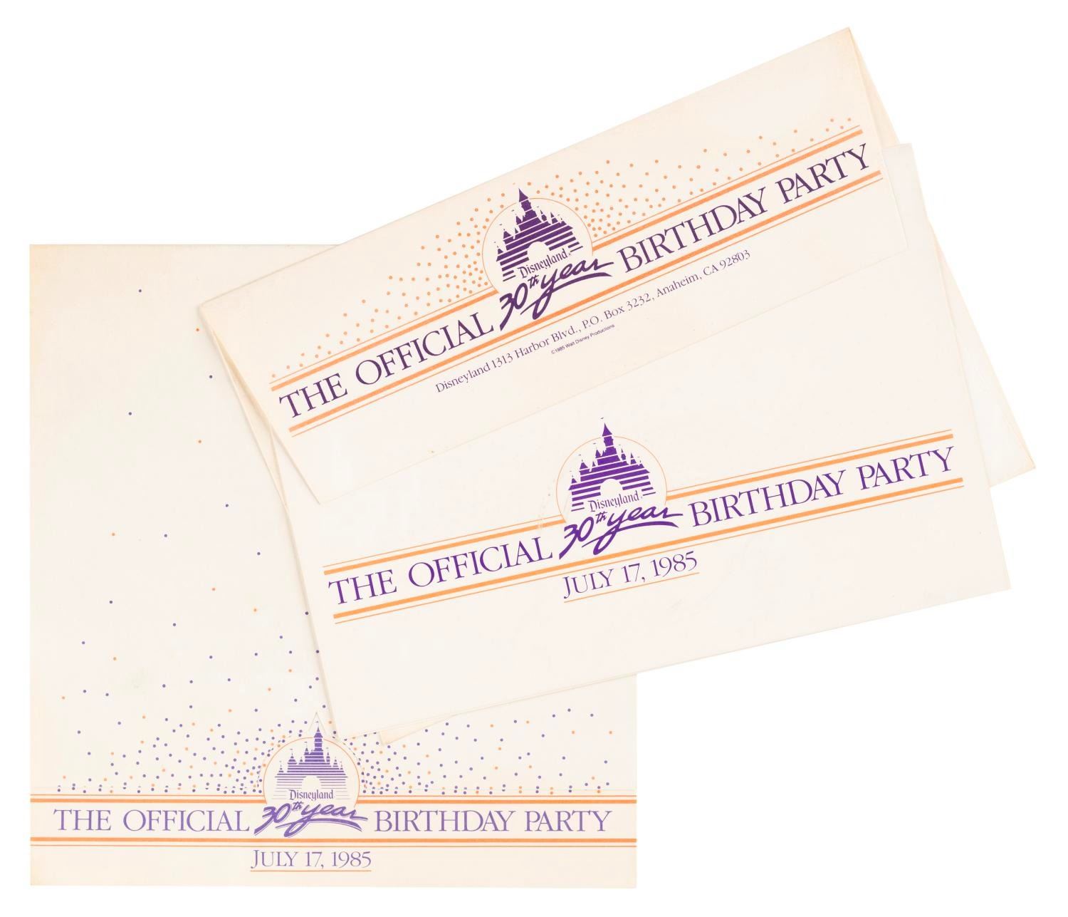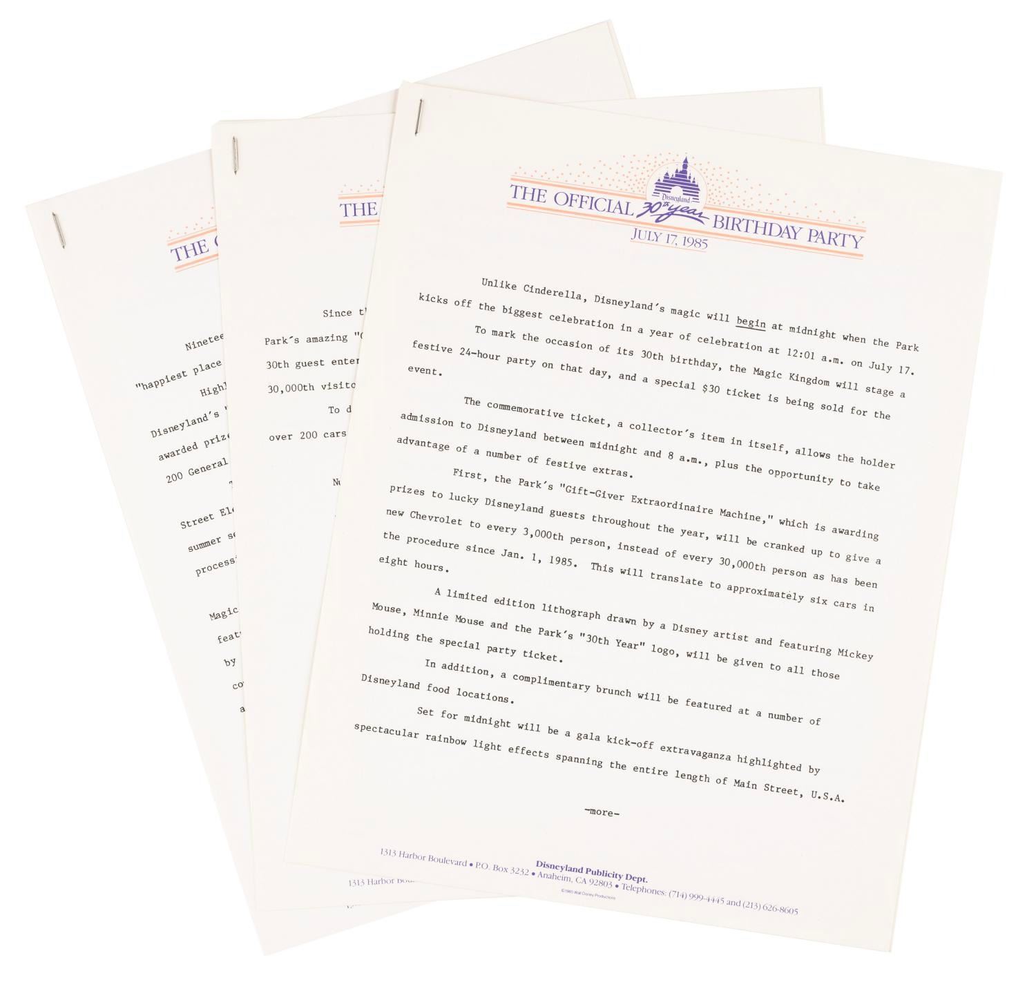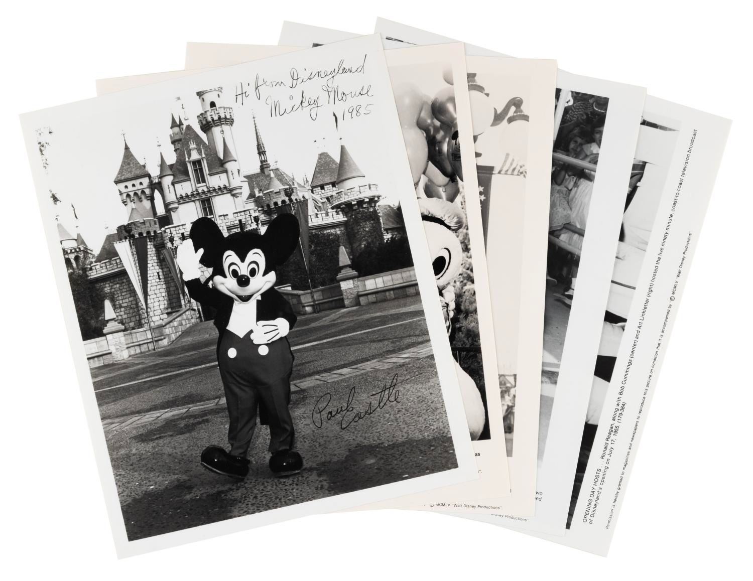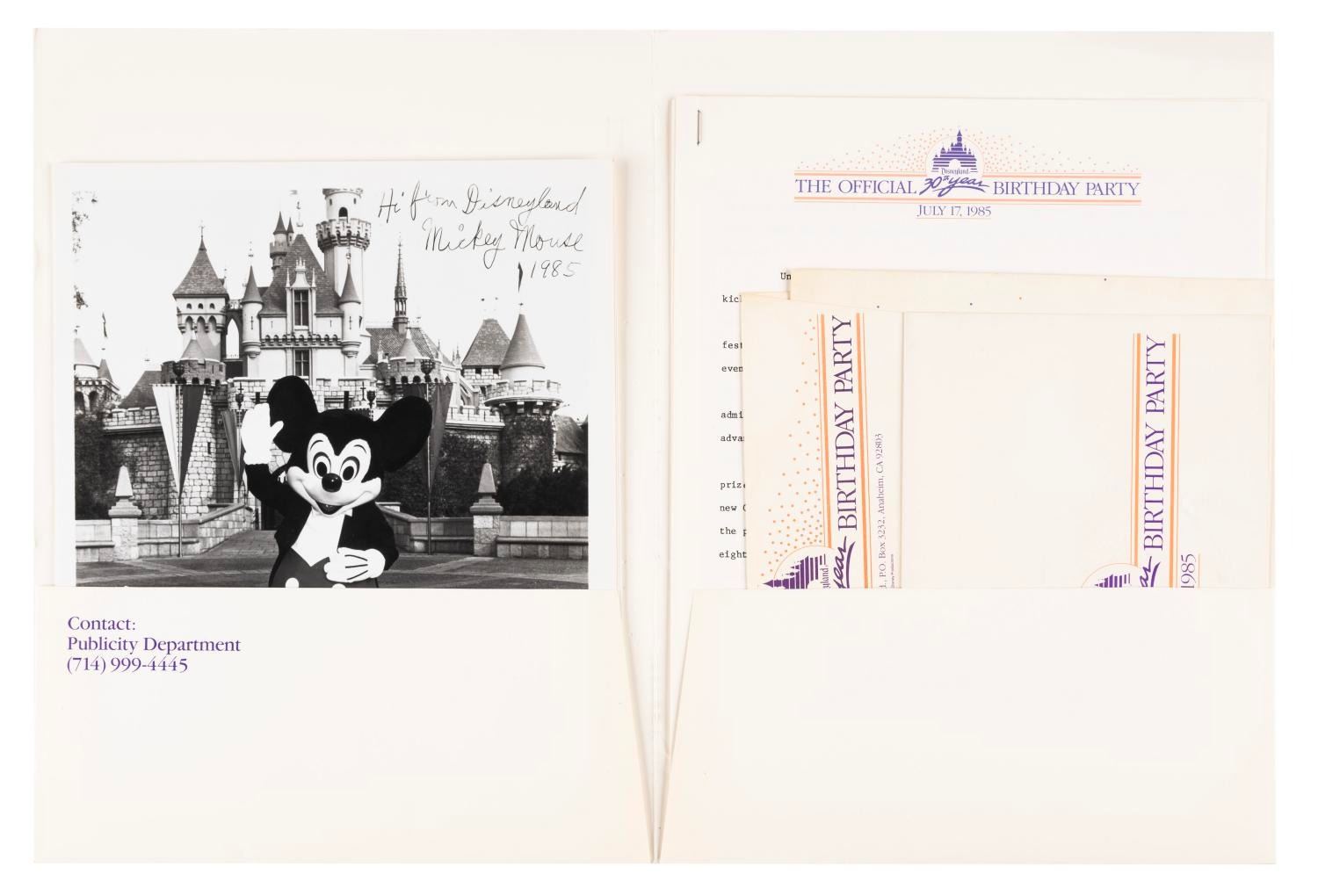 (Disneyland, 1985) A press kit from Disneyland’s 30th birthday party, which was held on July 17, 1985. Included in the folder are an invitation, an entertainment schedule, press releases, and six black and white glossy photos, including one signed in black marker by long-time Mickey Mouse costumed performer Paul Castle, Ranging in size from the 5.5” x 8” invite to the 9” x 12” folder, the items are in good to very good condition with light scratches, creases, wear, and discoloration from age.