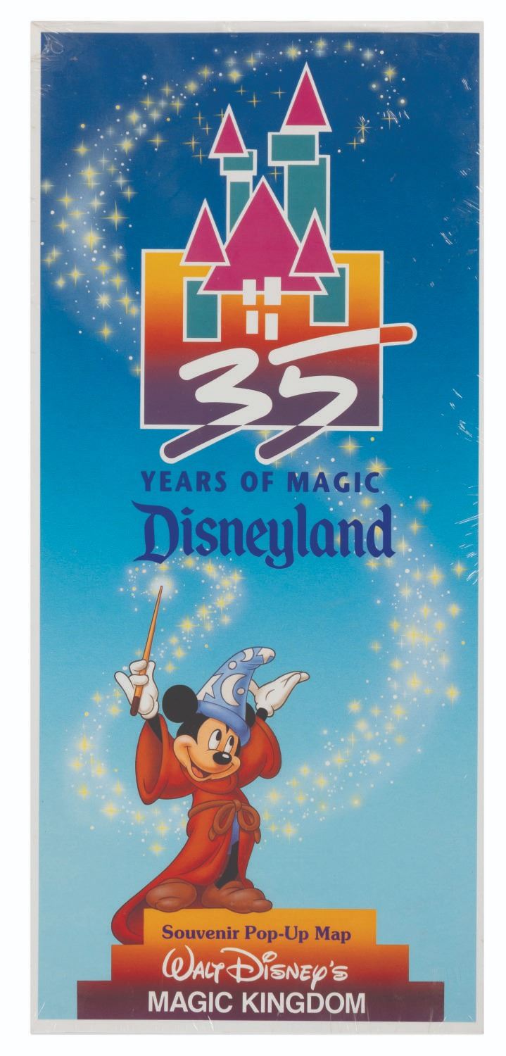 (Disneyland, 1990) A colorful double gatefold pop-up Park map created for Disneyland's 35th anniversary featuring beloved attractions and Disney characters. Measuring 8.25” x 18”, 18” x 25.75” x 7.75” tall when opened, the map displays in very good condition with light scratches and creases.