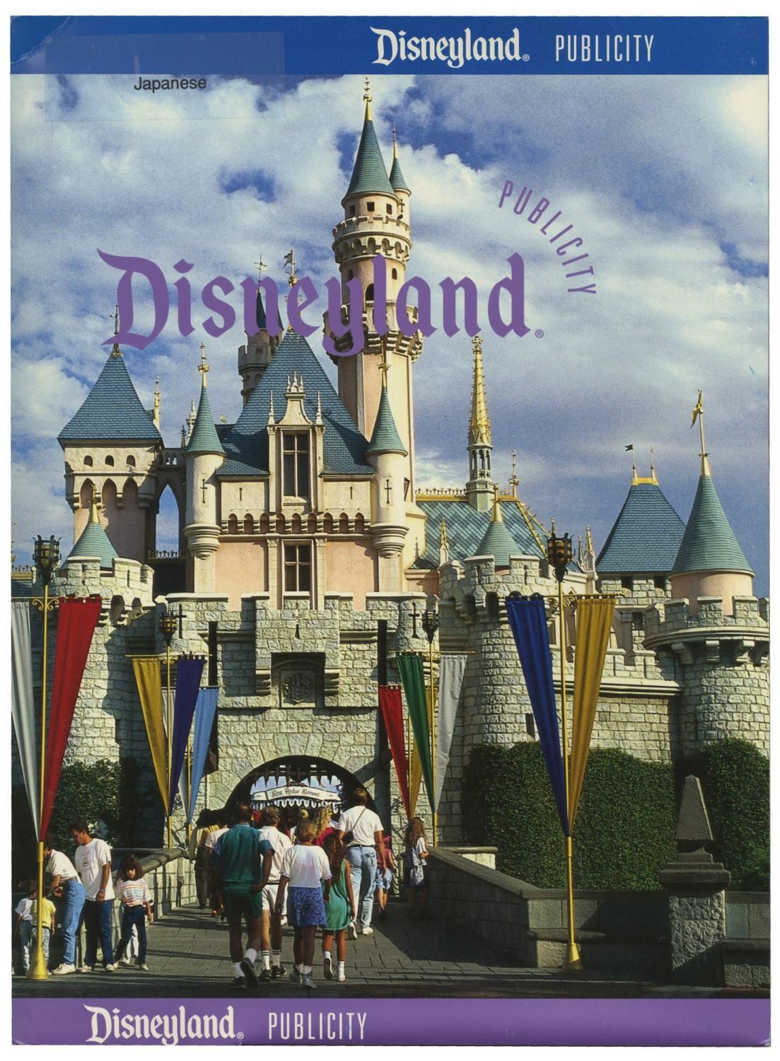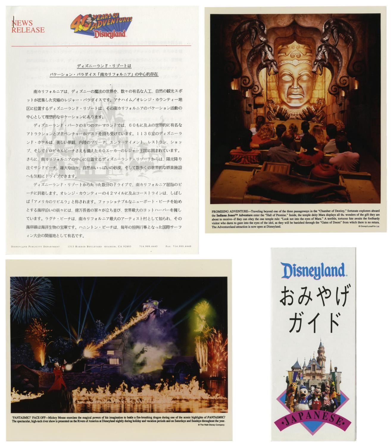 (Disneyland, 1995) A rare Disneyland publicity packet written in Japanese for the 40th anniversary celebration of the Park, and the grand opening of the Indiana Jones Adventure attraction at Disneyland. The outer folder features an image of Sleeping Beauty Castle and contains: six color photos with English captions on the front and in Japanese on the reverse, nine publicity documents written in Japanese, and one Disneyland fold-out brochure map written in Japanese. The outer folder measures 12" x 9" and the packet is in very good condition with very light handling wear.