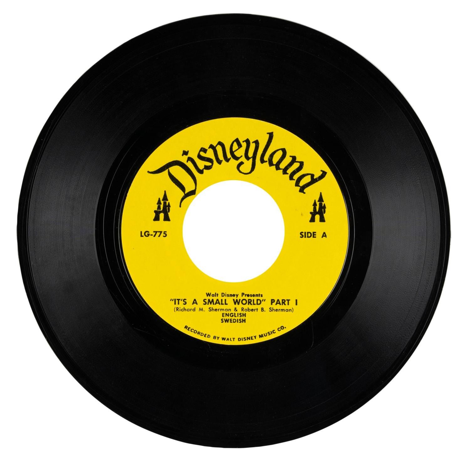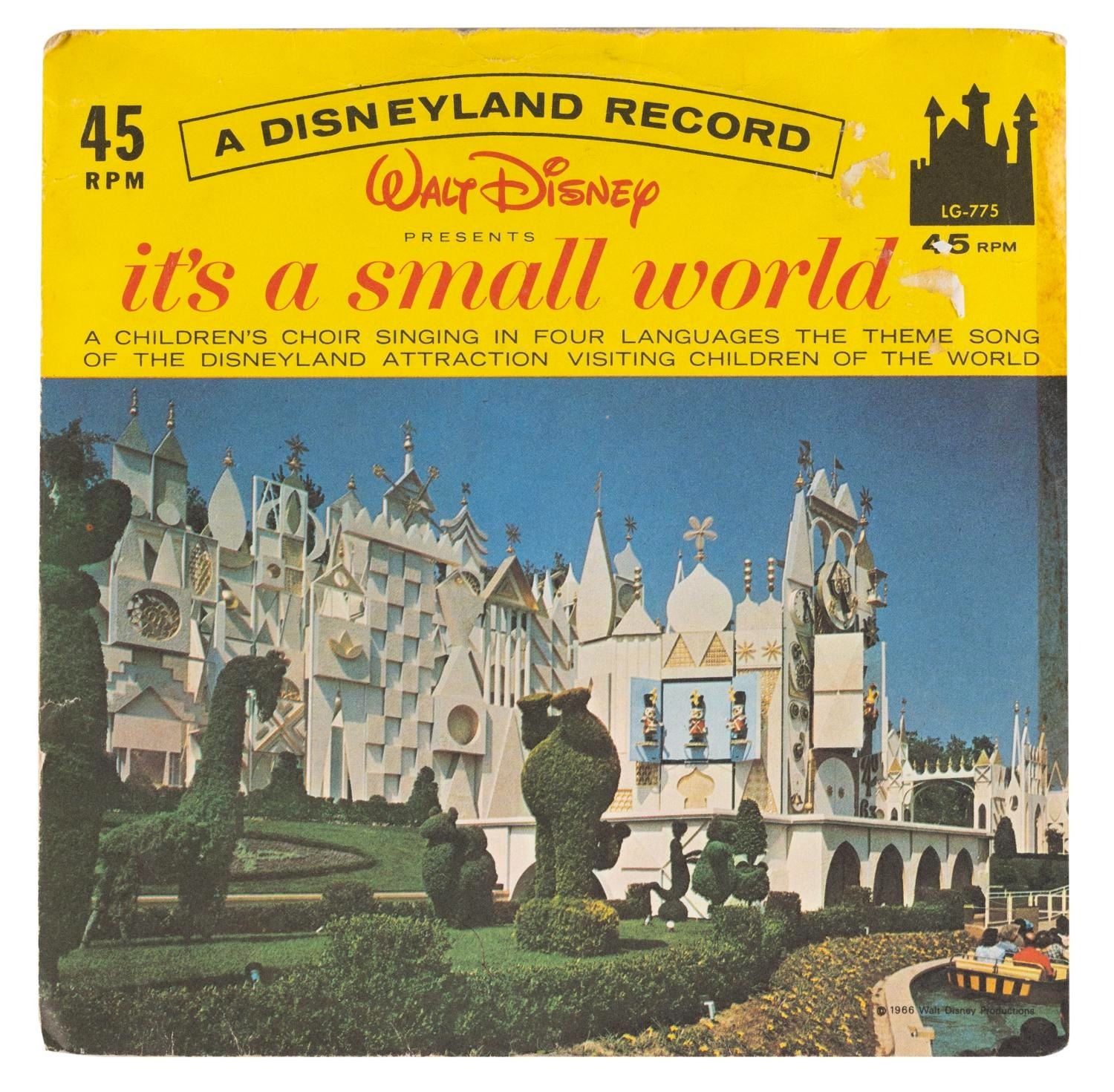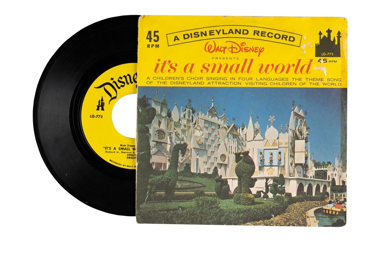 (Disneyland Records, 1966) A souvenir 45 RPM record of It's a Small World from Disneyland, with music written by Richard and Robert Sherman. The record is in good condition with light scratches, and the sleeve displays in fair condition with tape residue, edge wear, split edges, scuffs, and price sticker residue.