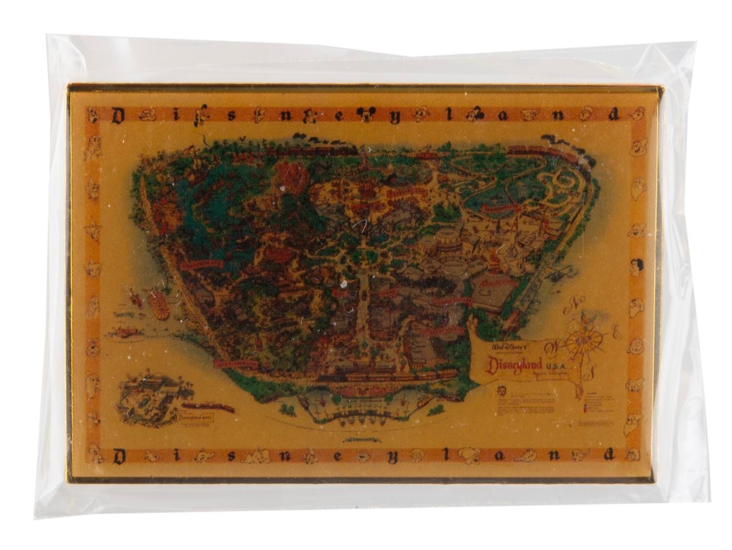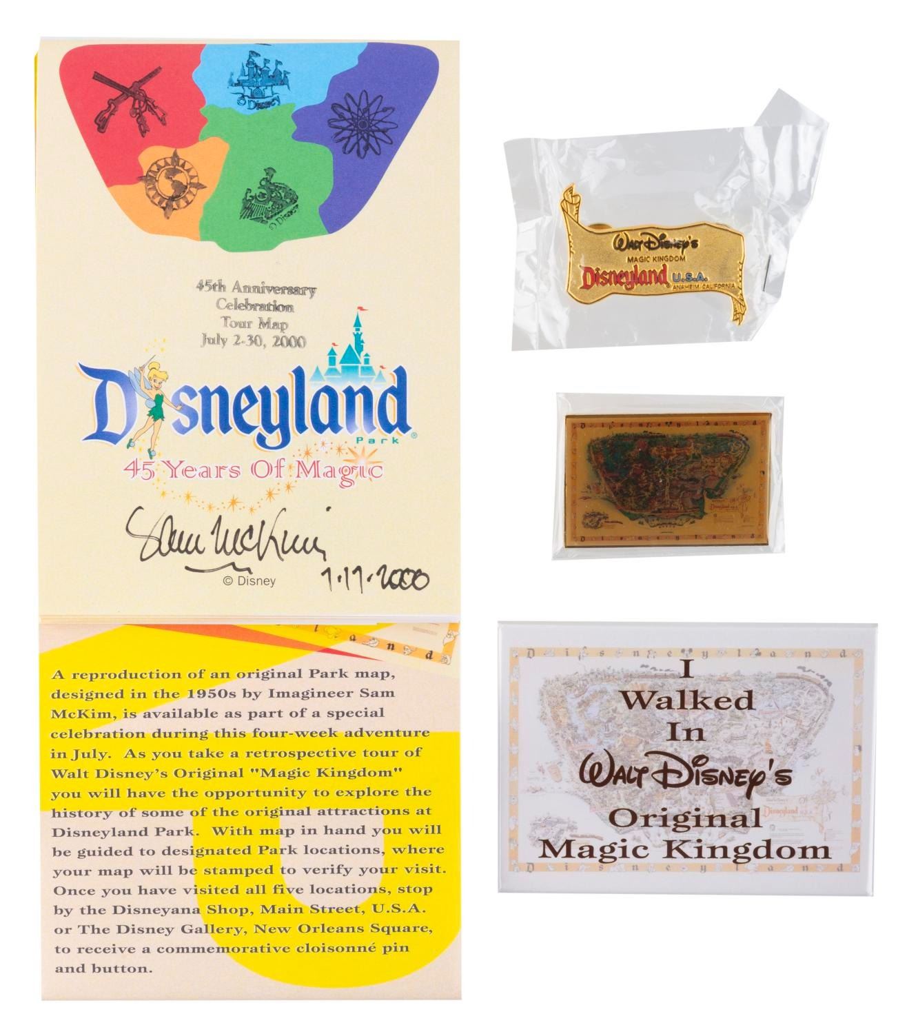 (Disneyland, 2000) A Disneyland 45th anniversary celebration tour map signed by Disney Legend Sam McKim, two pins inspired by McKim’s 1958 Park map, and a "I Walked in Walt Disney’s Original Magic Kingdom” button. These items were available in the Park for a very limited amount of time. Ranging in size from a 1.75” x 1.75” pin to the 24” x 40” map, the souvenirs are in good to very good condition with light scratches, wear, and yellowing on the map replica pin.