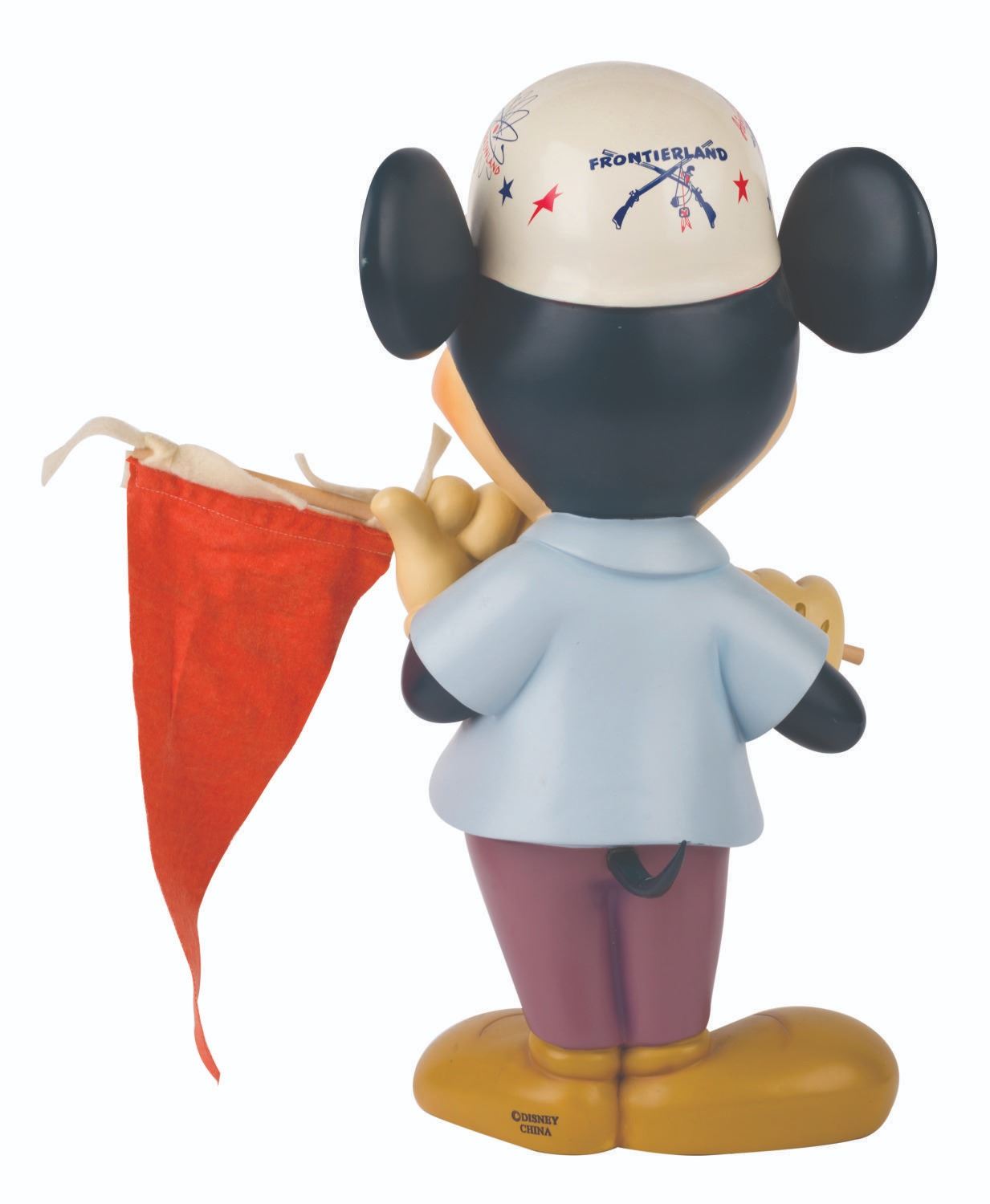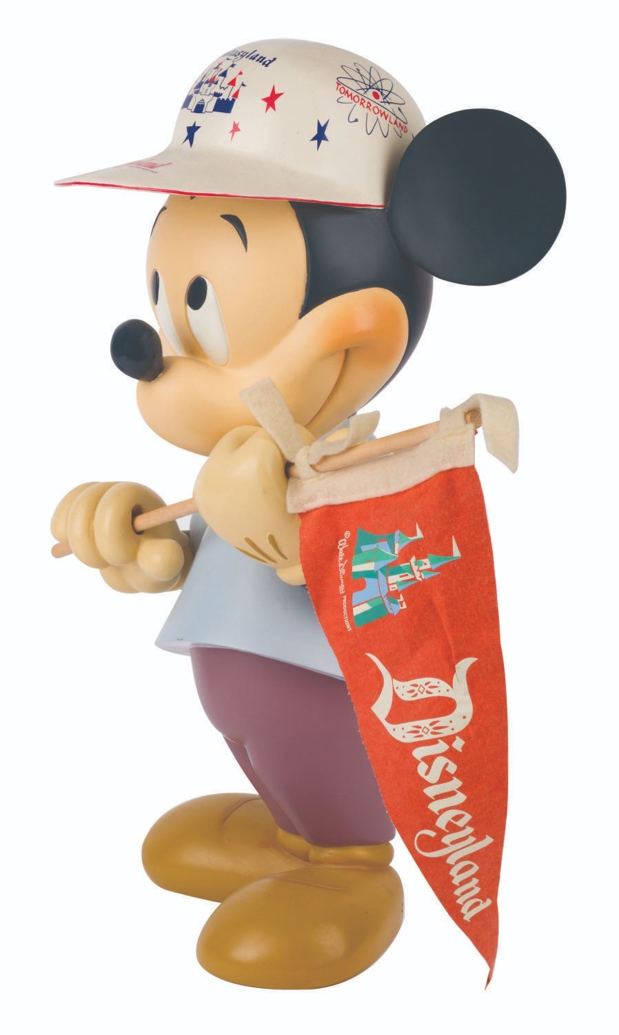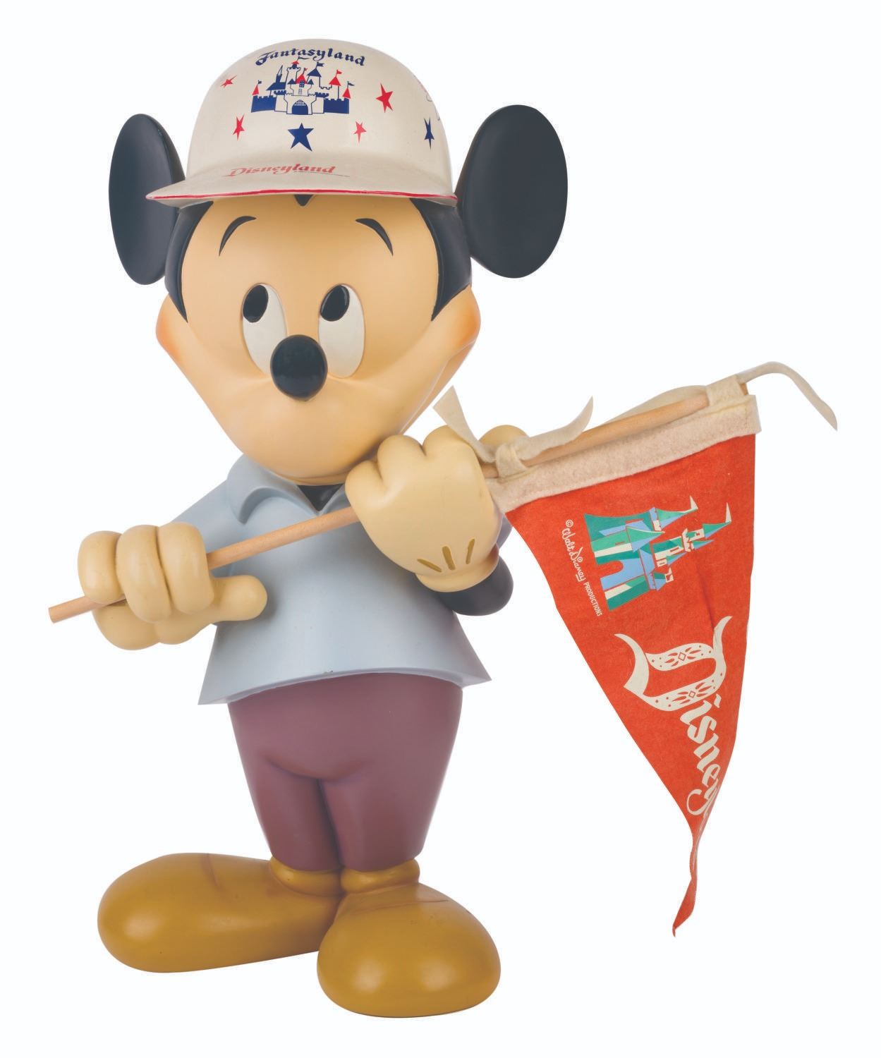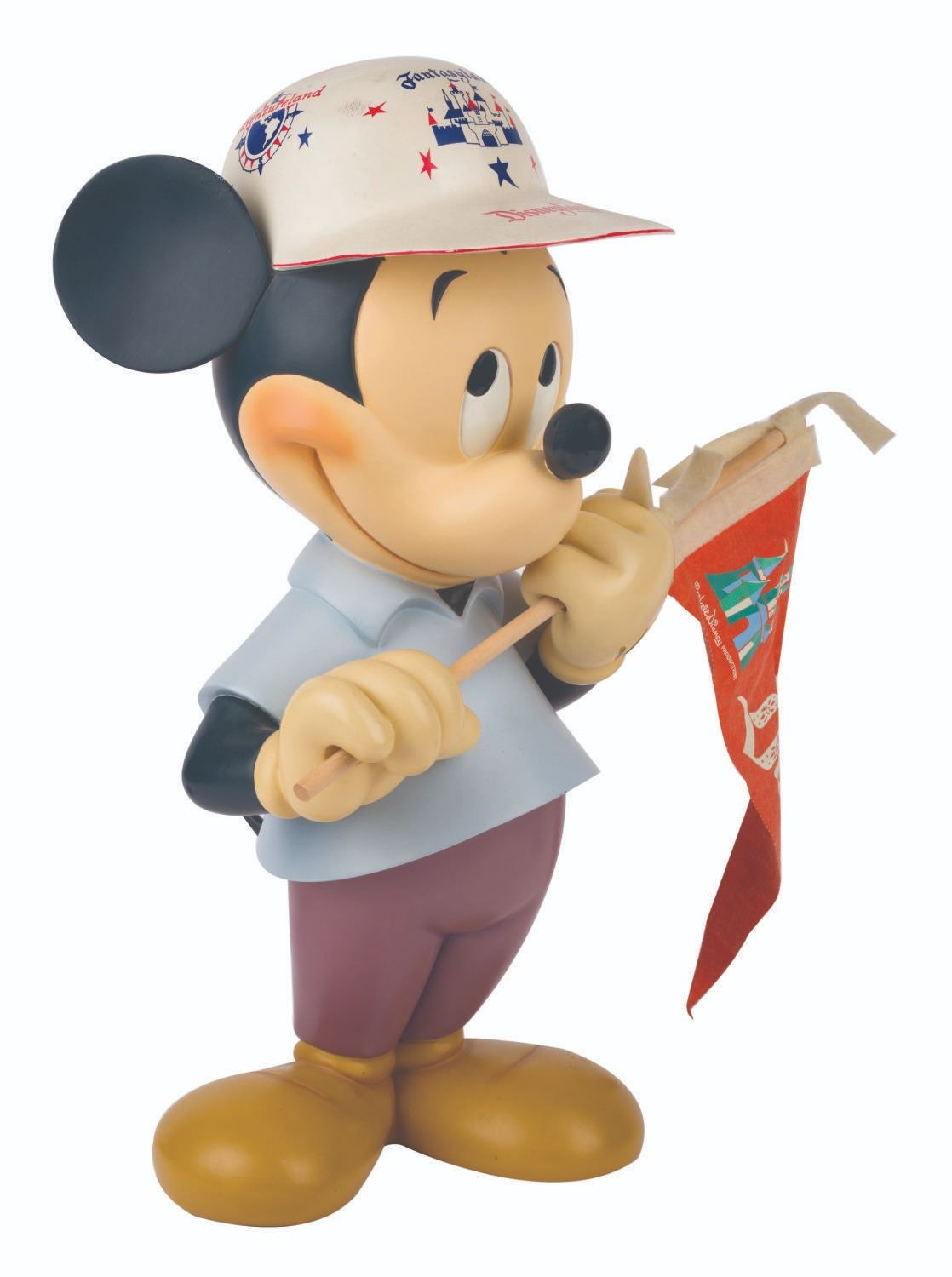 (Disneyland, 2005) A Mickey Mouse at Disneyland Big Fig, released for the 50th anniversary of the Park. Mickey is depicted wearing a vintage souvenir Keppy Kap and holding a Disneyland pennant. Measuring 13” wide and 17” tall, the Big Fig displays in good condition with light stains, scratches, a 0.5” crack on the cheek, creases on the flag, a piece of the tail missing, scuffs most notably on the Keppy Kap, and missing its base.