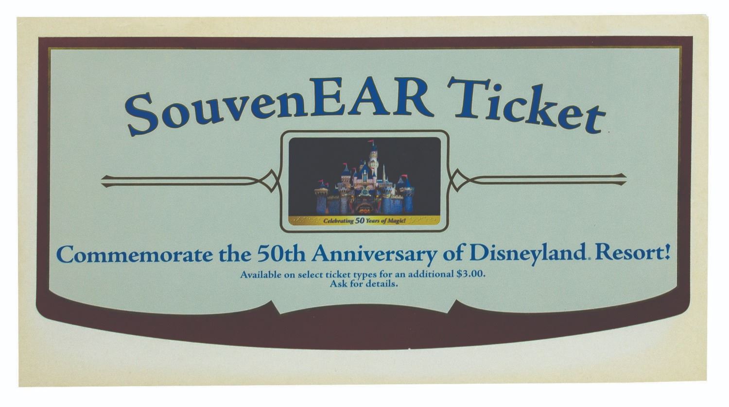 (Disneyland, 2005) A ticket window decal used during the 50th anniversary celebration at Disneyland. The decal informs Guests that they can get a “SouvenEAR Ticket” to commemorate the landmark anniversary for an extra $3 with their ticket. The decal has an eye-catching metallic finish and is unused on its original backing. Measuring 7.5” x 14.5” on its 8.75” x 15.5” backing, the decal is in very good condition with minor surface wear.