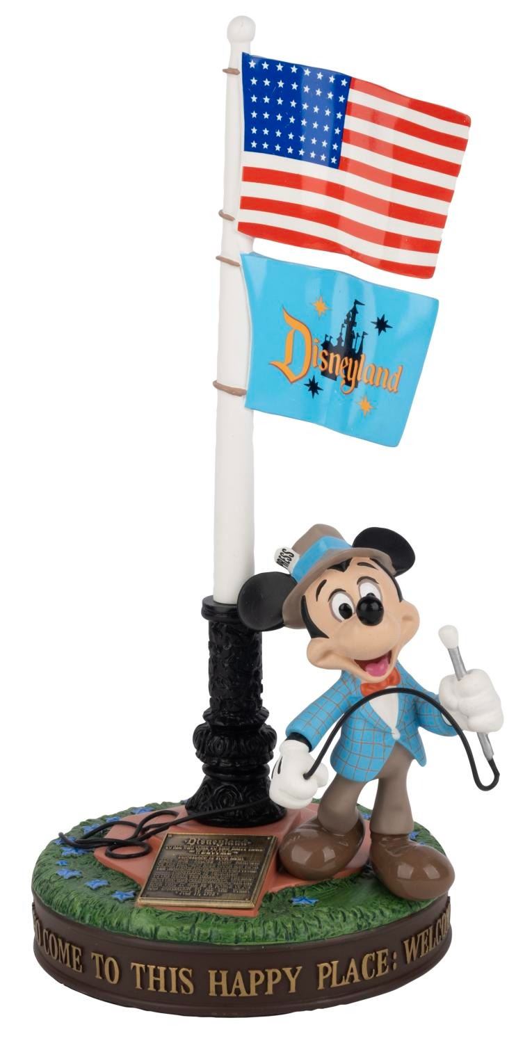 (Disneyland, 2010) A figurine commemorating Disneyland's 55th anniversary, featuring Mickey Mouse as a reporter at the Park's opening day ceremonies. Included with the figurine are a miniature metal replica of the Official Disneyland dedication plaque which is displayed beneath the flagpole, and a drawer that pulls out of the back of the figure's base, containing an enamel pin replicating the figure. Measuring 6.5" x 6.5" and 13.5" tall, the figurine and pin are in fine condition with light wear from prior display.